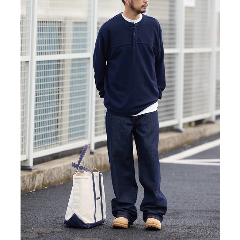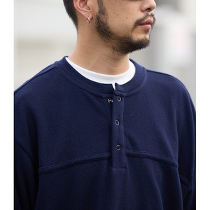 シンプルなデザインに胸元の切り替えとヘンリーネックボタンがアクセントになったロングスリーブコットンニット。 ゆとりのあるシルエットで、リラックス感のある着こなしが叶います。 1枚で着るのはもちろん、インナーに白Tシャツをレイヤードしたスタイルもおすすめです。 落ち着いたネイビーのカラーが、カジュアルな中にも大人っぽさをプラスしてくれるアイテムです。 ■ color ネイビー ■ material コットン ナイロン ■ size S / M / L / XL S :肩幅49cm 袖丈53cm 胸囲114cm 着丈66cm M :肩幅51cm 袖丈53.5cm 胸囲118cm 着丈68cm L :肩幅53cm 袖丈54cm 胸囲122cm 着丈70cm XL :肩幅55cm 袖丈54.5cm 胸囲126cm 着丈72cm ※採寸方法により多少の誤差がある場合がございます ■モデル身長:175cm ■着用サイズ : L [ 商品管理番号:a-1171] 【お買い物にあたっての注意事項】 ご購入前にこちらをご覧ください。 https://store.path-online.shop/about ▶<PATH>TOP PAGEから、新商品やお得な情報をチェック! https://store.path-online.shop/ ▶【Instagram】公式インスタグラムページはこちら。 https://www.instagram.com/path_official_jp/