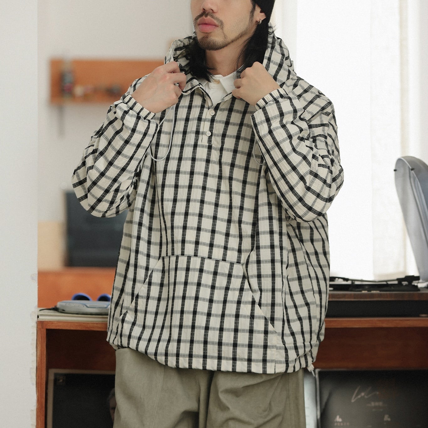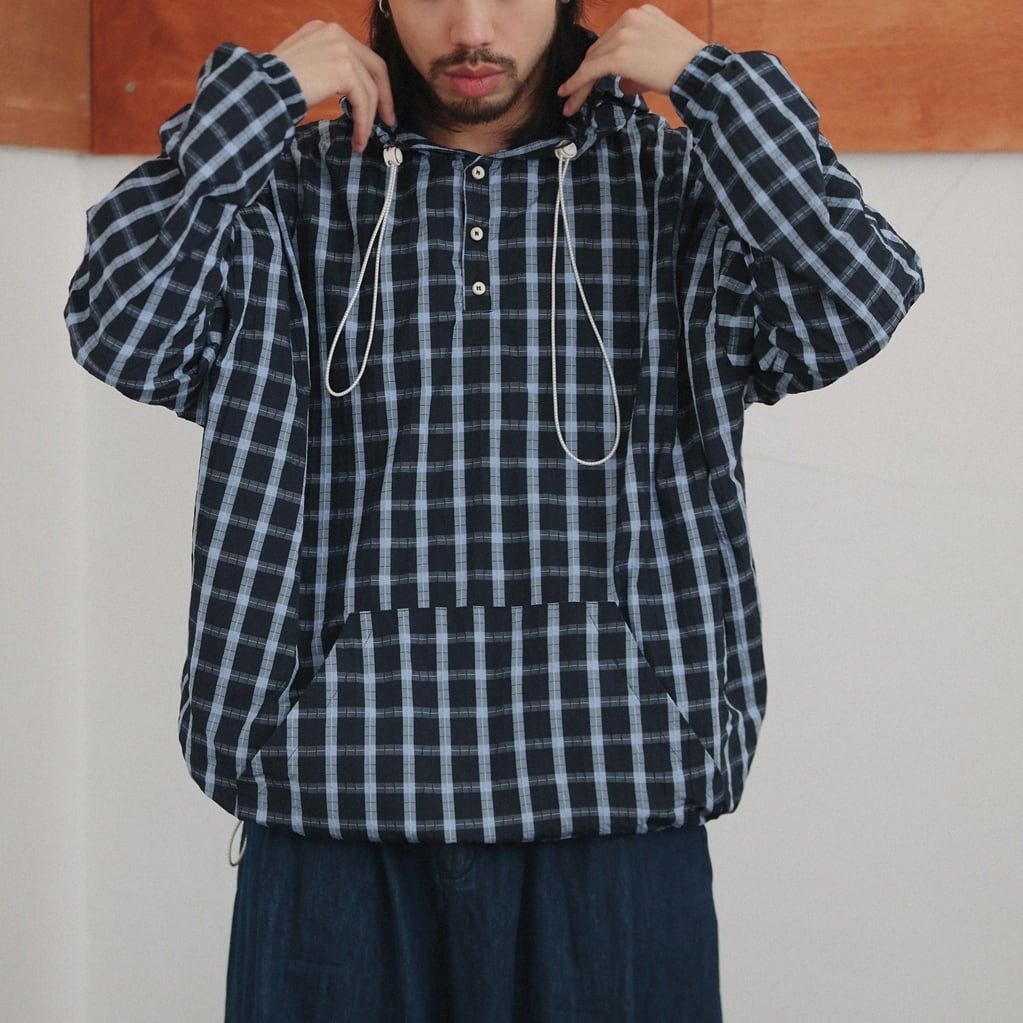 クラシックなチェック柄に遊び心を加えたプルオーバーフーディー。