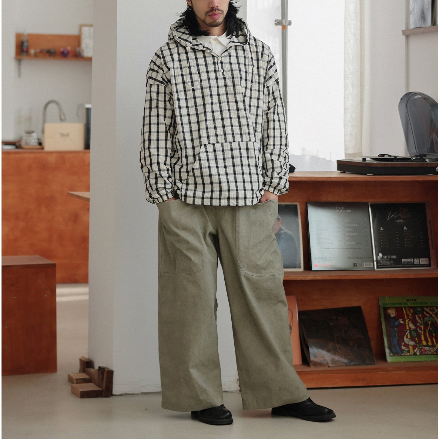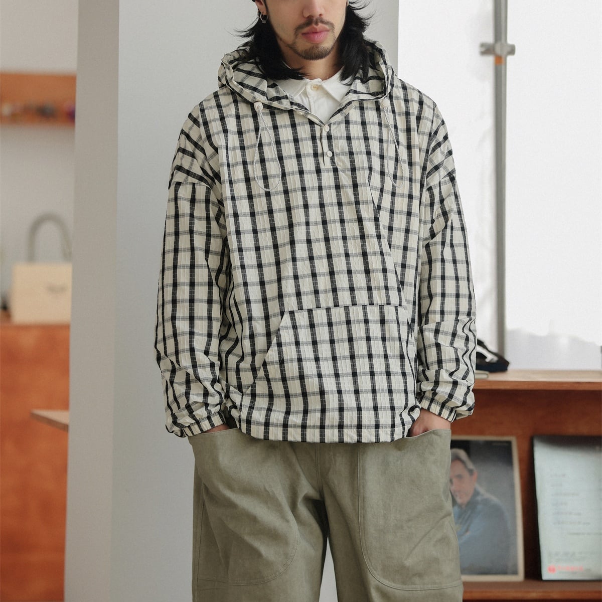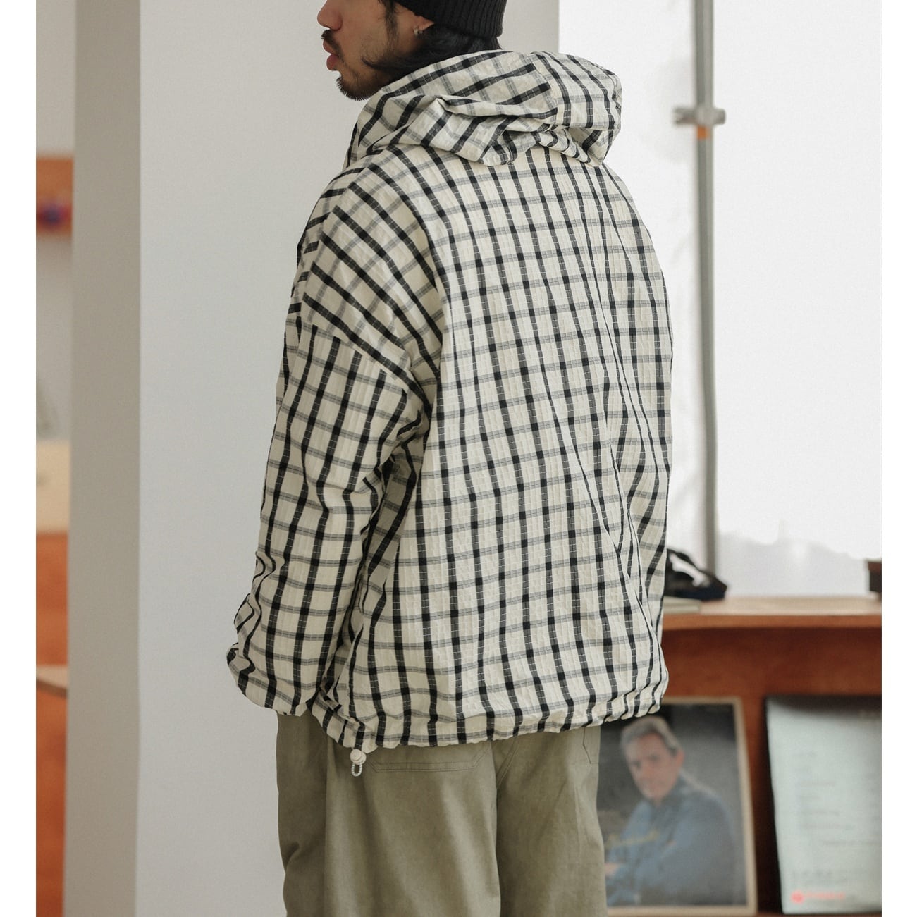 クラシックなチェック柄に遊び心を加えたプルオーバーフーディー。 胸元にボタンを配したスキッパー仕様で、レイヤードにも映えるデザインです。 裾とフードにはドローコードを備え、シルエットの調整も自在です。 カンガルーポケット付きで実用性もあり、1枚で主役になる存在感。 カラーはグリーン、ネイビー、ホワイトの3色展開で、着こなしに程よい抜け感と個性をプラスします。 ■ color グリーン ネイビー ホワイト ■ material ポリエステル ■ size M / L / XL M :肩幅74cm 袖丈53cm 胸囲150cm 着丈70cm L :肩幅76cm 袖丈54cm 胸囲154cm 着丈72cm XL :肩幅78cm 袖丈55cm 胸囲158cm 着丈74cm ※採寸方法により多少の誤差がある場合がございます ■モデル身長:178cm ■着用サイズ : XL [ 商品管理番号:a-1195] 【お買い物にあたっての注意事項】 ご購入前にこちらをご覧ください。 https://store.path-online.shop/about ▶<PATH>TOP PAGEから、新商品やお得な情報をチェック! https://store.path-online.shop/ ▶【Instagram】公式インスタグラムページはこちら。 https://www.instagram.com/path_official_jp/