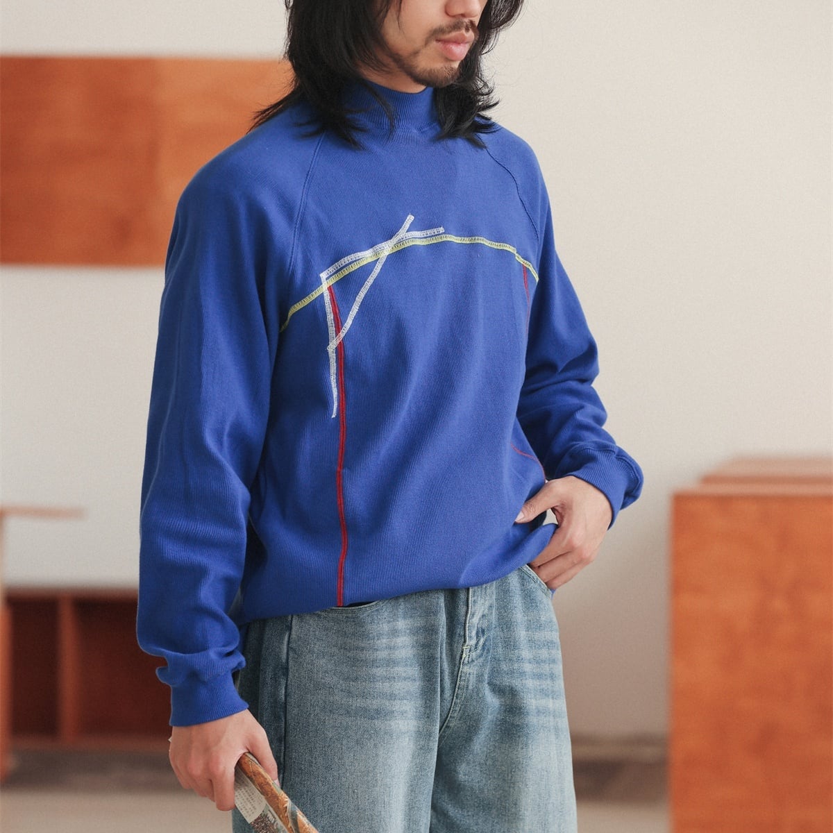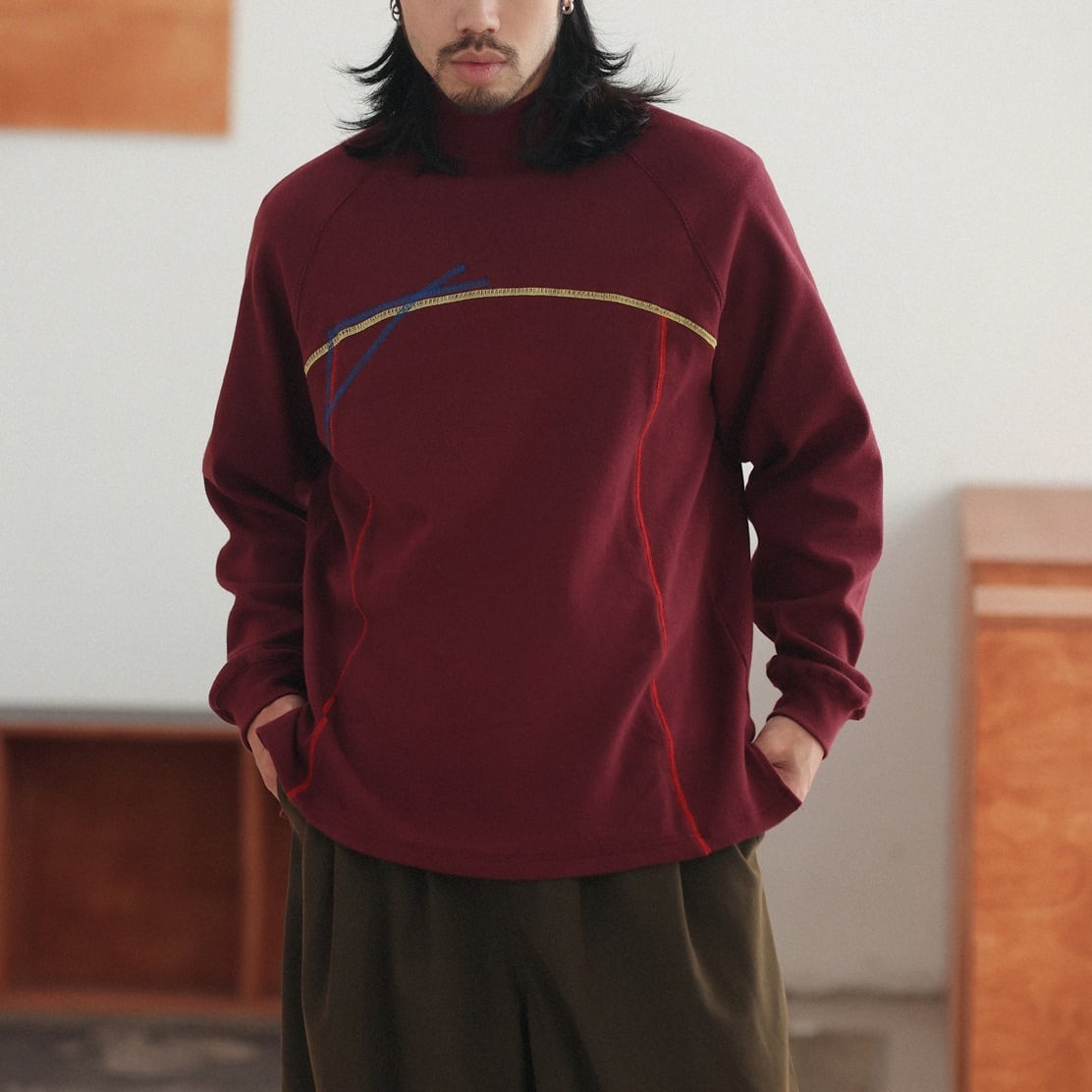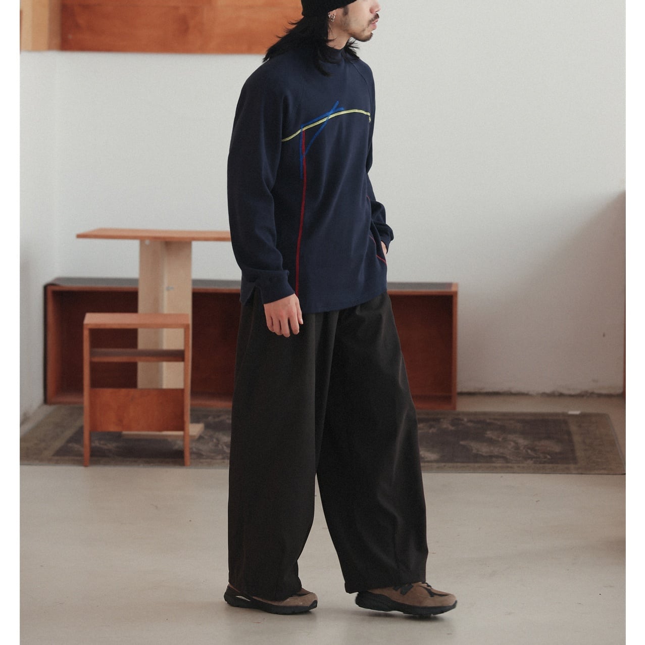 幾何学的な曲線ラインを大胆に配置した、唯一無二の存在感を放つロングスリーブTシャツ。 胸元から流れるように走るイエロー、ブルー、レッドの3色ステッチが、アートピースのような立体感と動きを生み出します。 緩やかなラグランスリーブが肩の可動域を広げ、リラックスした着用感を演出。 裾にはさりげなくスリットを設け、重たさを感じさせない軽やかなシルエットになっています。 一枚で着てもインナーとしても映えるデザインは、コーディネートの主役として活躍します。 シンプルなパンツと合わせるだけで、アートを纏ったような個性を添えます。 ■ color ピンク ダークネイビー ブルー レッド ■ material コットン スパンデックス ■ size M / L / XL M :袖丈(ゆき丈)81cm 胸囲112cm 着丈72cm L :袖丈(ゆき丈)82cm 胸囲116cm 着丈74cm XL :袖丈(ゆき丈)83cm 胸囲120cm 着丈76cm ※採寸方法により多少の誤差がある場合がございます ■モデル身長:178cm ■着用サイズ : XL [ 商品管理番号:a-1212] 【お買い物にあたっての注意事項】 ご購入前にこちらをご覧ください。 https://store.path-online.shop/about ▶<PATH>TOP PAGEから、新商品やお得な情報をチェック! https://store.path-online.shop/ ▶【Instagram】公式インスタグラムページはこちら。 https://www.instagram.com/path_official_jp/