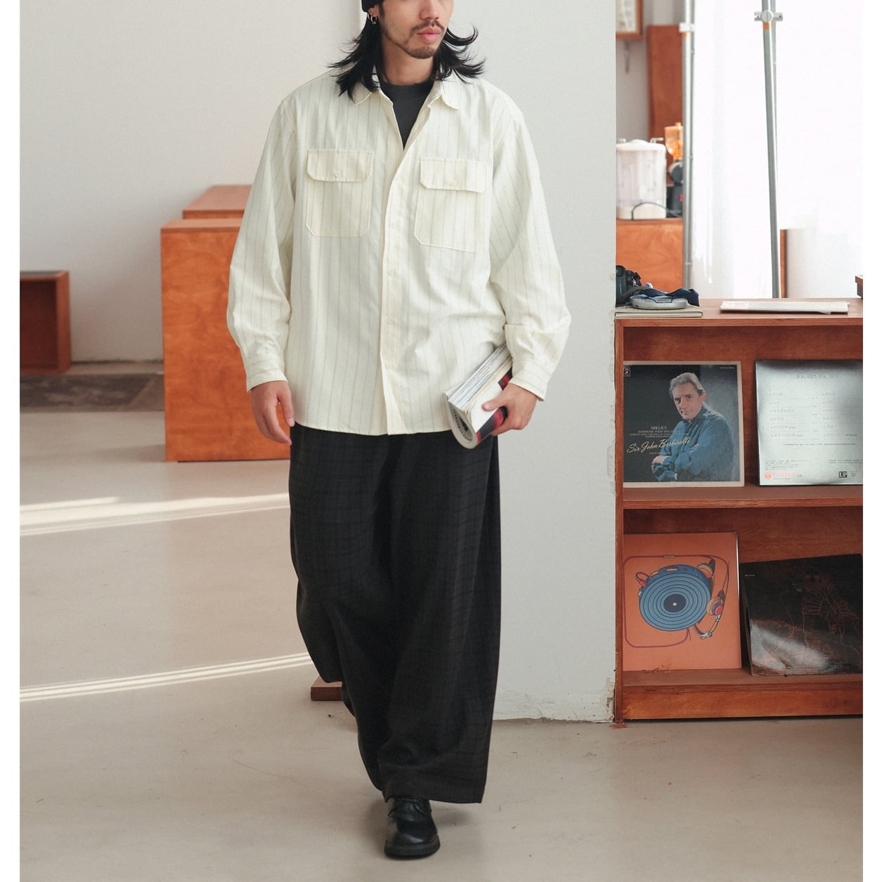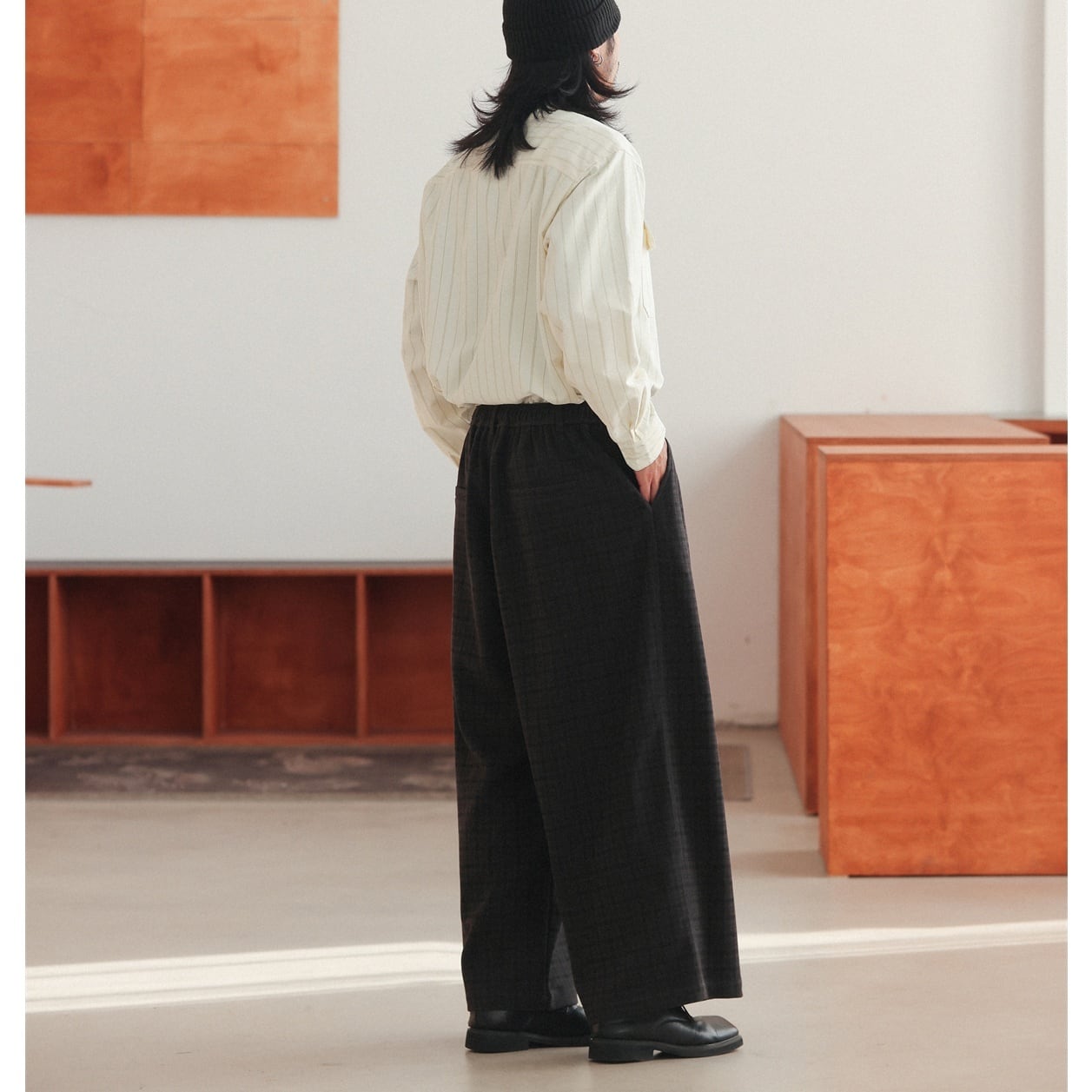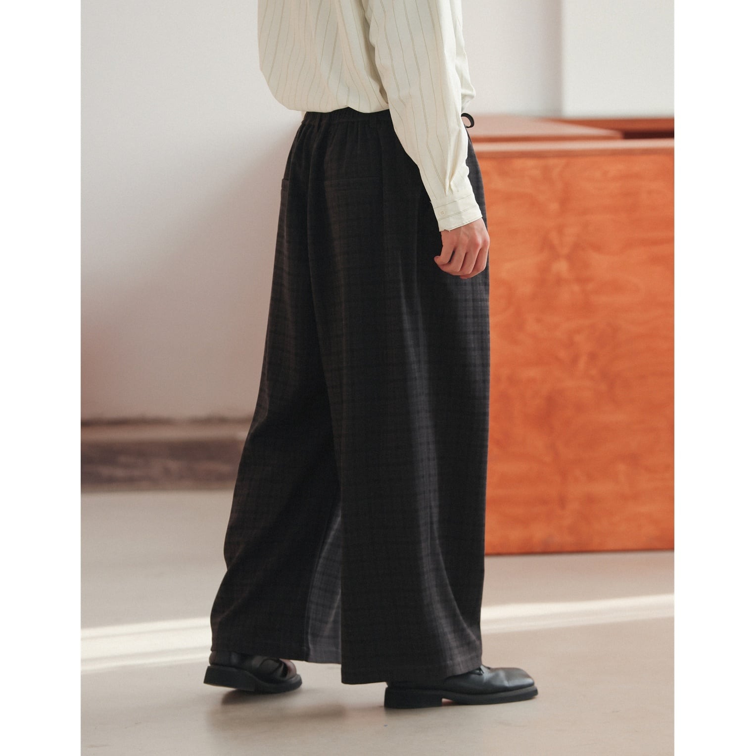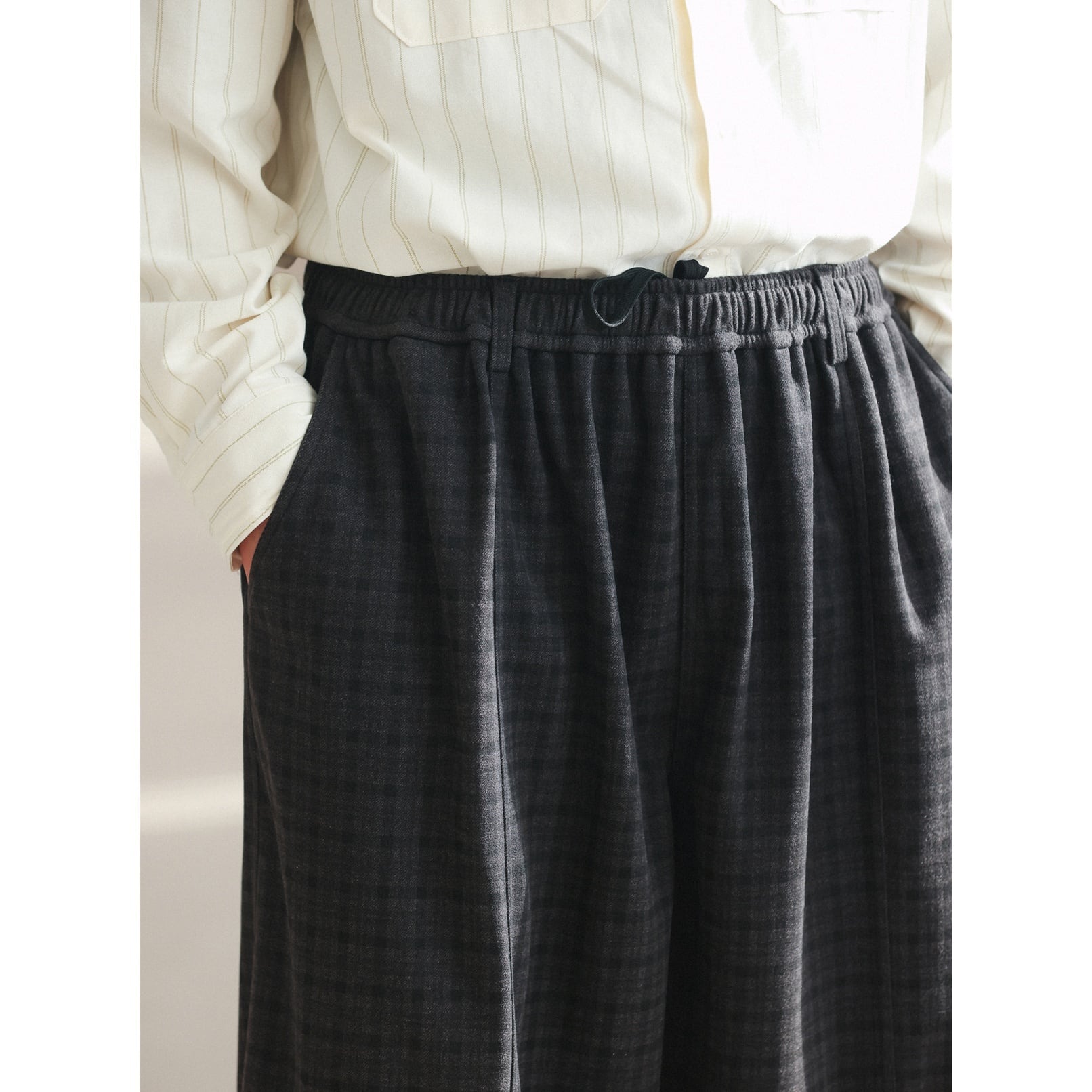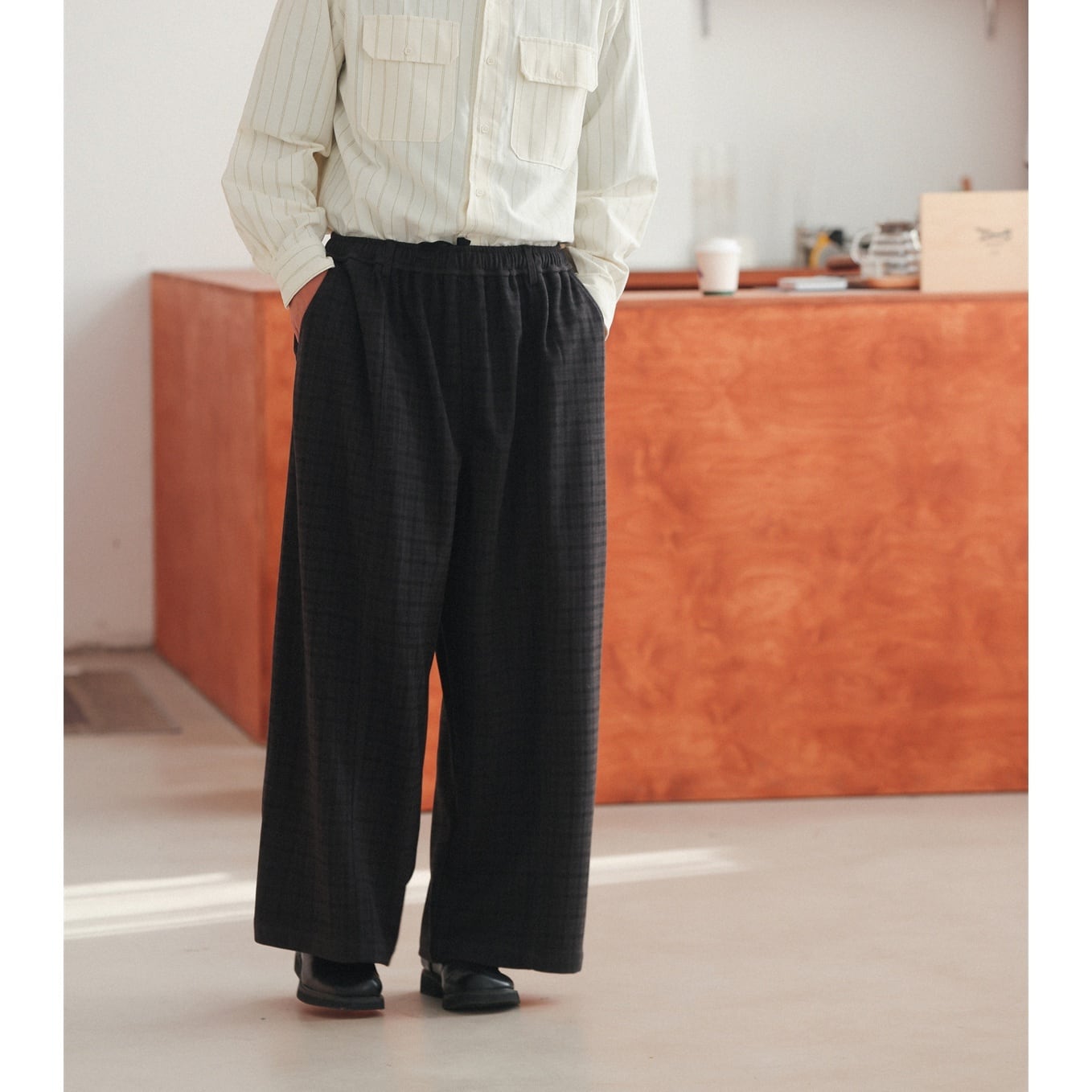 落ち着いた印象のダークチェックが上品なムードを演出する、ワイドシルエットのロングパンツ。 ウエストは総ゴム&内側ドローコード仕様で、ストレスフリーな穿き心地。 シルエットはたっぷりとしたボリュームながらも、裾にかけての美しい落ち感がスタイルをすっきりと見せてくれます。 さりげないチェック柄がコーディネートに奥行きを与え、シャツやニットとの相性も抜群な一本です。 ■ color ダークグレー ■ material ポリエステル その他 ■ size S / M / L / XL S :ウエスト66-108cm ヒップ148cm 総丈92cm M :ウエスト70-112cm ヒップ152cm 総丈94cm L :ウエスト74-116cm ヒップ156cm 総丈96cm XL :ウエスト78-120cm ヒップ160cm 総丈98cm ※採寸方法により多少の誤差がある場合がございます ■モデル身長:178cm ■着用サイズ : XL [ 商品管理番号:a-1216] 【お買い物にあたっての注意事項】 ご購入前にこちらをご覧ください。 https://store.path-online.shop/about ▶<PATH>TOP PAGEから、新商品やお得な情報をチェック! https://store.path-online.shop/ ▶【Instagram】公式インスタグラムページはこちら。 https://www.instagram.com/path_official_jp/