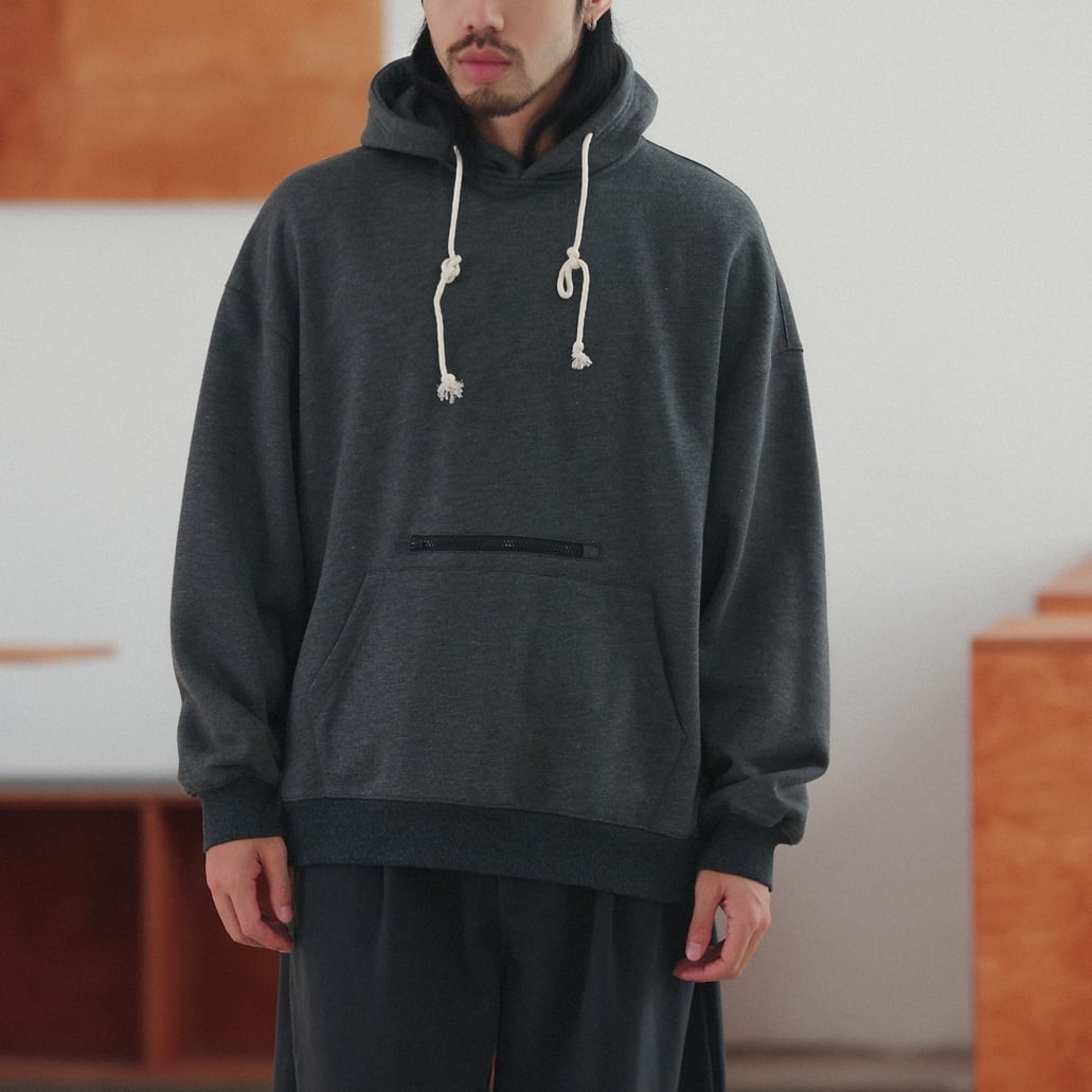 ざっくりとしたゆとりが魅力のプルオーバーパーカー。 首元には大きめのフードと長めのドローストリングをあしらい、シンプルながらも印象的な佇まいになっています。 フロントポケットにはさりげなくファスナー付きポケットを配置し、日常使いにも便利なデザイン。 袖口と裾のリブが全体のシルエットを引き締め、抜け感のあるスタイリングを叶えます。 ■ color ダークグレー グリーン ■ material コットン ■ size M / L / XL M :肩幅66cm 袖丈56cm 胸囲132cm 着丈67cm L :肩幅68cm 袖丈57cm 胸囲136cm 着丈69cm XL :肩幅70cm 袖丈58cm 胸囲140cm 着丈71cm ※採寸方法により多少の誤差がある場合がございます ■モデル身長:178cm ■着用サイズ : XL [ 商品管理番号:a-1228] 【お買い物にあたっての注意事項】 ご購入前にこちらをご覧ください。 https://store.path-online.shop/about ▶<PATH>TOP PAGEから、新商品やお得な情報をチェック! https://store.path-online.shop/ ▶【Instagram】公式インスタグラムページはこちら。 https://www.instagram.com/path_official_jp/