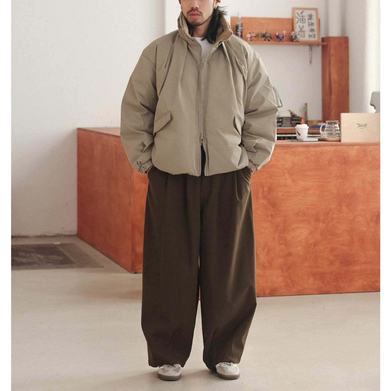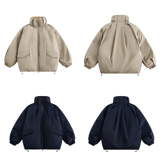 デザイン性のあるスタンドカラーがポイントのバルーンシルエットブルゾン。 フロントはダブルジップ仕様で着こなしの幅が広がり、裾にはドローストリングを備えてシルエットの調整が可能です。存在感があり、カジュアルにも都会的なスタイルにも合わせやすい一着。 羽織るだけで洗練されたムードを演出してくれます。 ■ color ベージュ ネイビー ■ material ポリエステル ■ size M / L / XL / 2XL M :肩幅57cm 袖丈59.4cm 胸囲129cm 着丈69cm L :肩幅59cm 袖丈60.7cm 胸囲133cm 着丈71cm XL :肩幅61cm 袖丈62cm 胸囲137cm 着丈73cm 2XL :肩幅63cm 袖丈63.3cm 胸囲141cm 着丈75cm ※採寸方法により多少の誤差がある場合がございます ■モデル身長:178cm ■着用サイズ : XL [ 商品管理番号:a-1242] 【お買い物にあたっての注意事項】 ご購入前にこちらをご覧ください。 https://store.path-online.shop/about ▶<PATH>TOP PAGEから、新商品やお得な情報をチェック! https://store.path-online.shop/ ▶【Instagram】公式インスタグラムページはこちら。 https://www.instagram.com/path_official_jp/