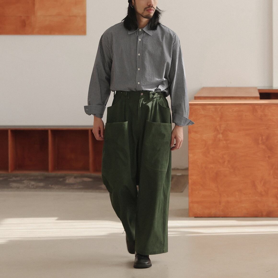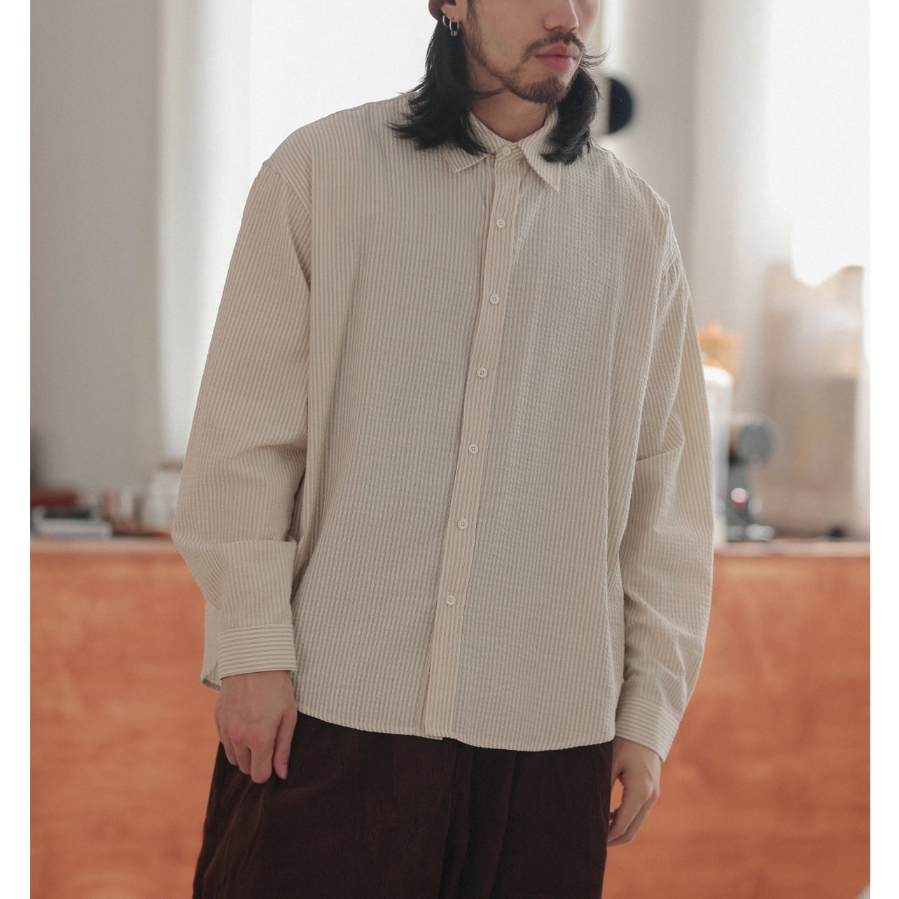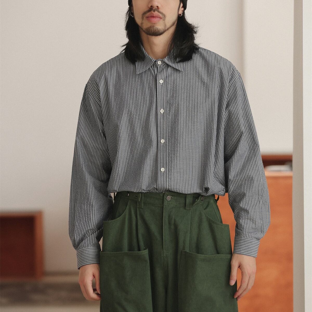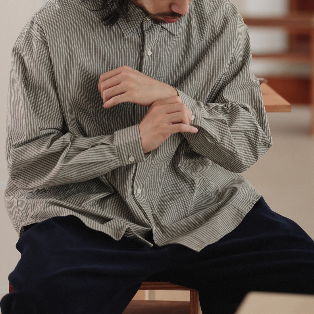 ワークシャツテイストのストライプシャツ。 繊細に走るストライプ柄が落ち着いた佇まいの中に上品な個性を添えます。 ゆったりとしたシルエットが肩の力を抜いたリラックス感を生み、日常のスタイルに自然と馴染む一枚です。 ■ color ホワイト ベージュ グリーン ネイビー ■ material コットン ■ size S / M / L / XL S :肩幅55cm 袖丈58cm 胸囲132cm 着丈69cm M :肩幅56cm 袖丈59cm 胸囲136cm 着丈71cm L :肩幅57cm 袖丈60cm 胸囲140cm 着丈73cm XL :肩幅58cm 袖丈61cm 胸囲144cm 着丈75cm ※採寸方法により多少の誤差がある場合がございます ■モデル身長:178cm ■着用サイズ : XL [ 商品管理番号:a-1246] 【お買い物にあたっての注意事項】 ご購入前にこちらをご覧ください。 https://store.path-online.shop/about ▶<PATH>TOP PAGEから、新商品やお得な情報をチェック! https://store.path-online.shop/ ▶【Instagram】公式インスタグラムページはこちら。 https://www.instagram.com/path_official_jp/