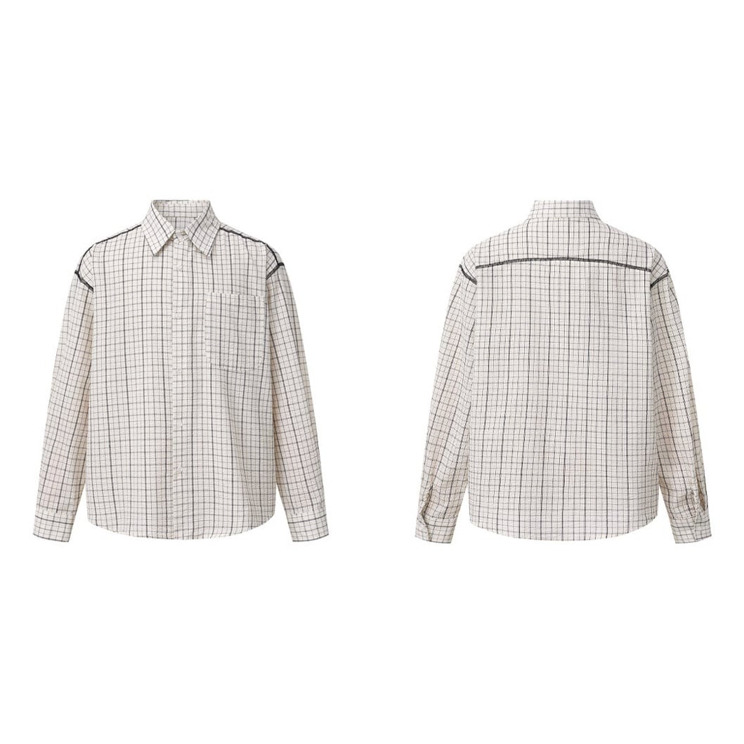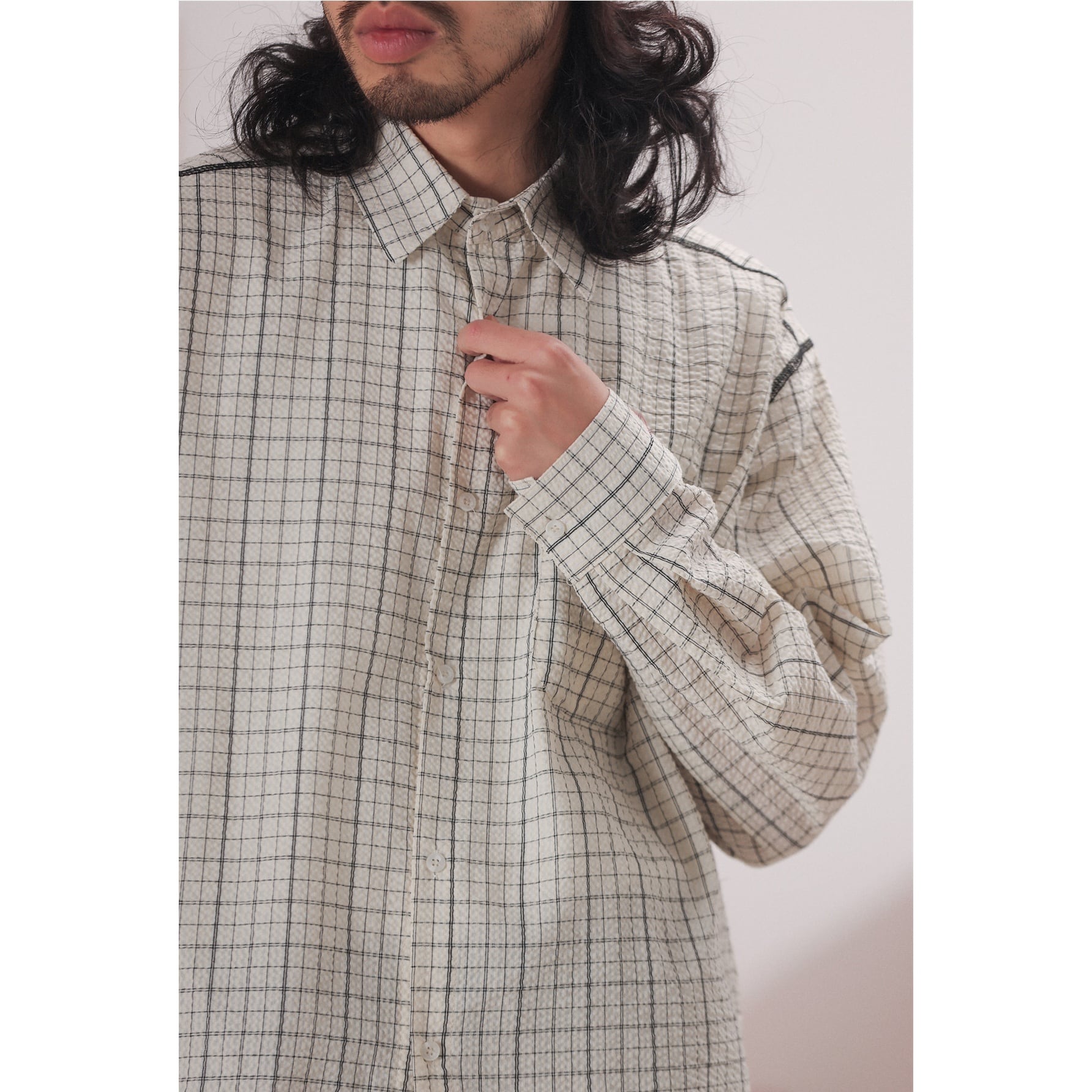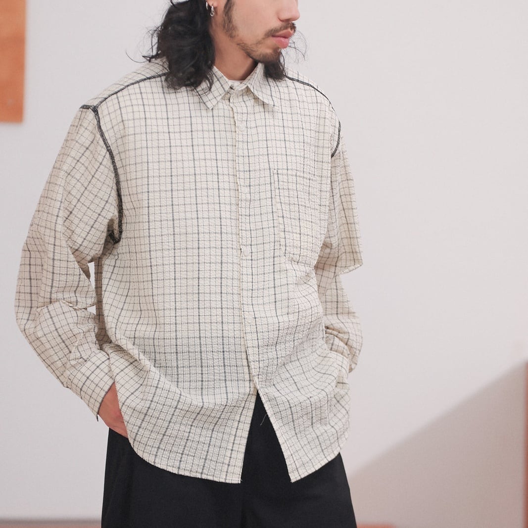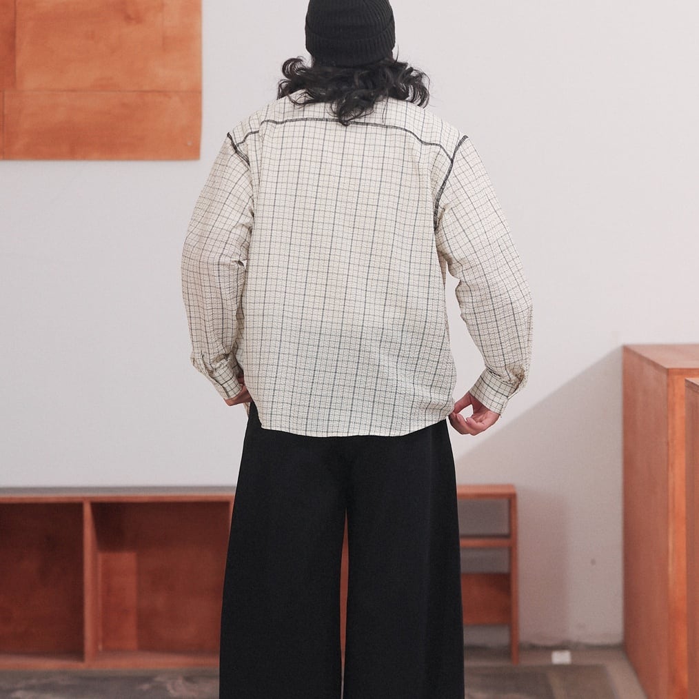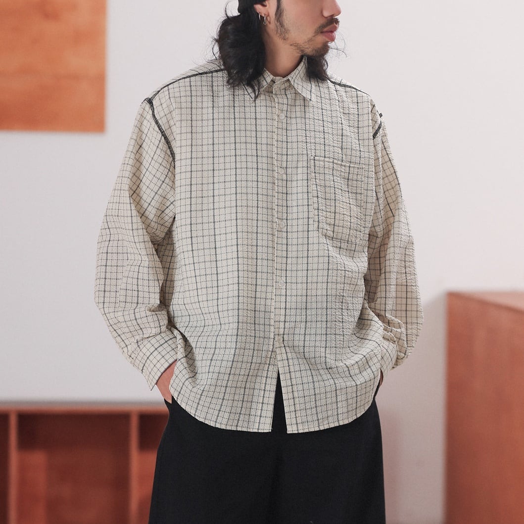黒の細いラインで構成されたチェック柄が特徴のオーバーサイズシャツ。