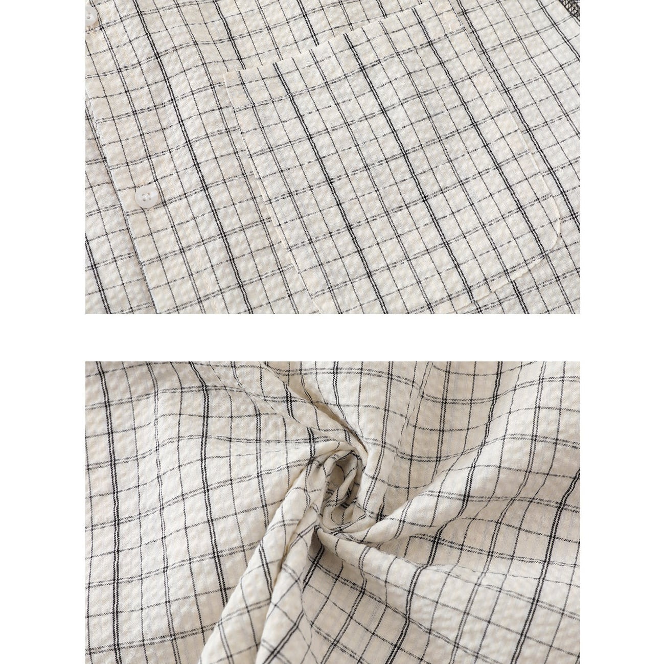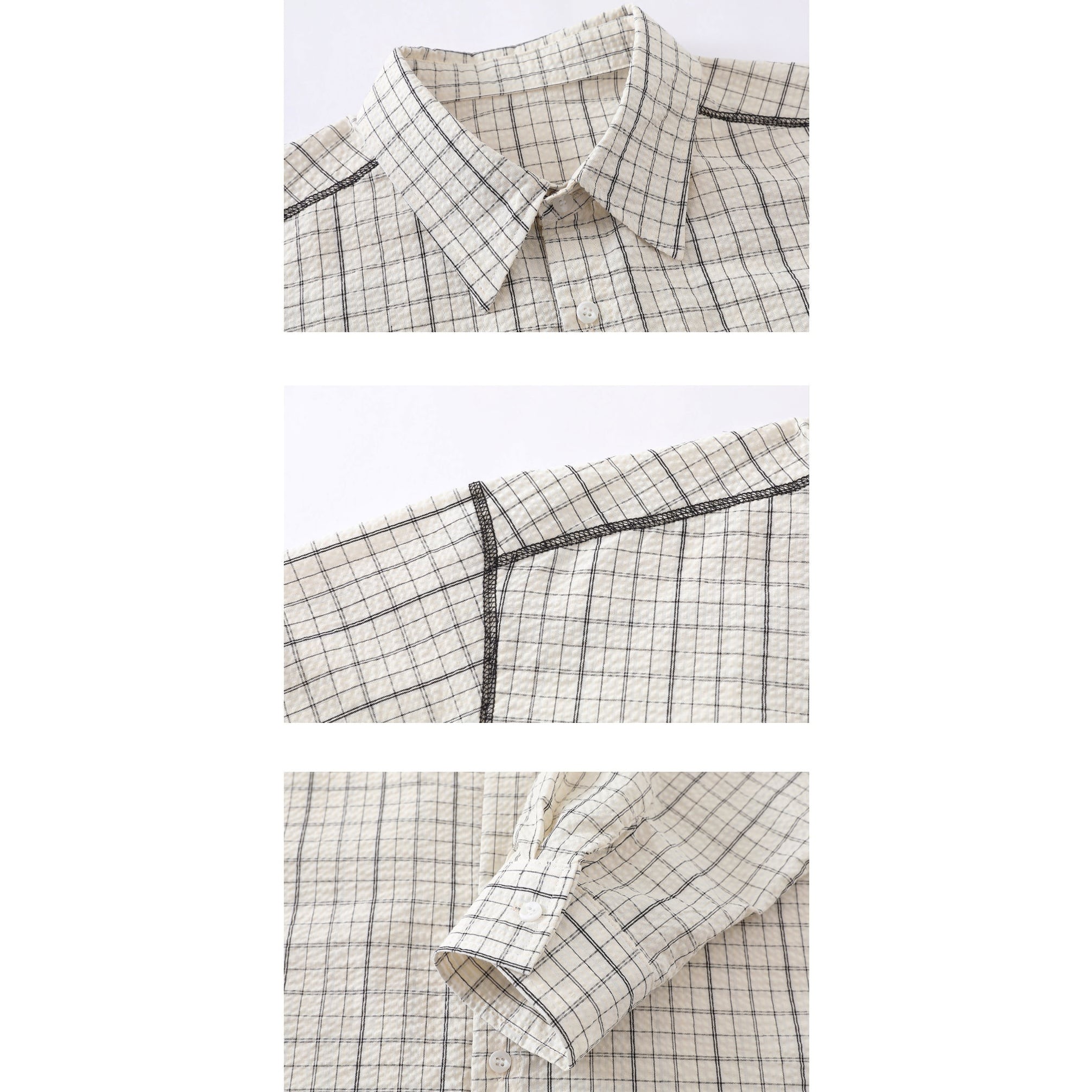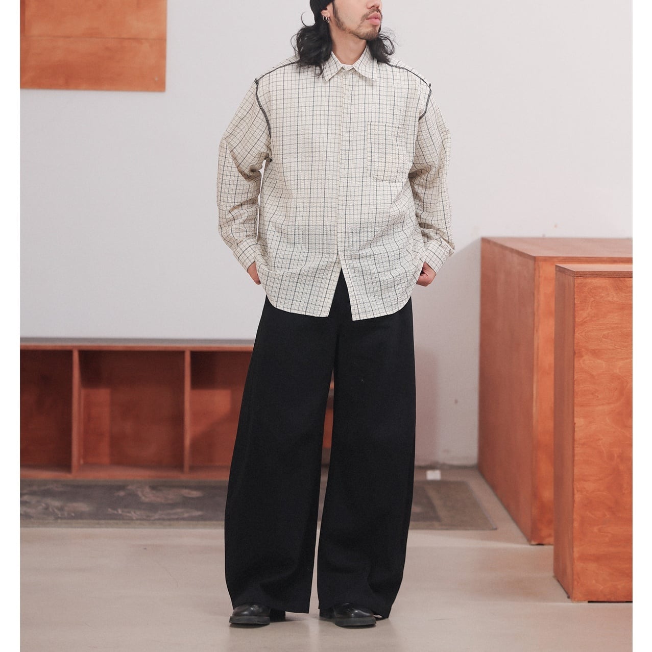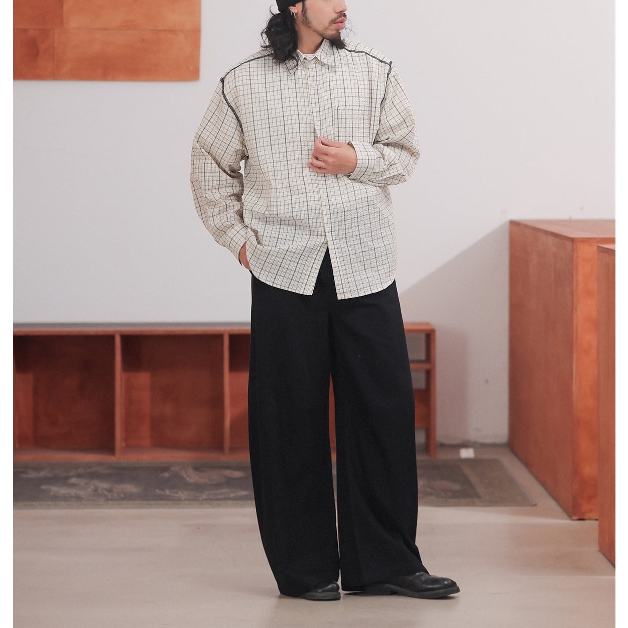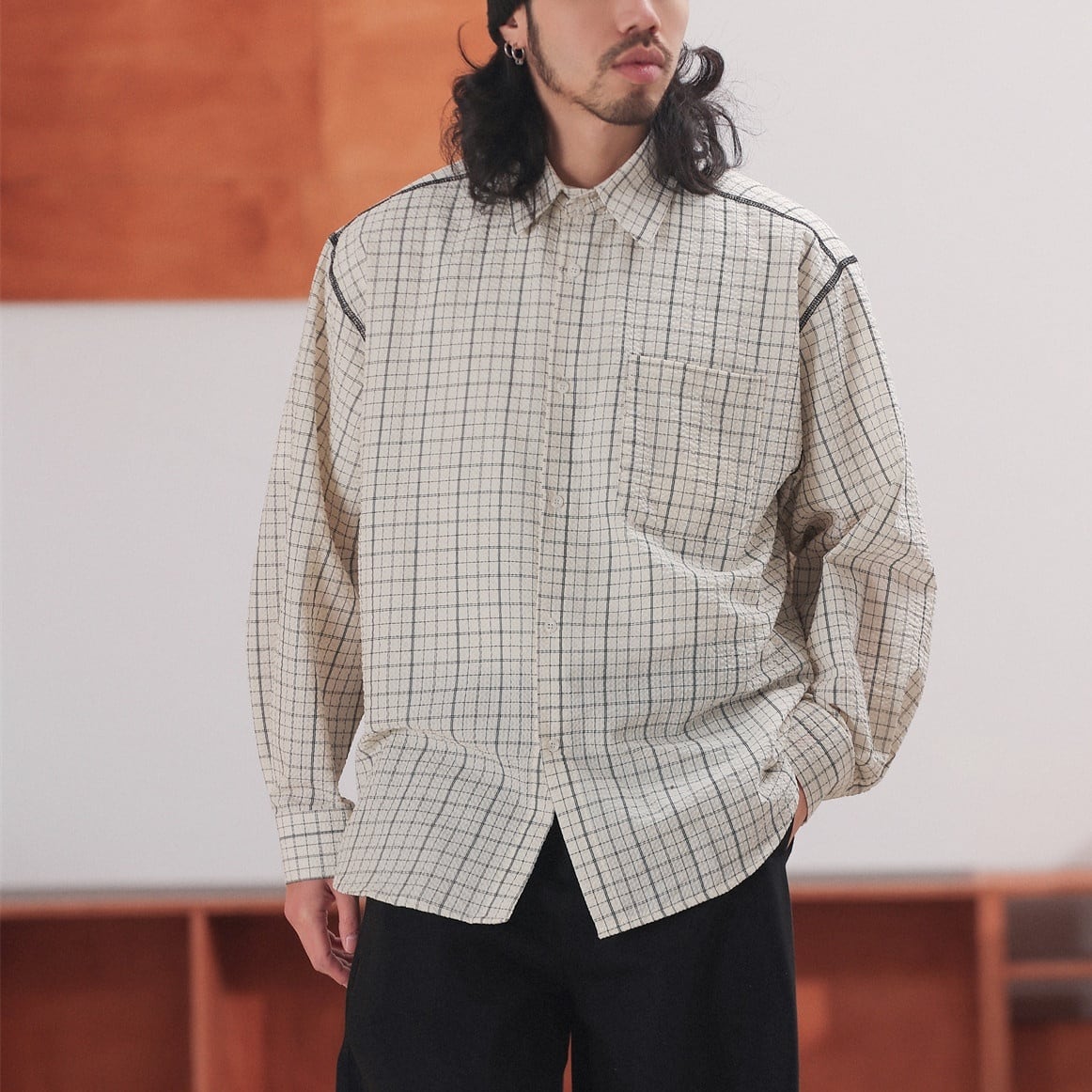 黒の細いラインで構成されたチェック柄が特徴のオーバーサイズシャツ。