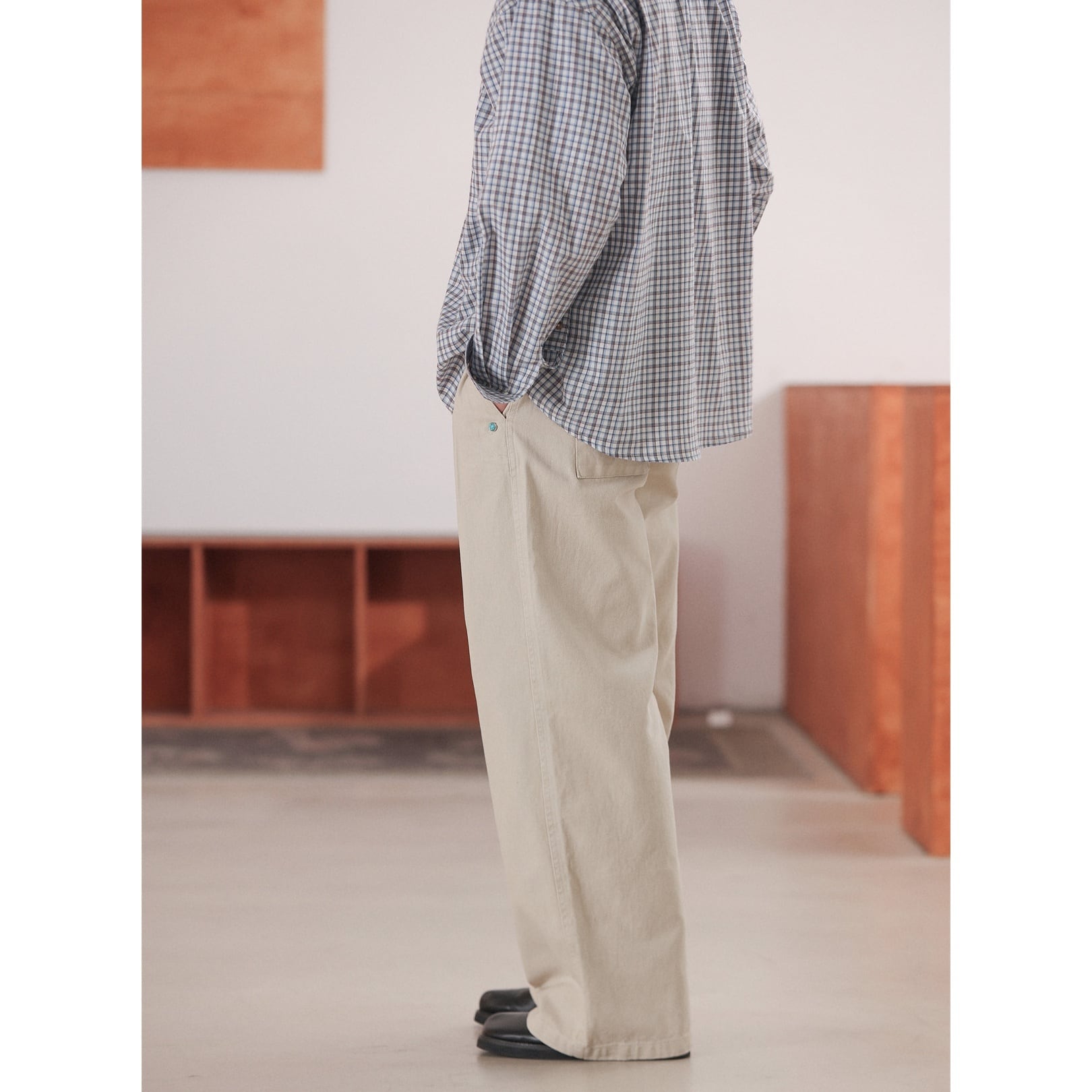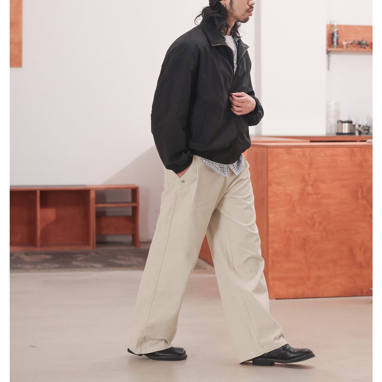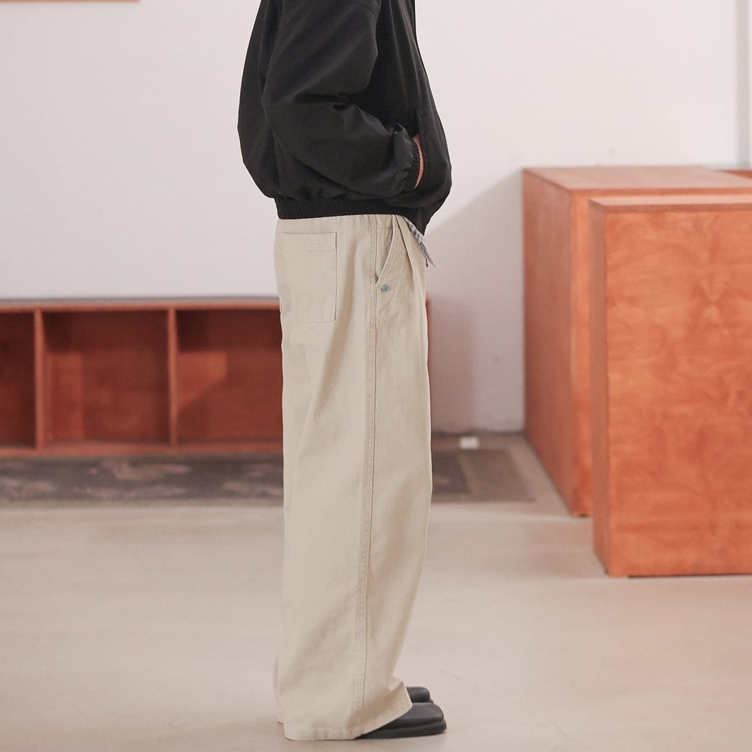 裾に向かってほとんど絞らず、まっすぐ落ちる今らしいワイドラインで、足元にワンクッション入るフルレングス寄りの丈感がスニーカー・革靴どちらにも馴染みます。