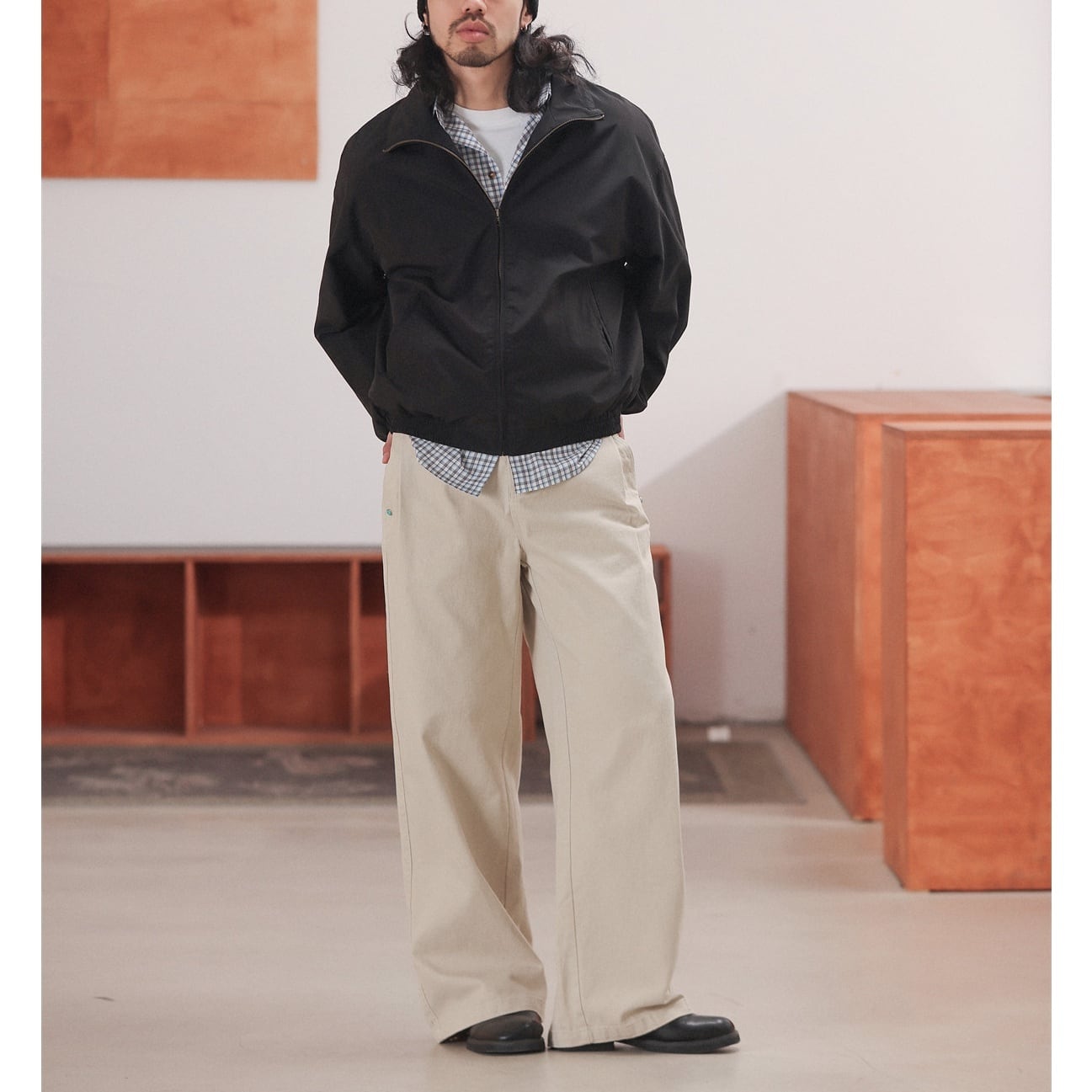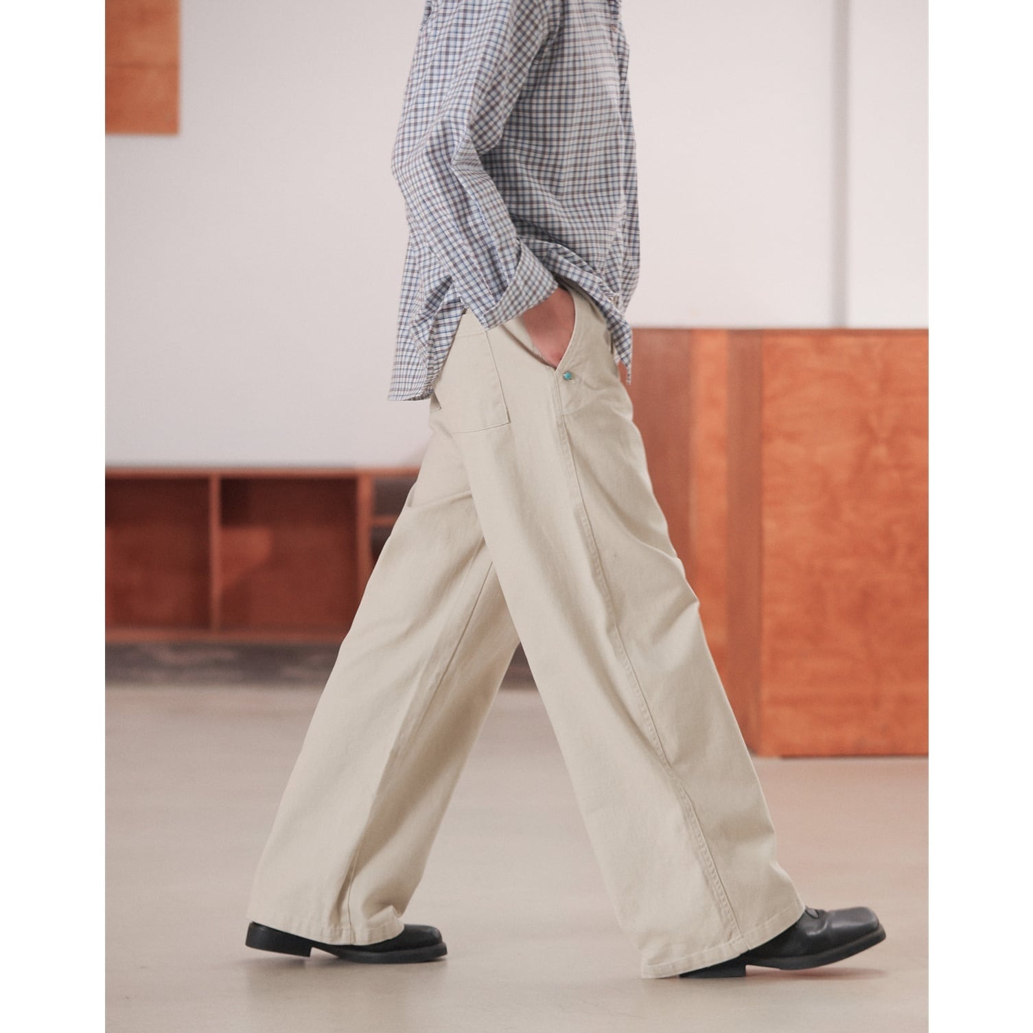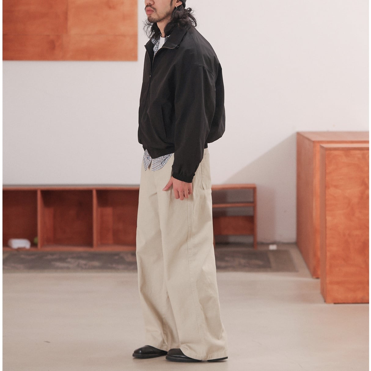 裾に向かってほとんど絞らず、まっすぐ落ちる今らしいワイドラインで、足元にワンクッション入るフルレングス寄りの丈感がスニーカー・革靴どちらにも馴染みます。