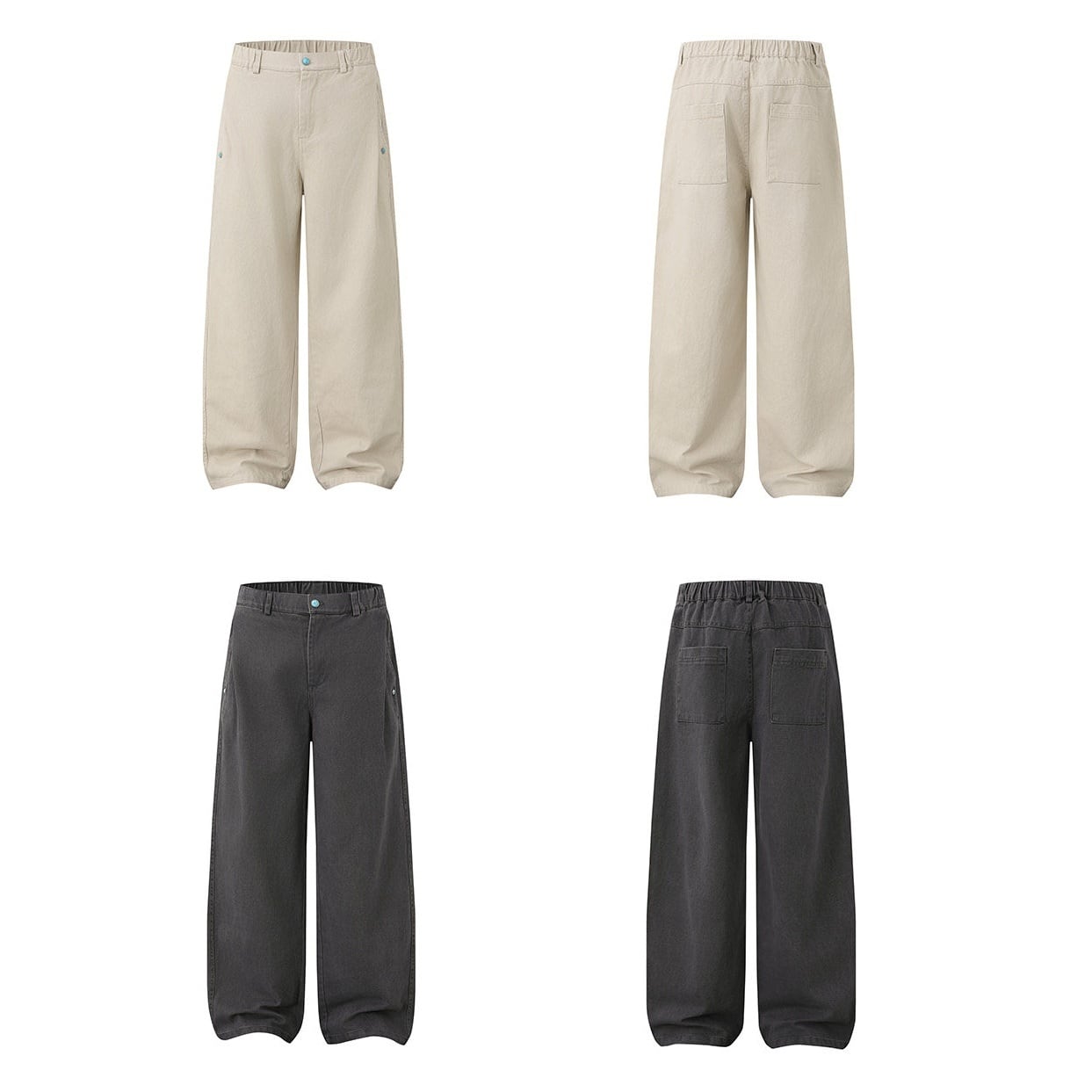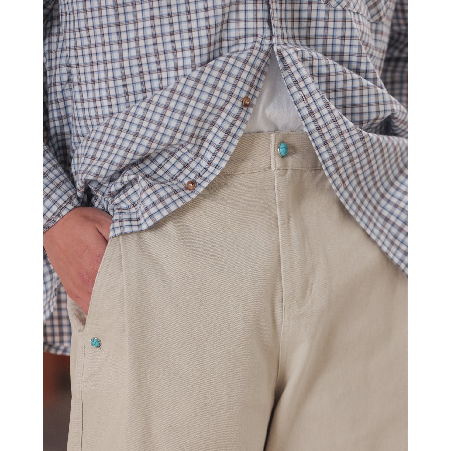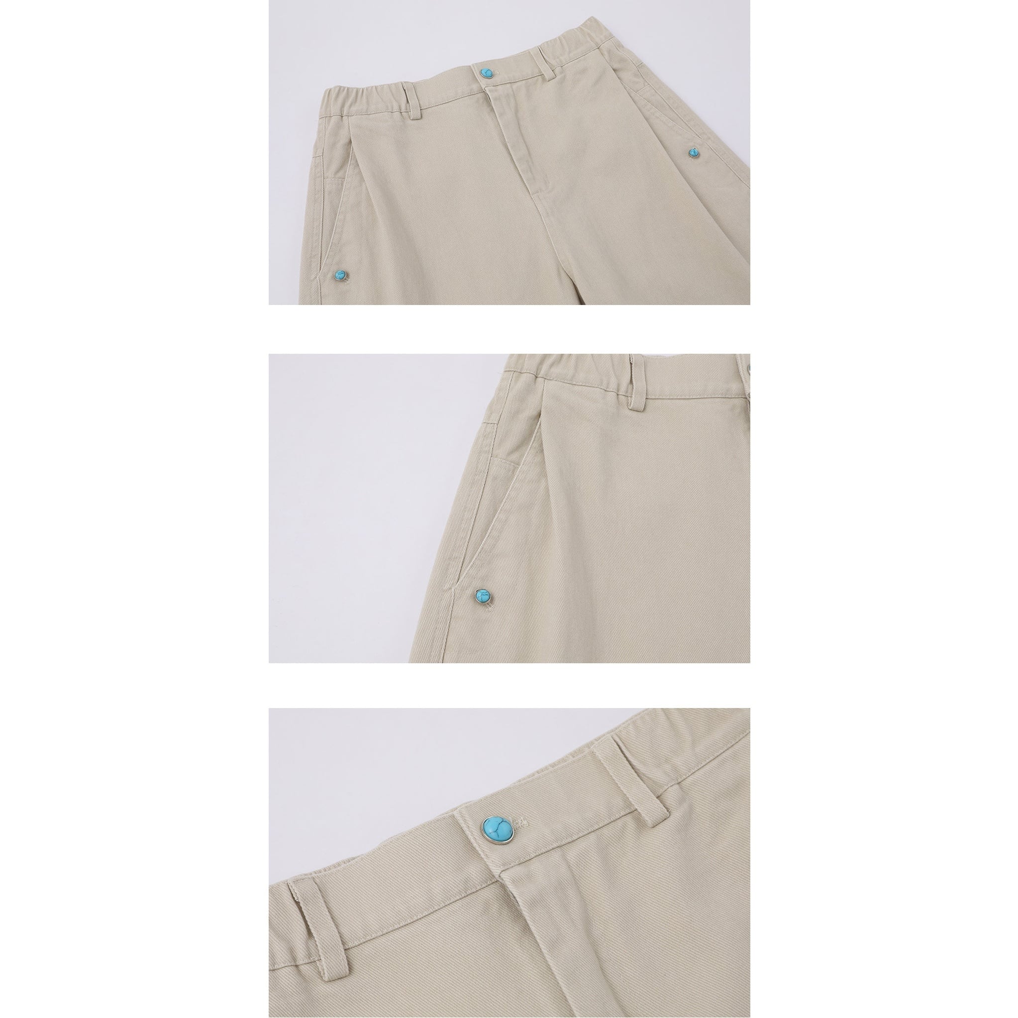 ボディに映えるターコイズブルーのボタンがアクセントになったワイドパンツ。