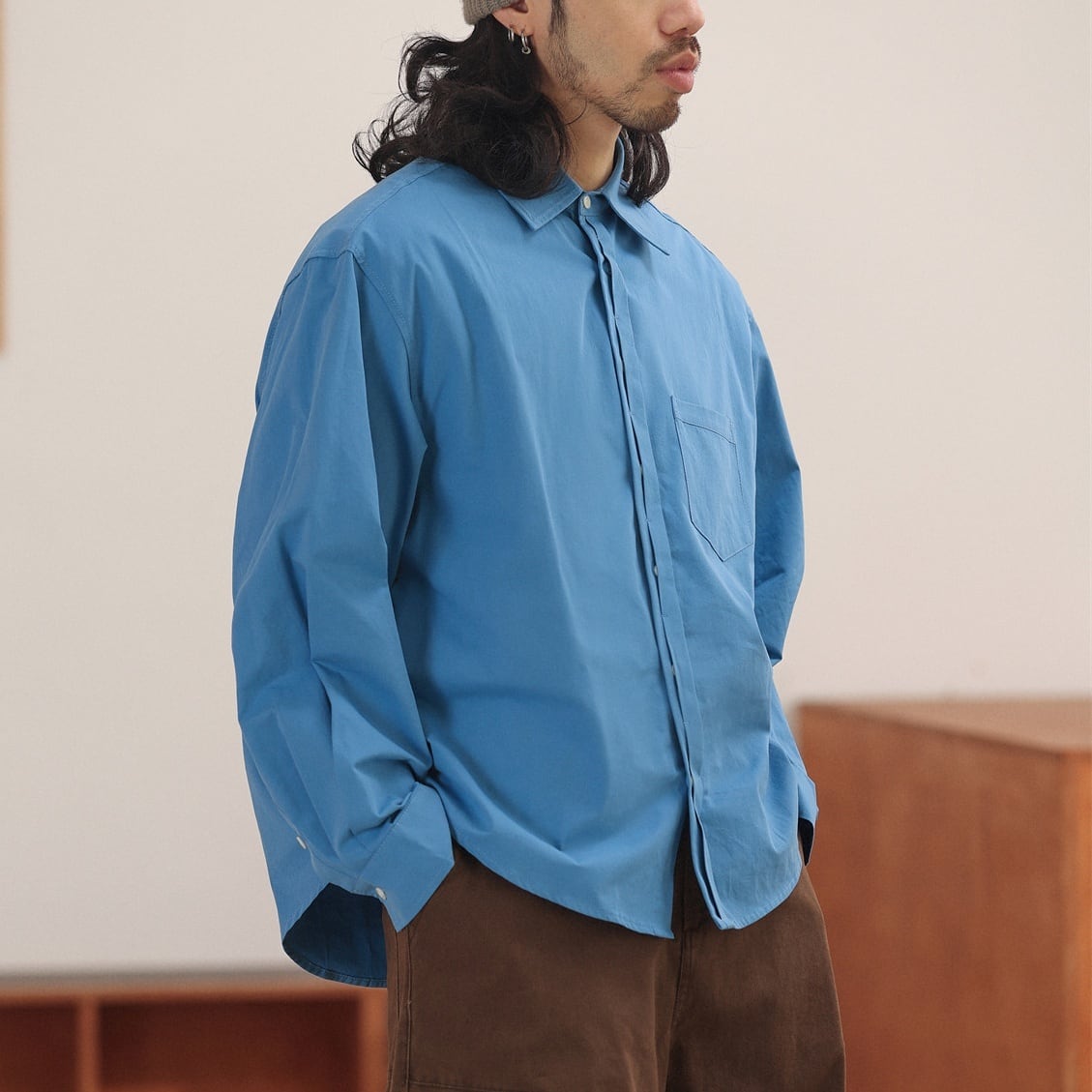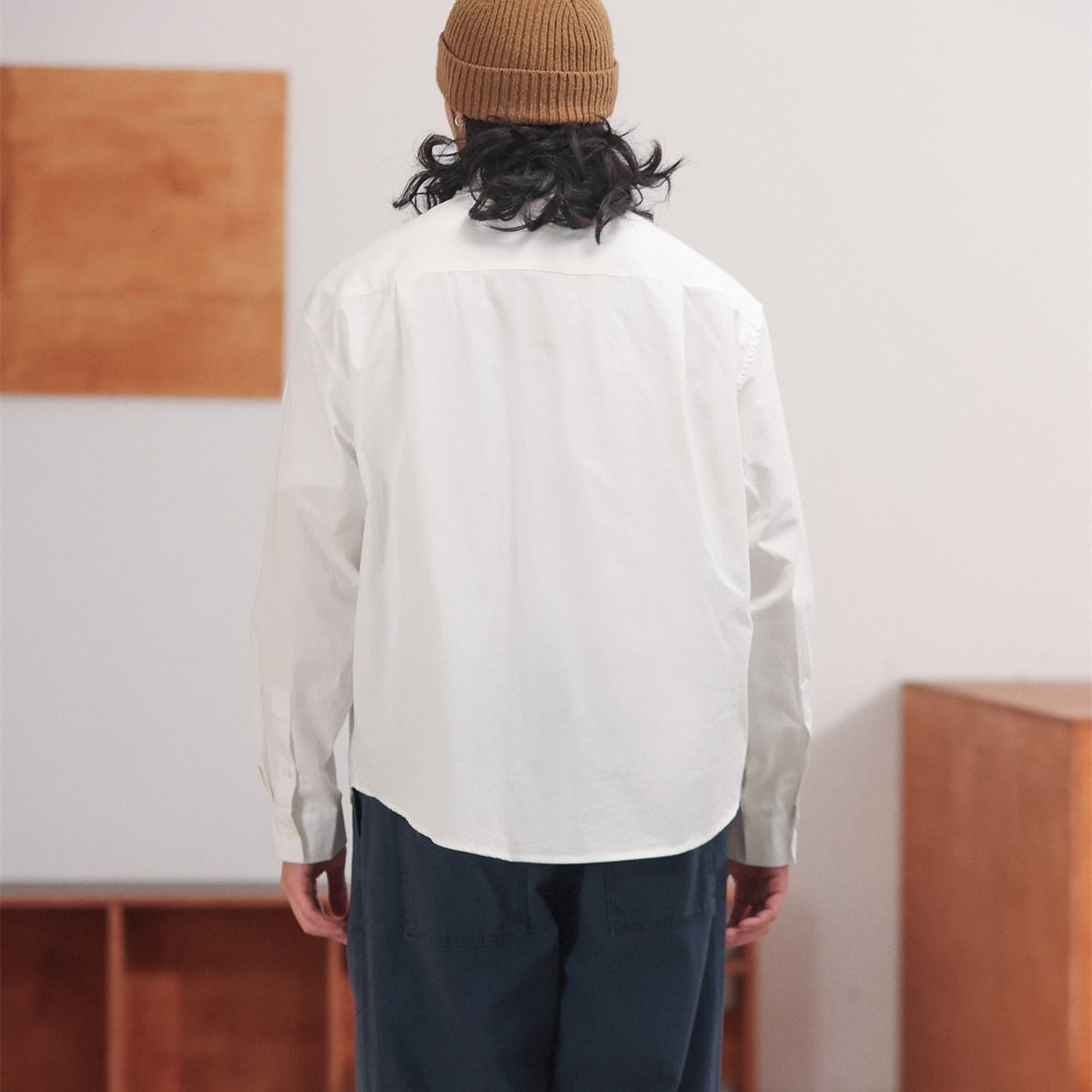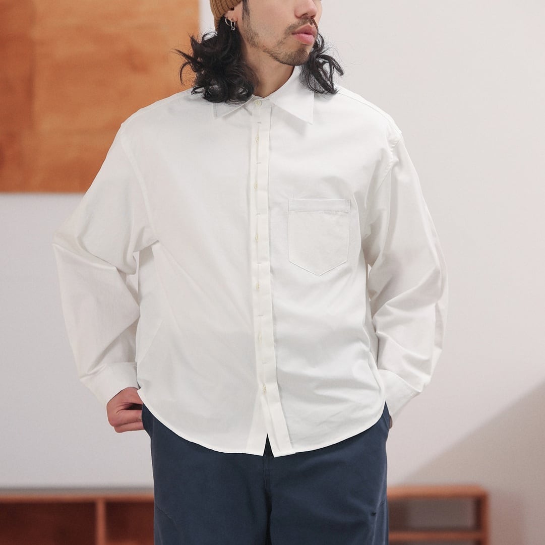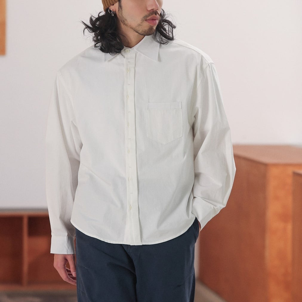 前立ての内側にボタンが隠れる仕様で、肩を落としたドロップショルダーも魅力のワイドシャツ。