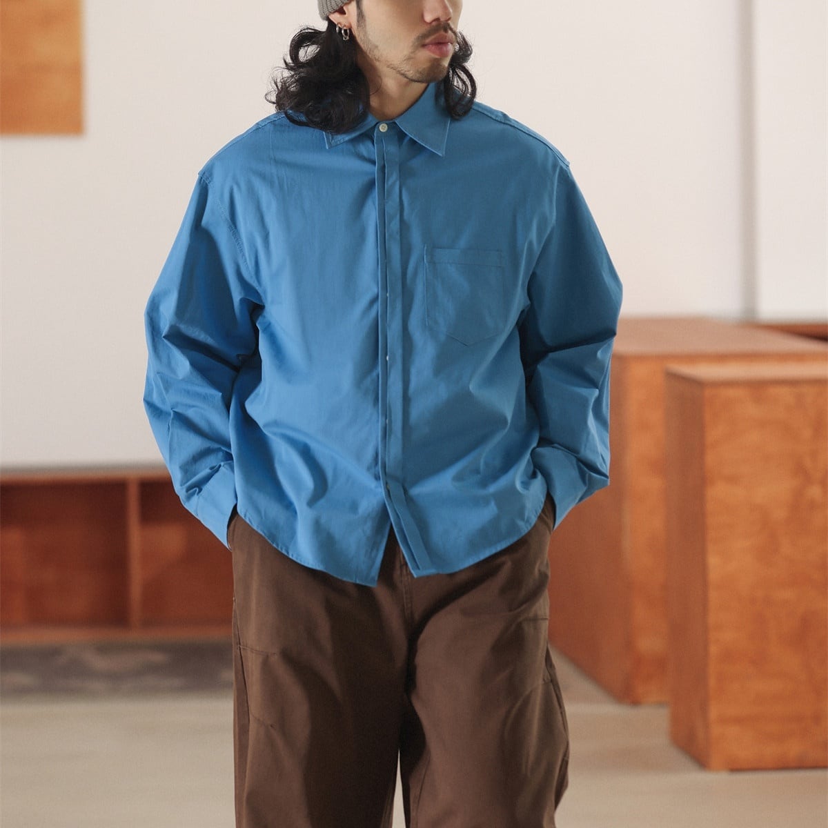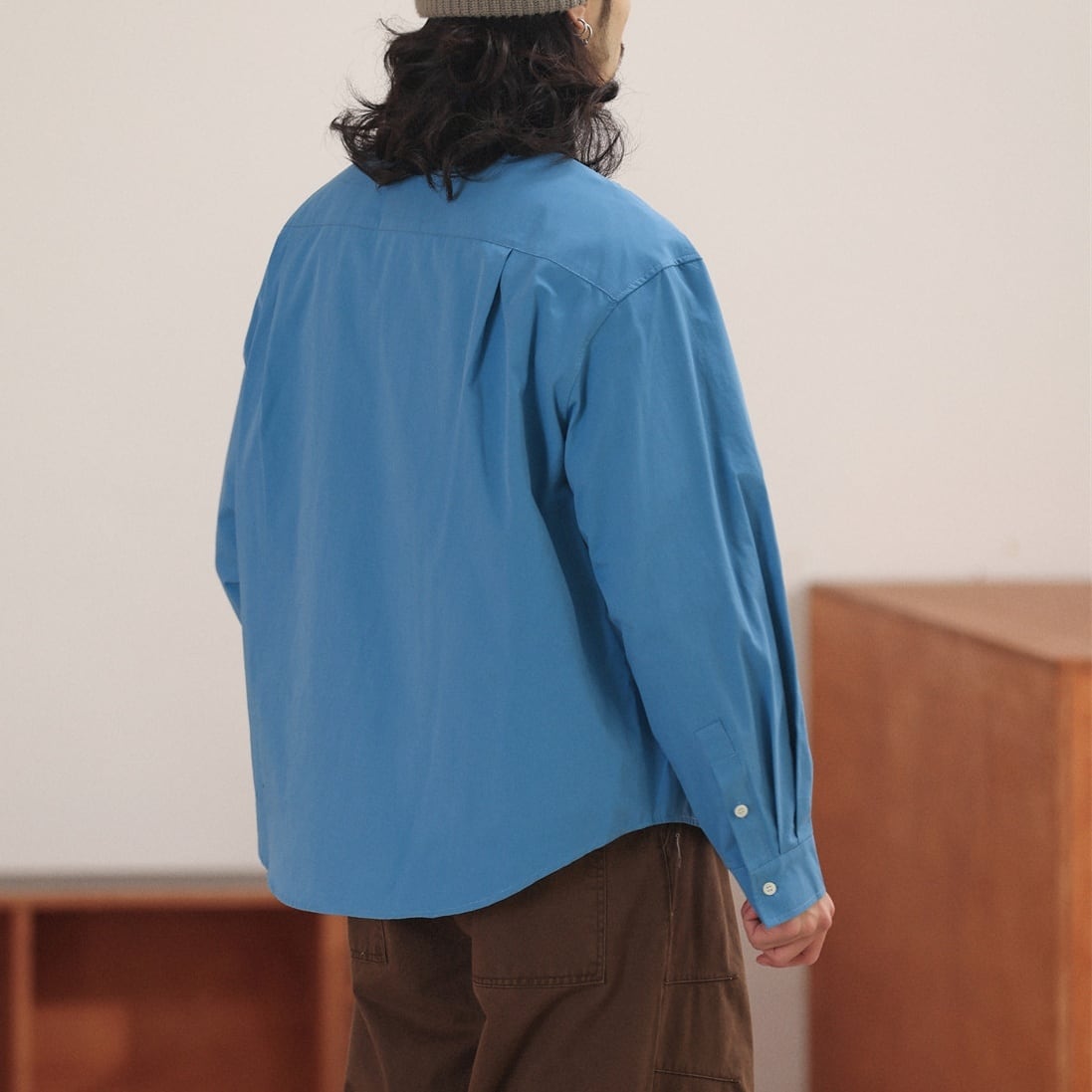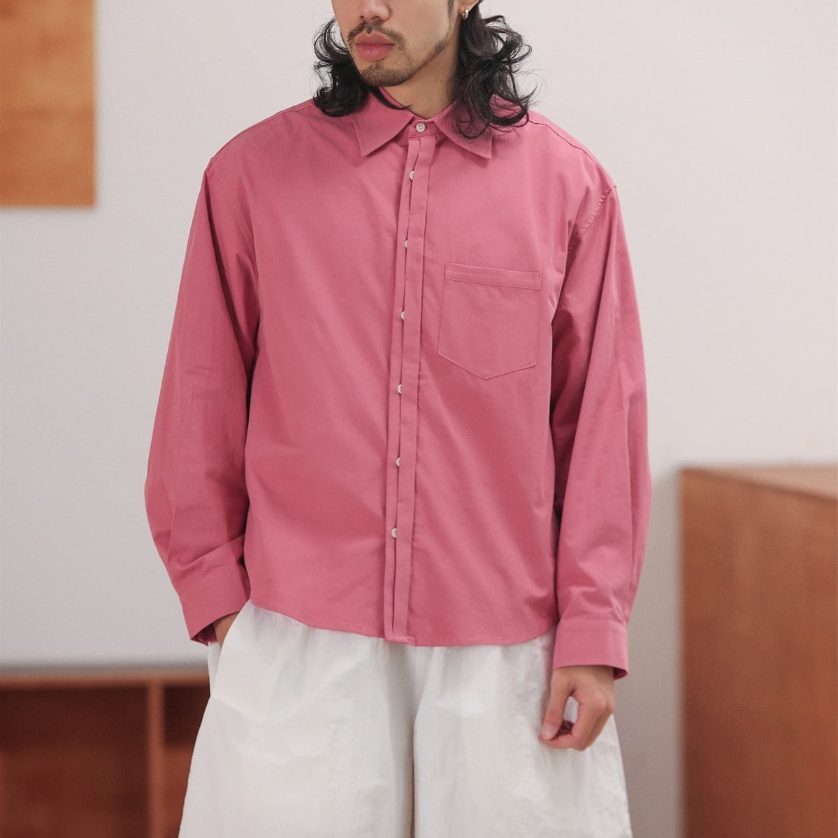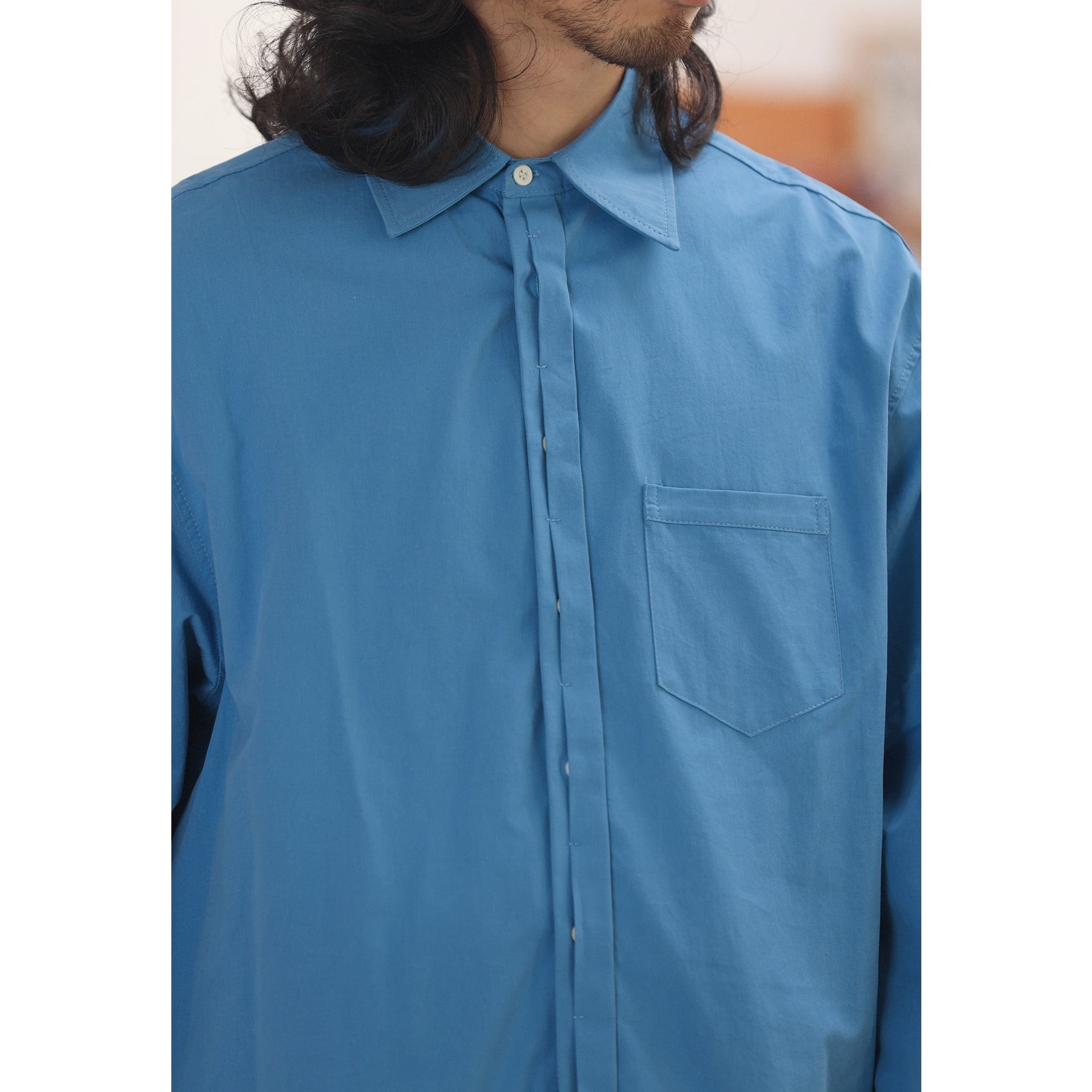 前立ての内側にボタンが隠れる仕様で、肩を落としたドロップショルダーも魅力のワイドシャツ。