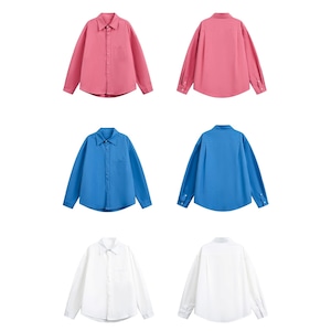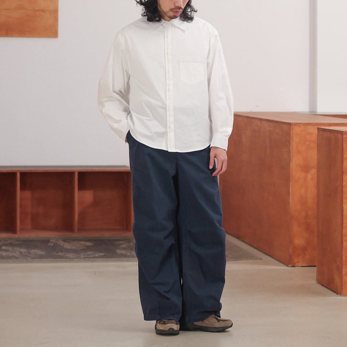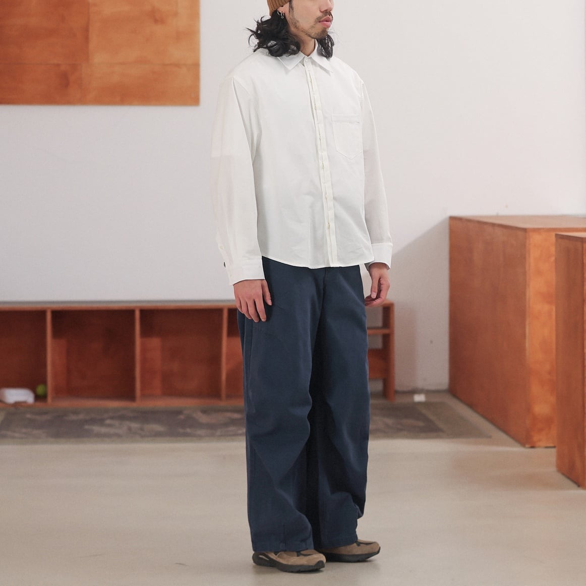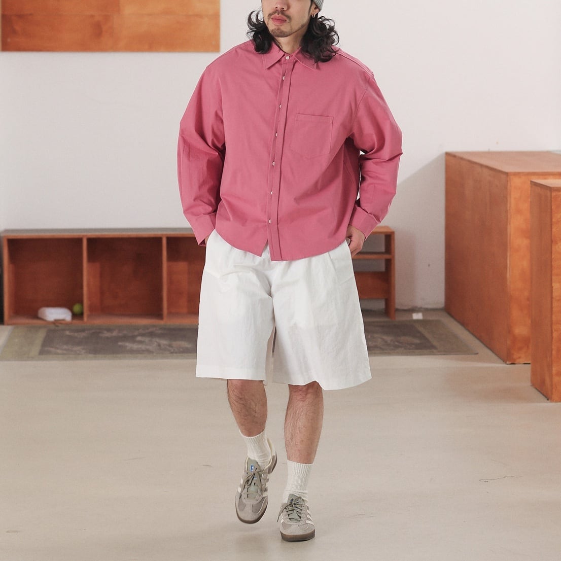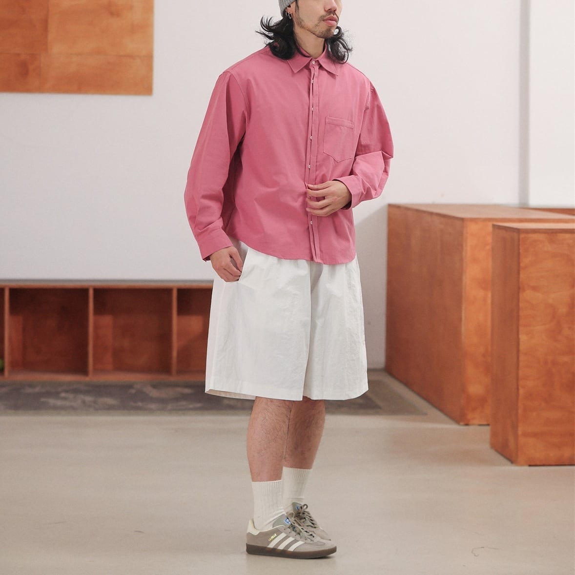 前立ての内側にボタンが隠れる仕様で、肩を落としたドロップショルダーも魅力のワイドシャツ。