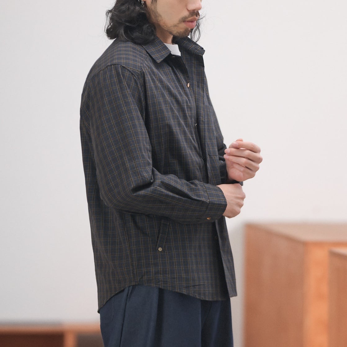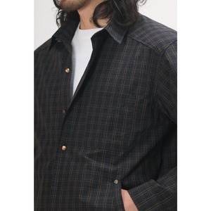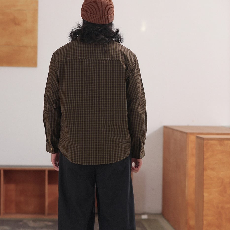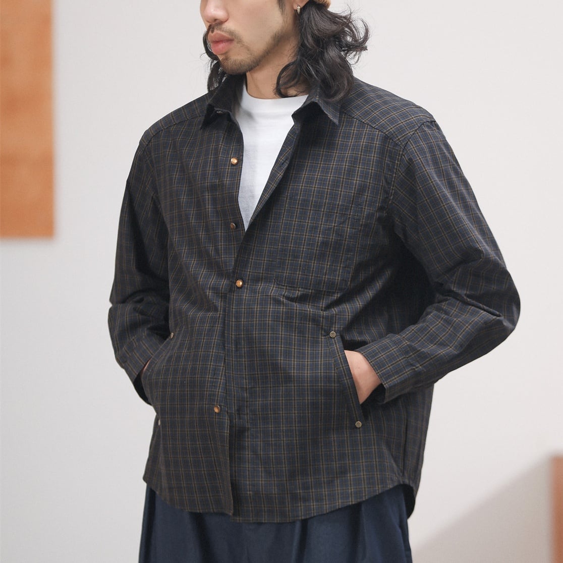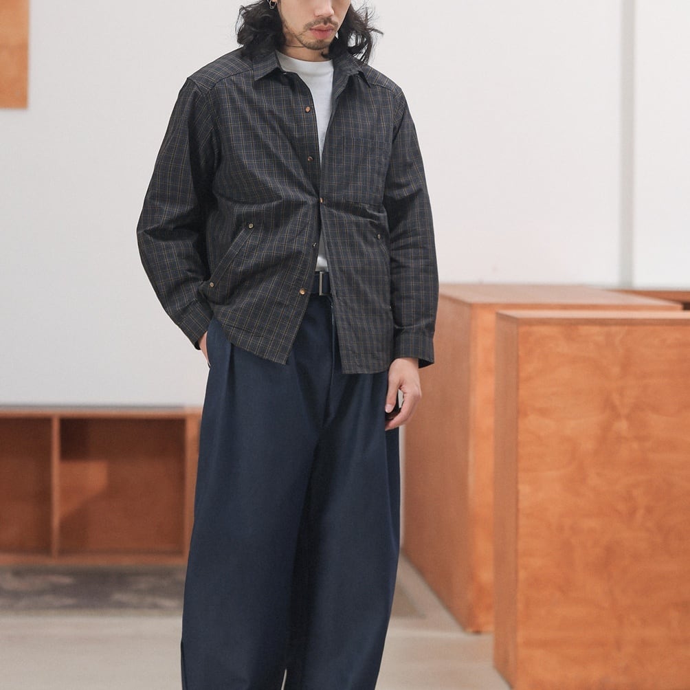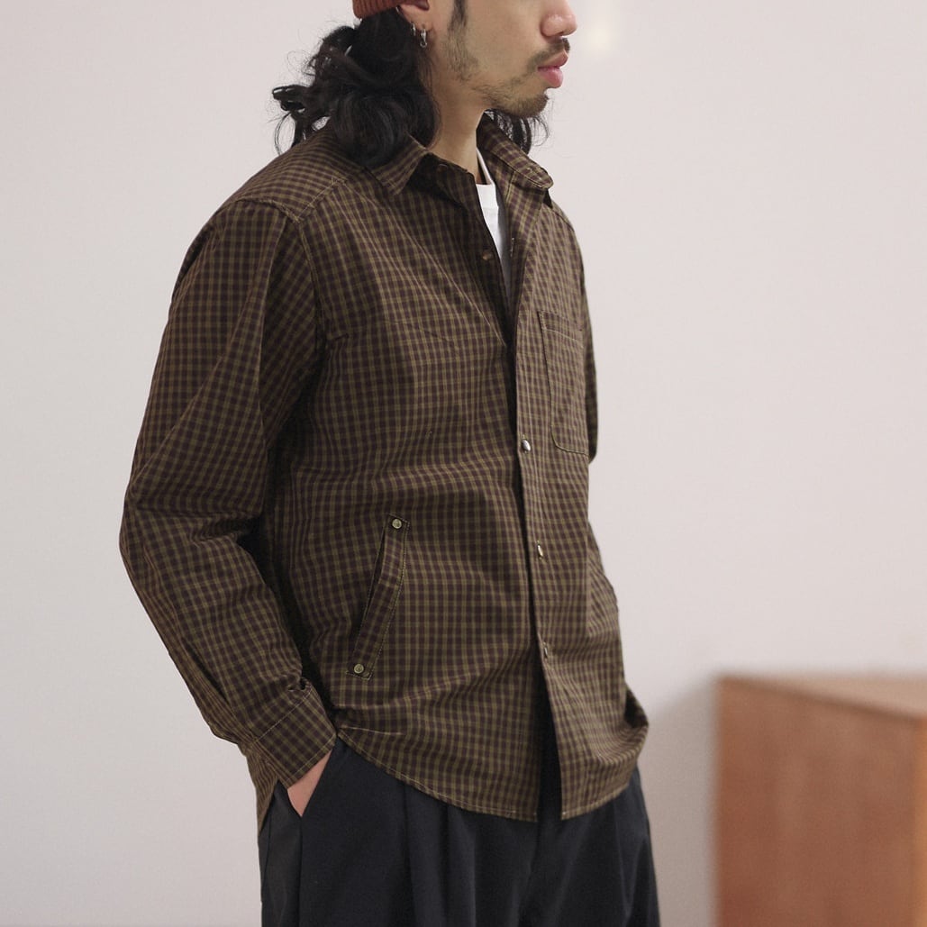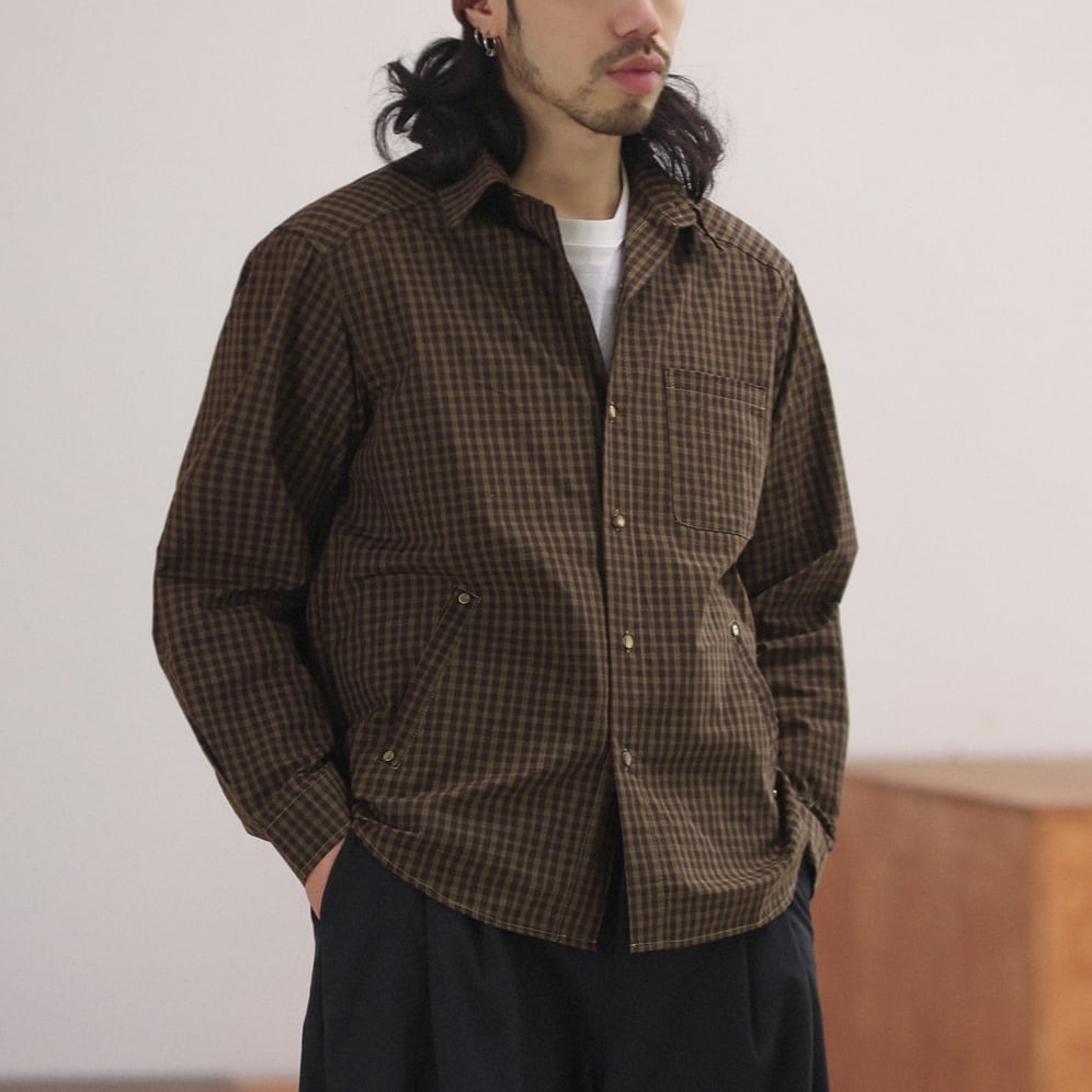 落ち着いたチェック柄をベースに、リベットの付いた腰元のポケットや左胸のポケットがポイントになったカジュアルシャツ。