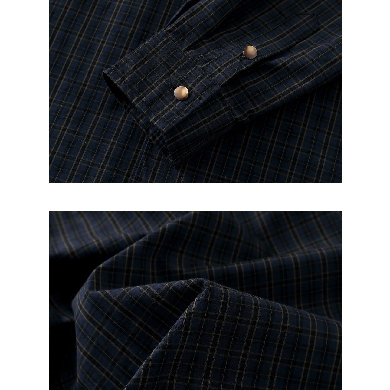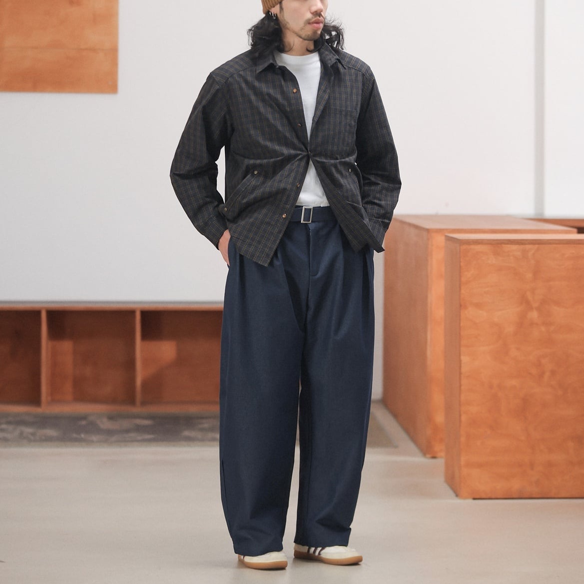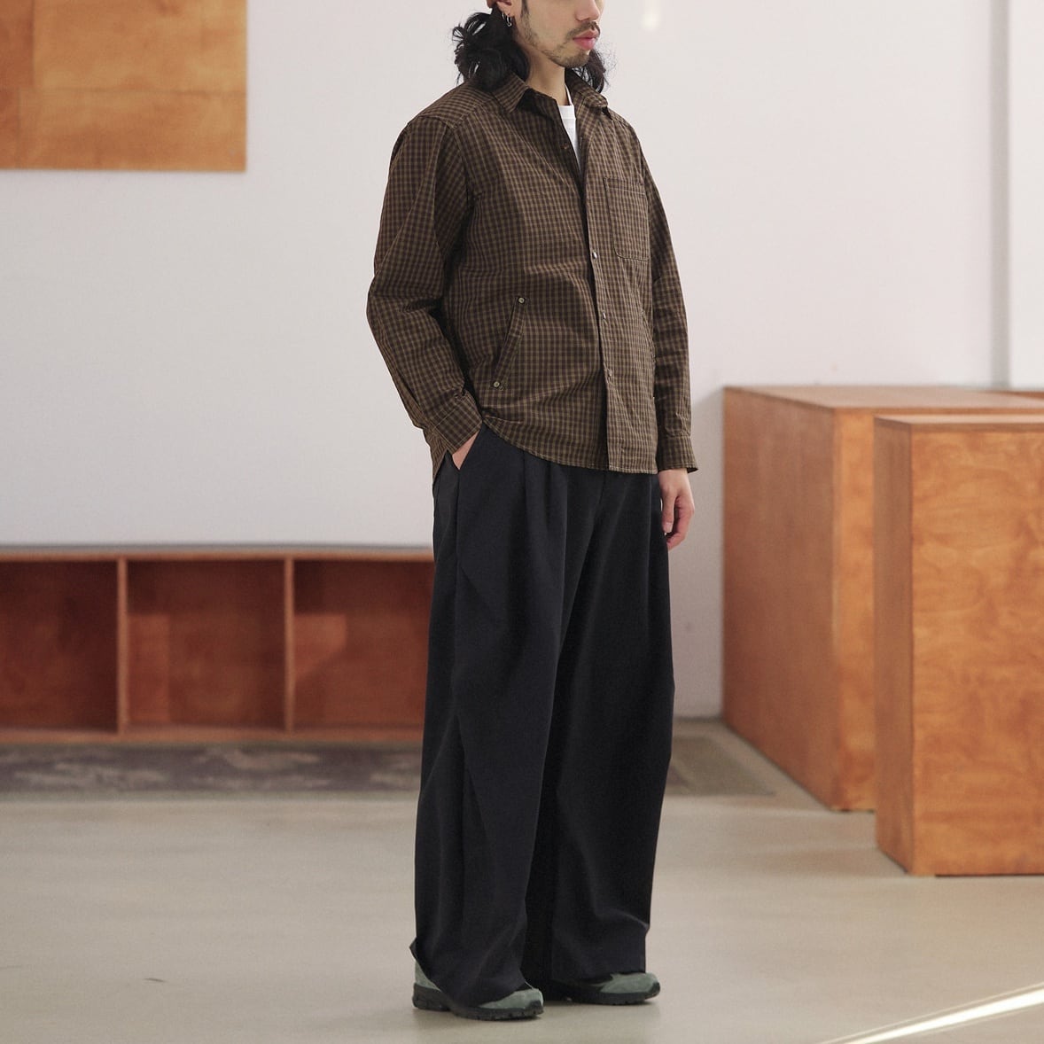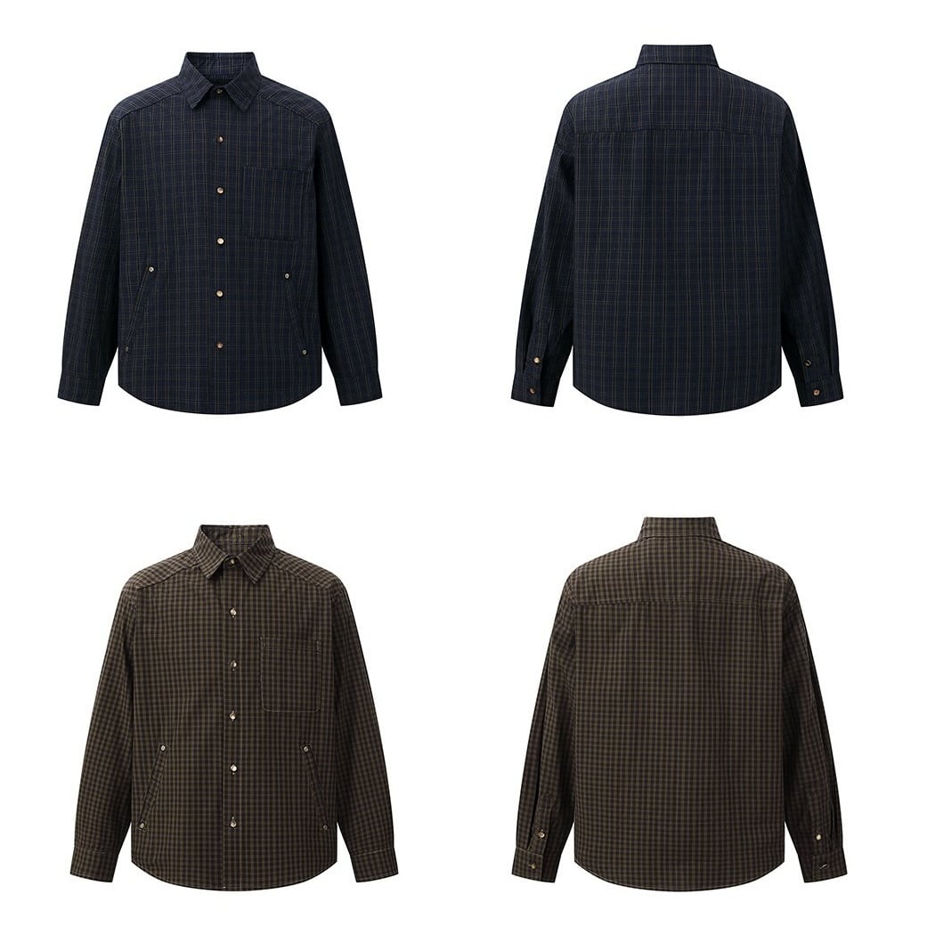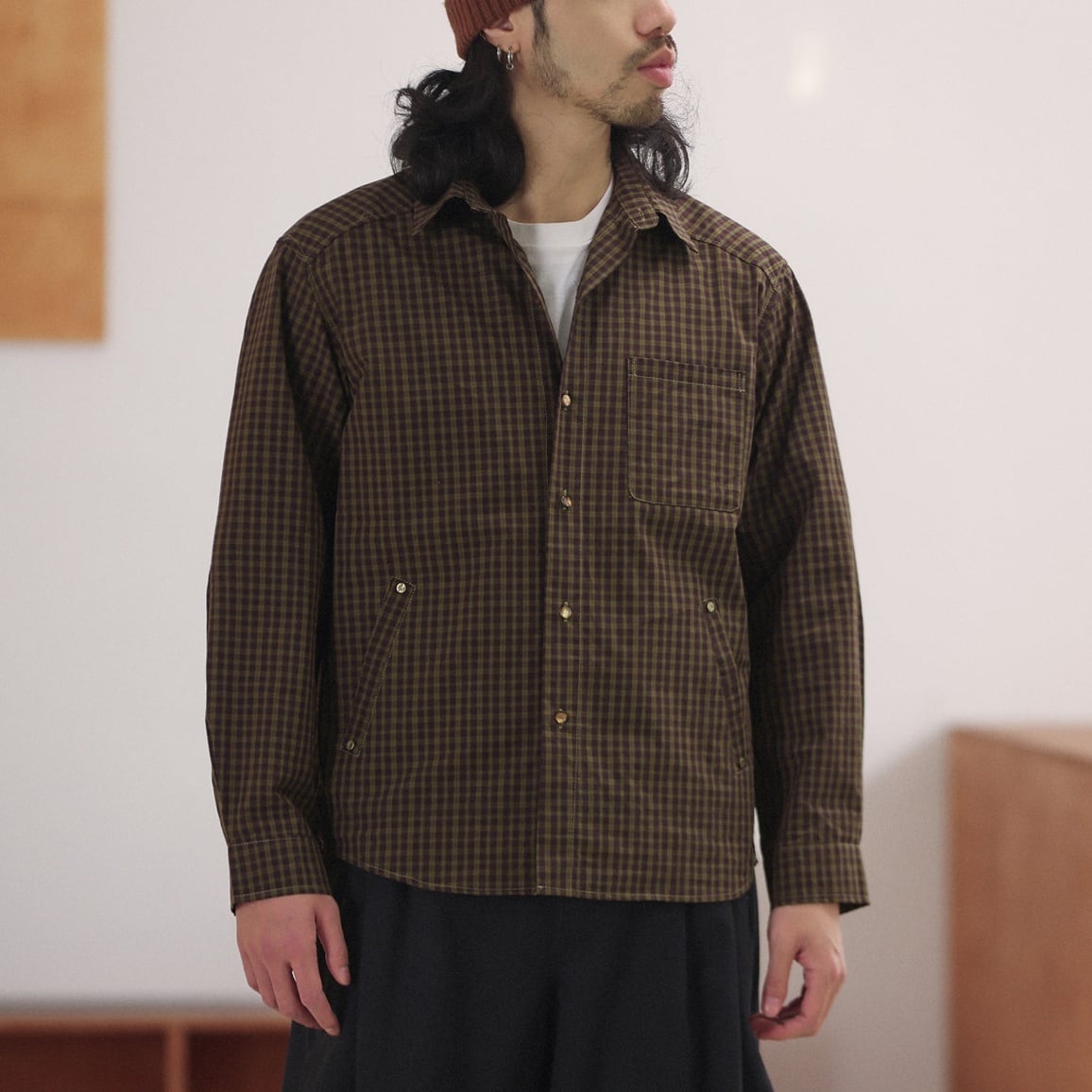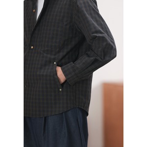 落ち着いたチェック柄をベースに、リベットの付いた腰元のポケットや左胸のポケットがポイントになったカジュアルシャツ。