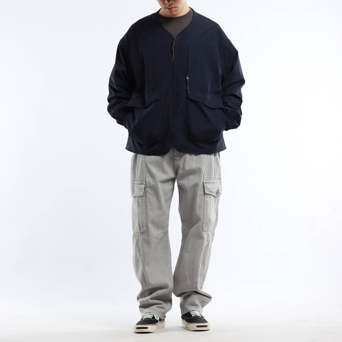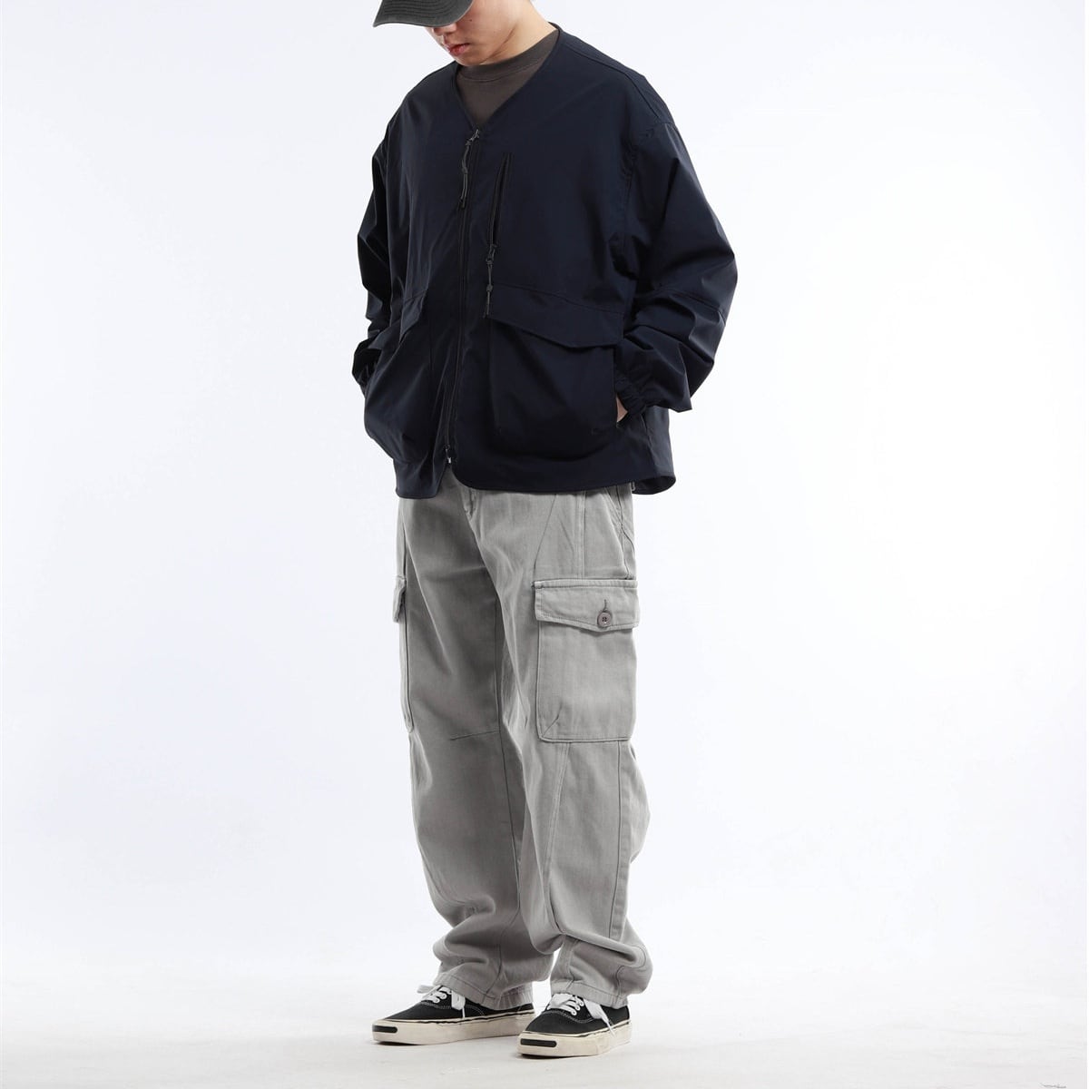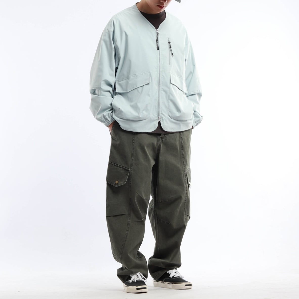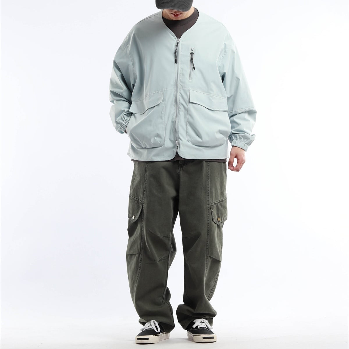 首まわりがすっきり見えるため、カジュアルなストリートスタイルにも自然に合わせやすい仕上がりです。