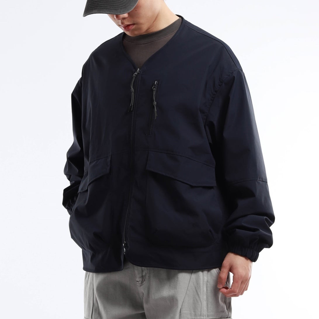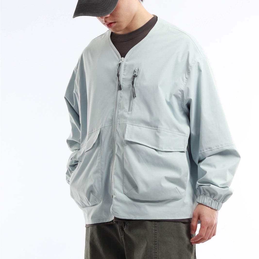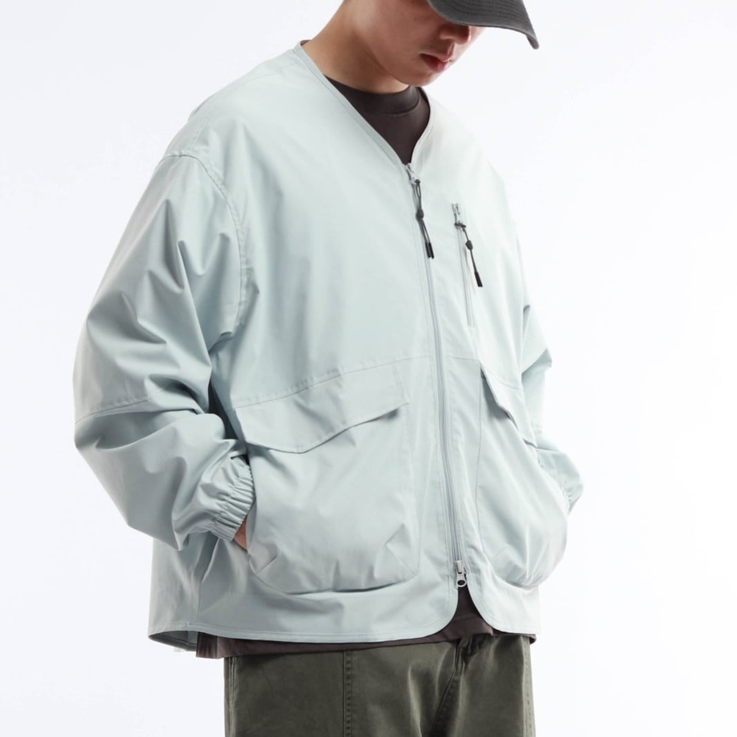 襟のないノーカラーデザインが特徴のジャケット。