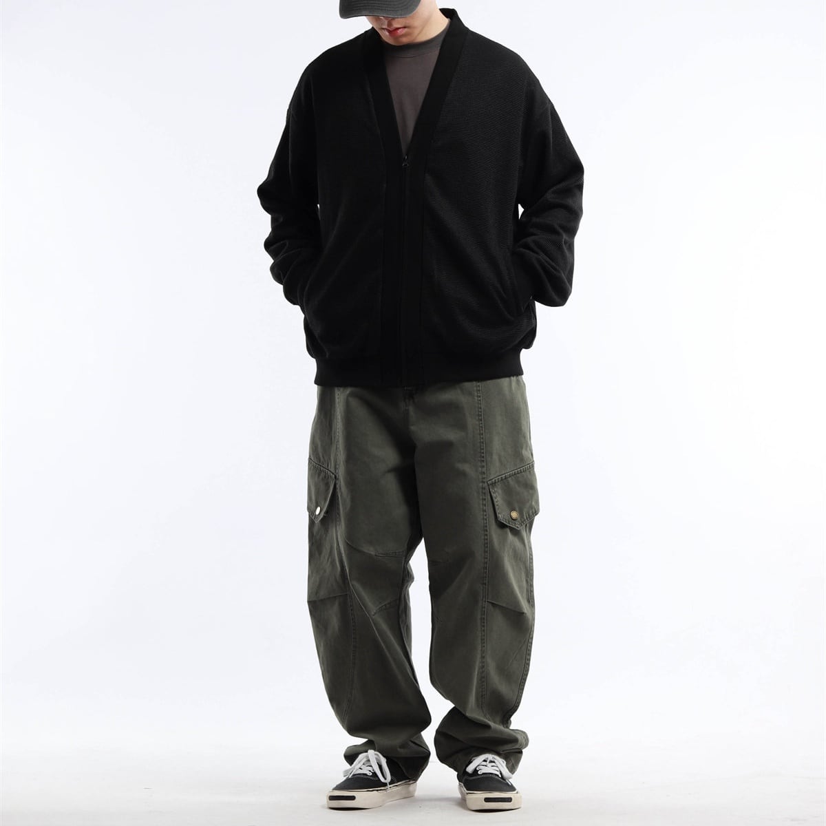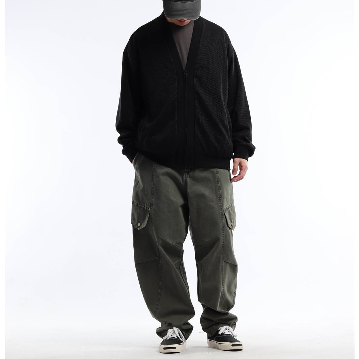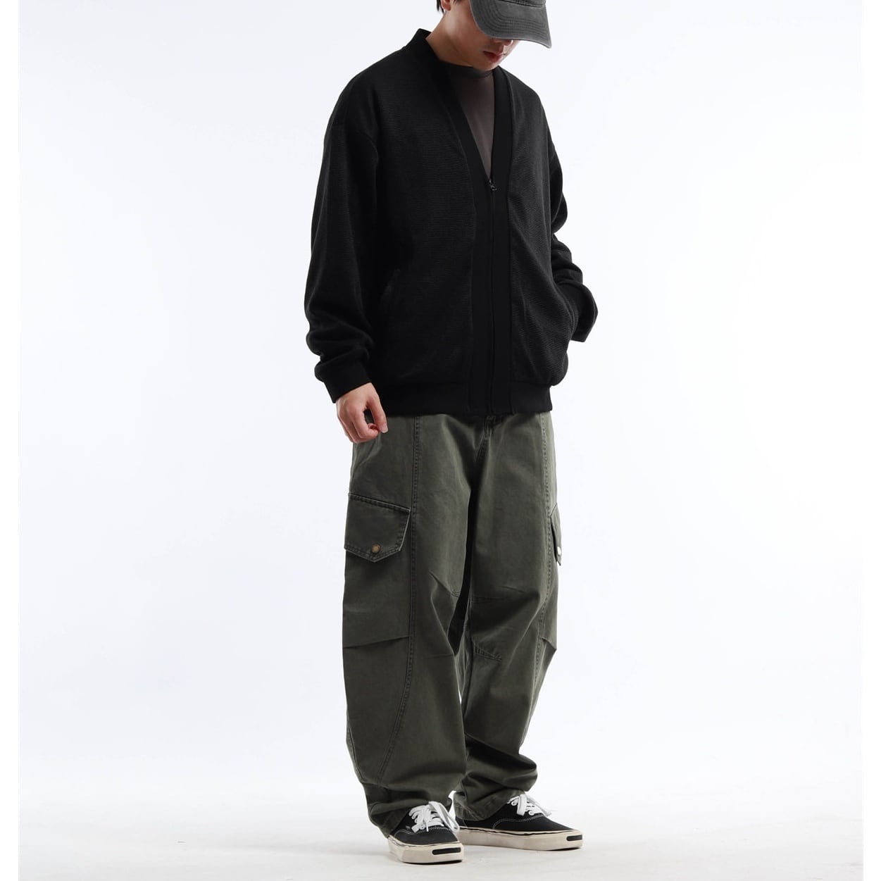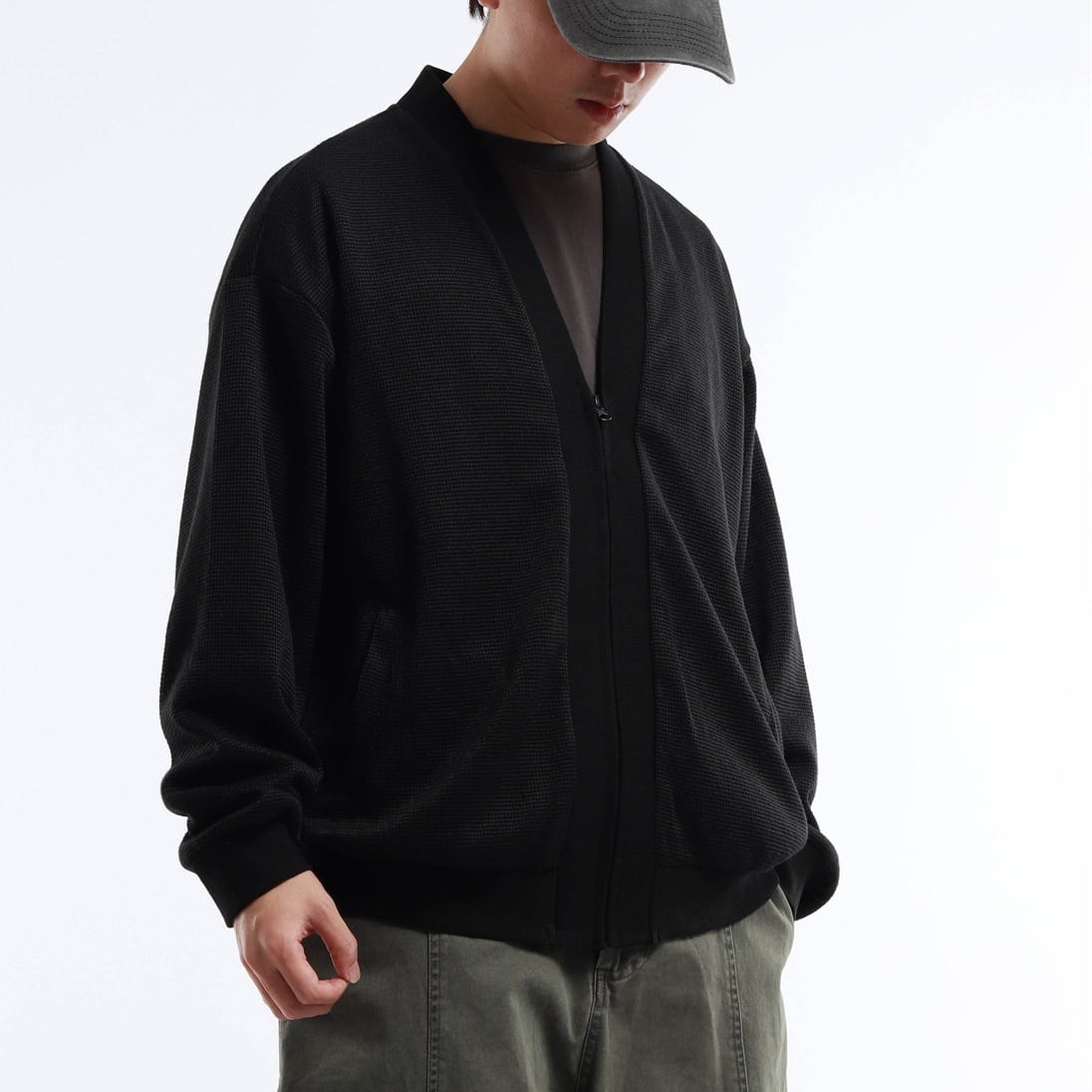 ワイドシルエットのジップカーディガン。