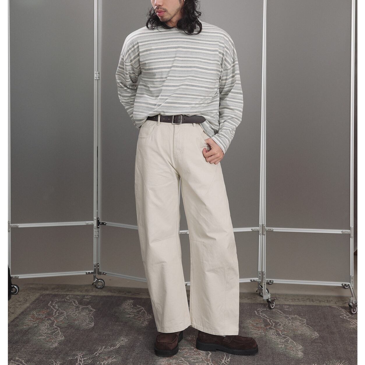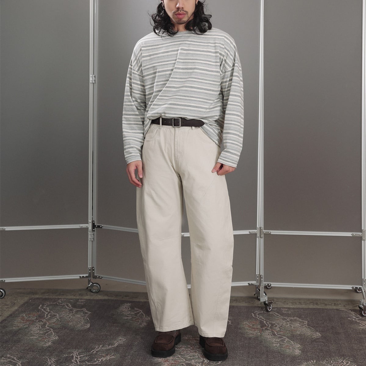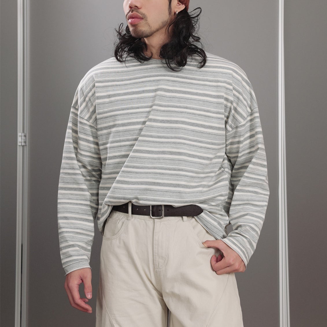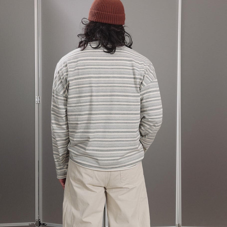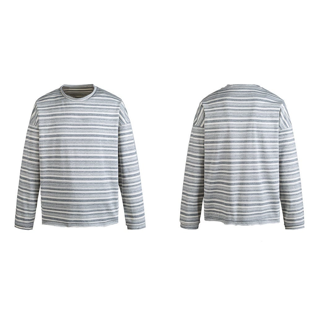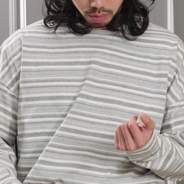 落ち着いたグレーストライプが印象的なロングスリーブTシャツ。