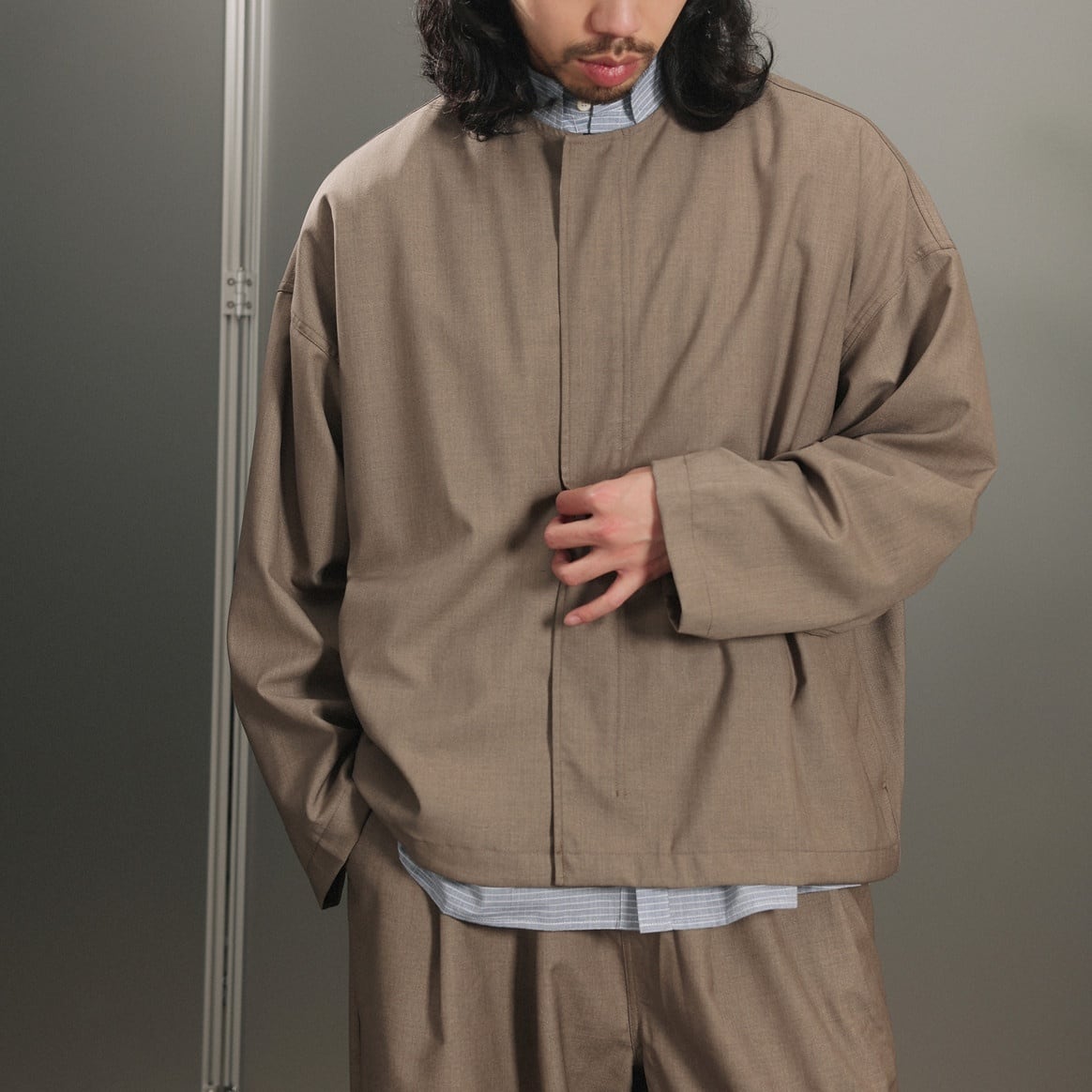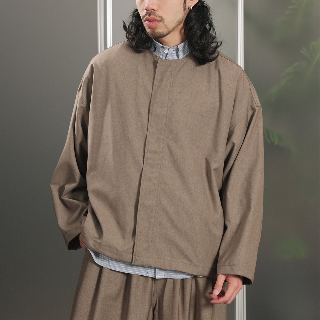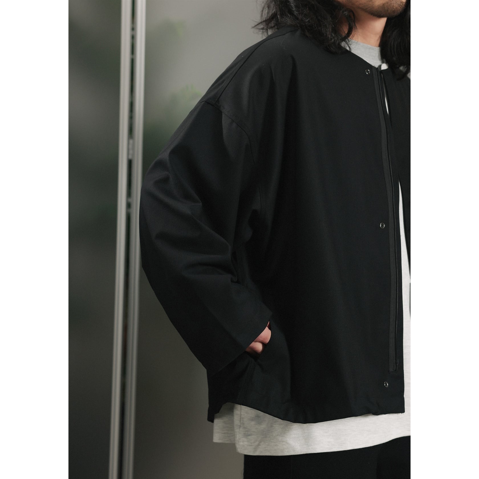 ノーカラーデザインですっきりとした印象のジップジャケット。
