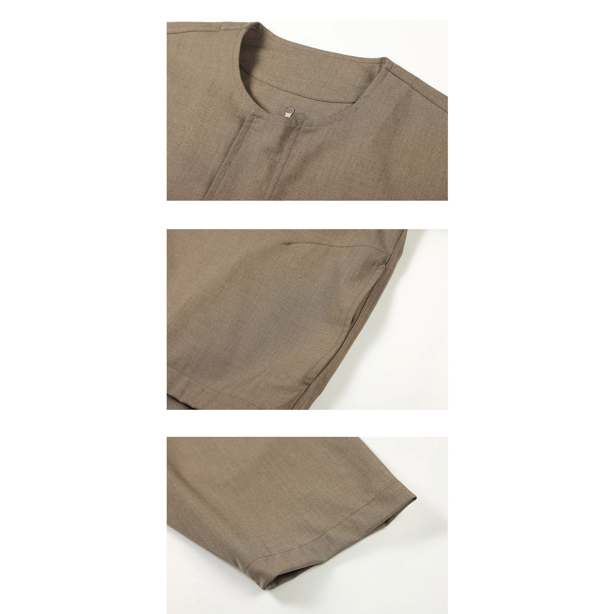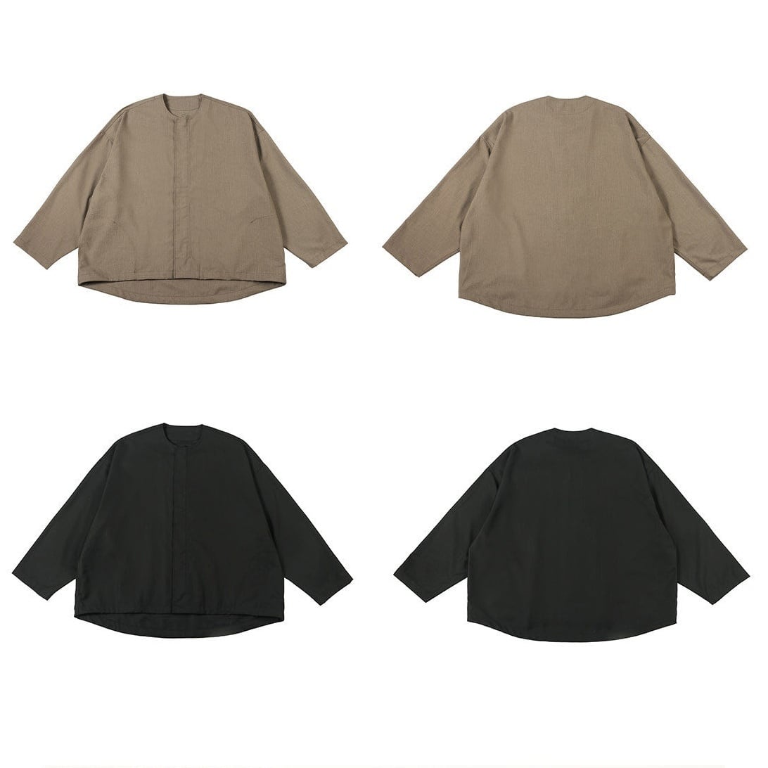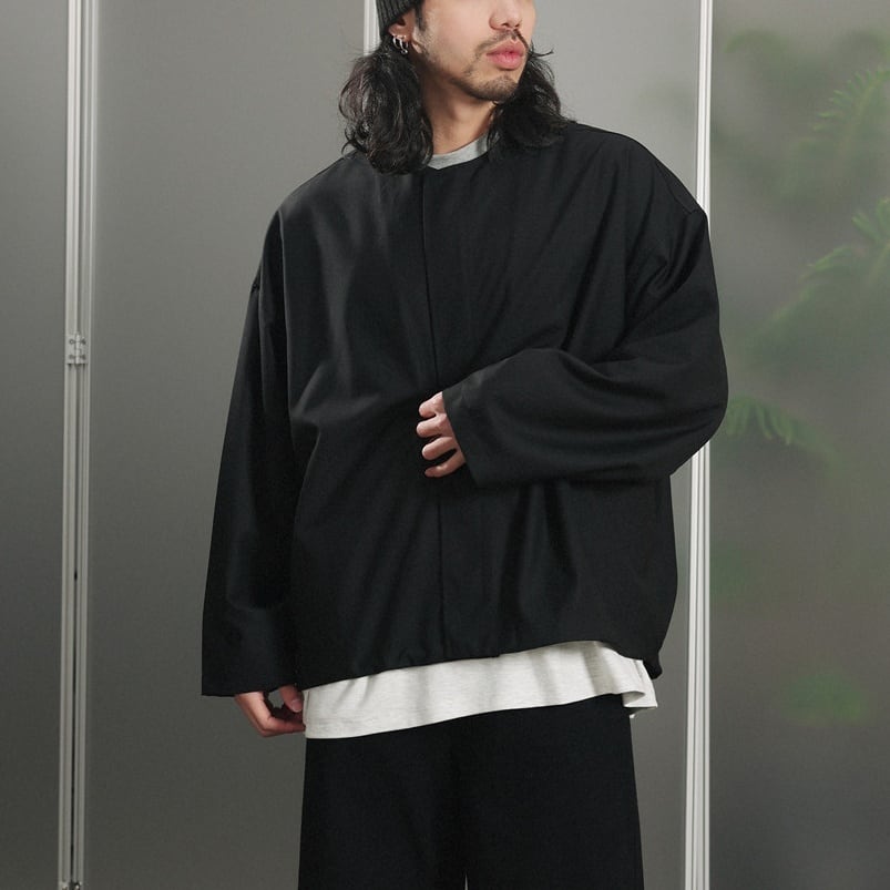 襟のないミニマルなデザインがスタイリッシュで、ドレープ感のある生地が大人っぽい雰囲気を演出します。