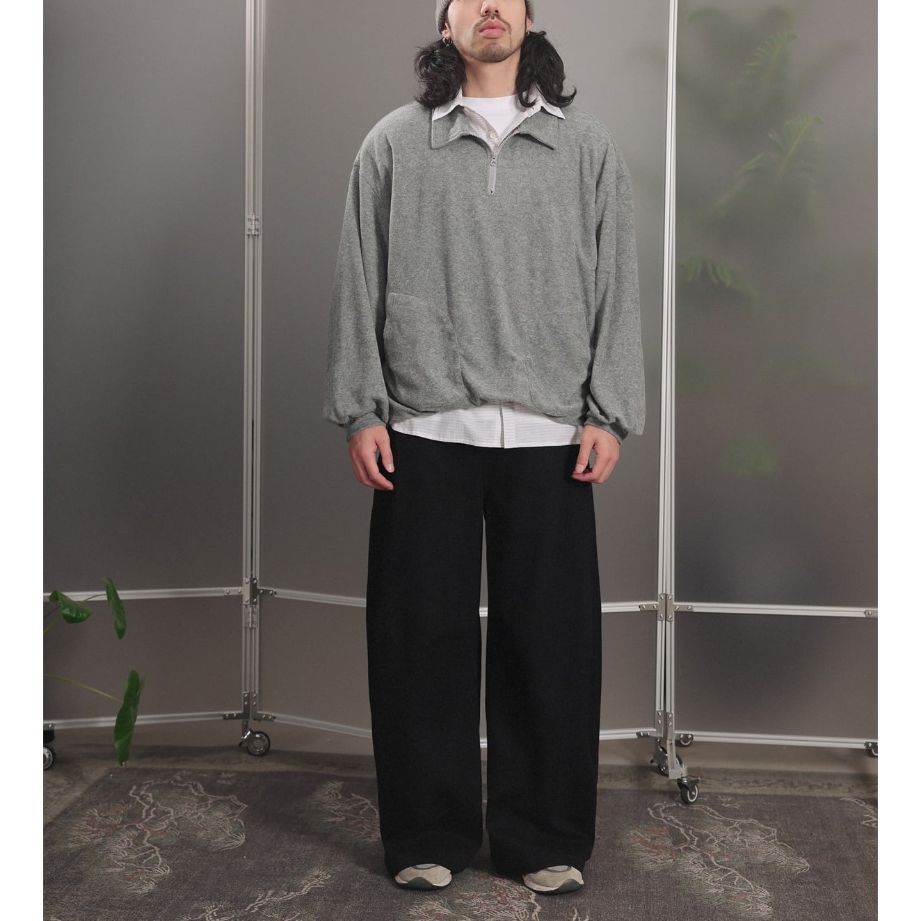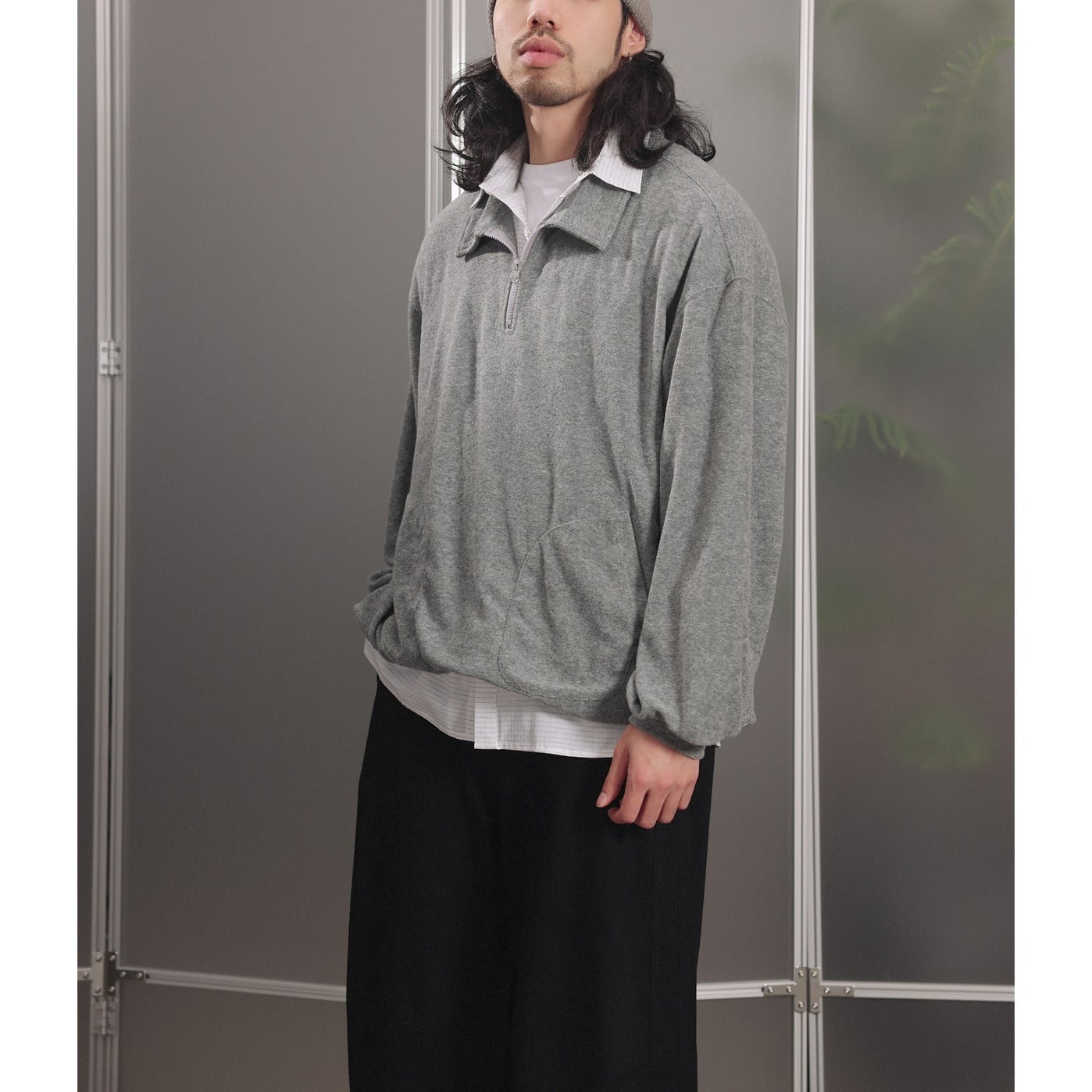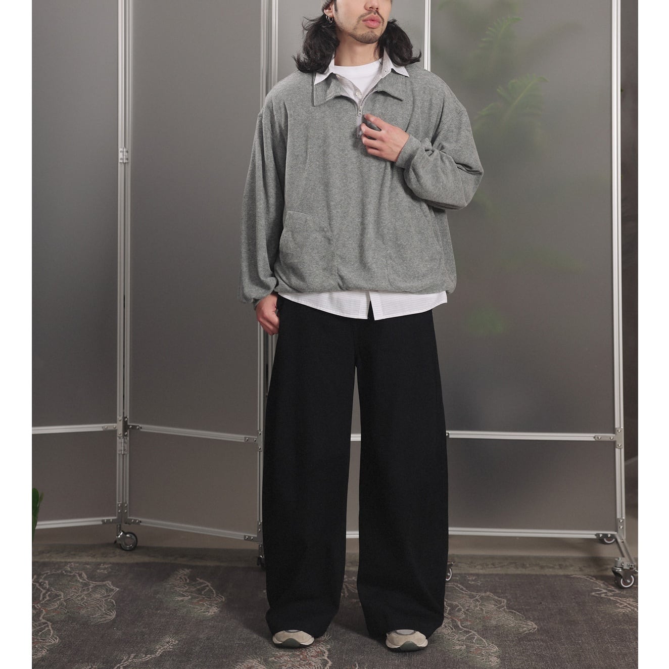 カラーは落ち着いたグレーとネイビーの2色展開で、ゆったりとしたルーズシルエットでリラックス感のある着心地。