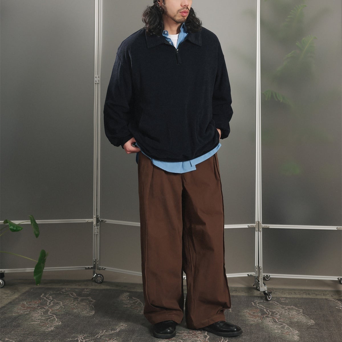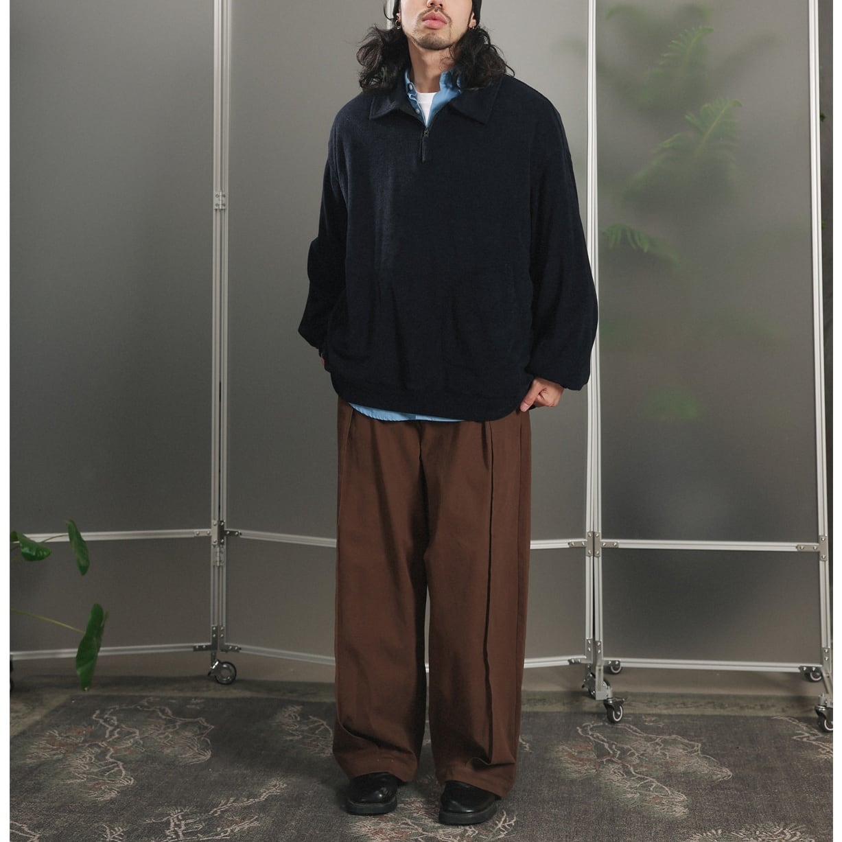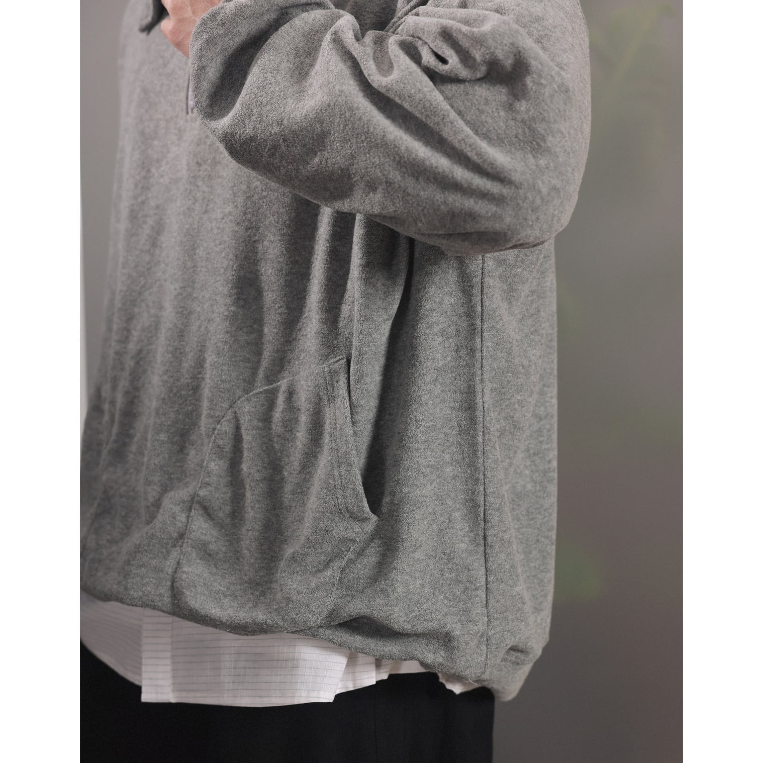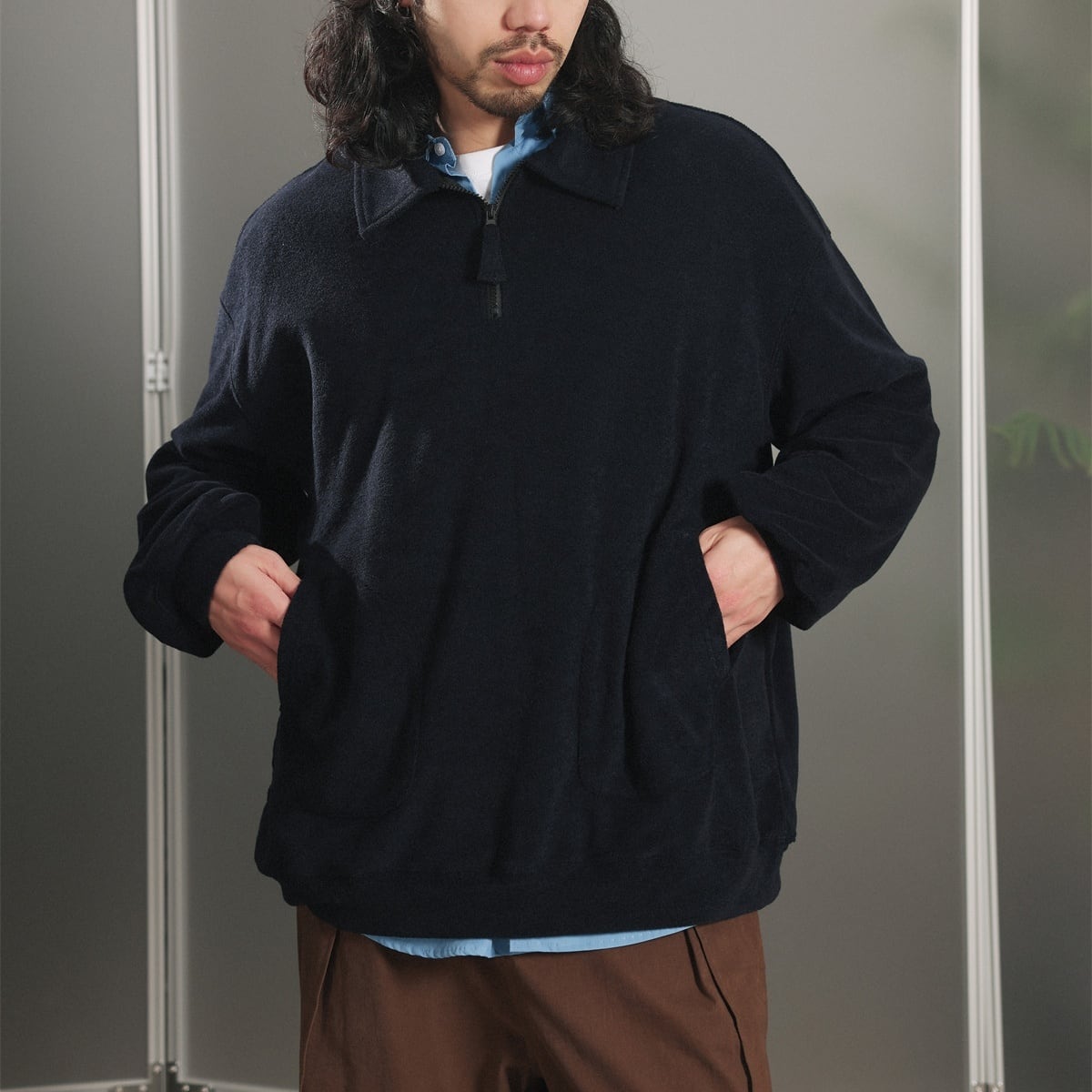 カラーは落ち着いたグレーとネイビーの2色展開で、ゆったりとしたルーズシルエットでリラックス感のある着心地。