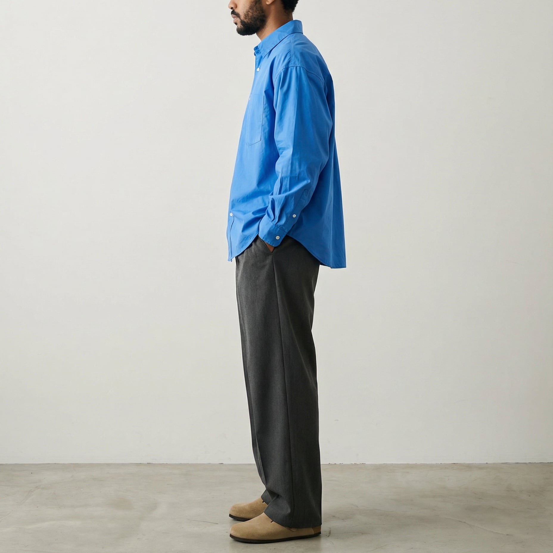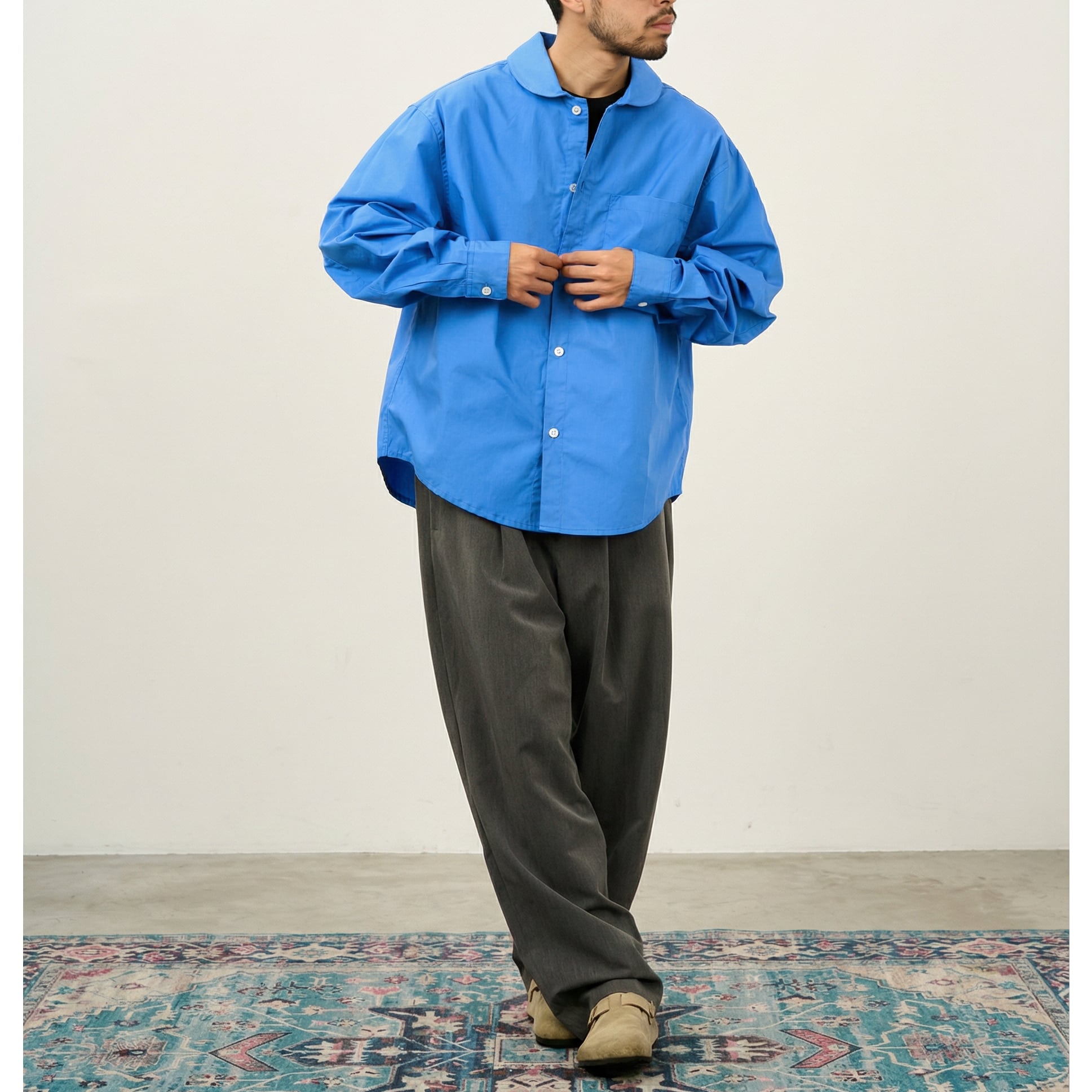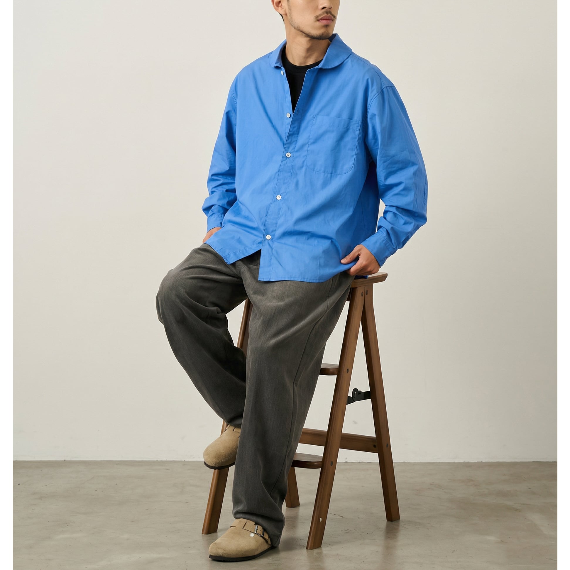 鮮やかな青色が目を引くワイドシルエットの長袖シャツ。