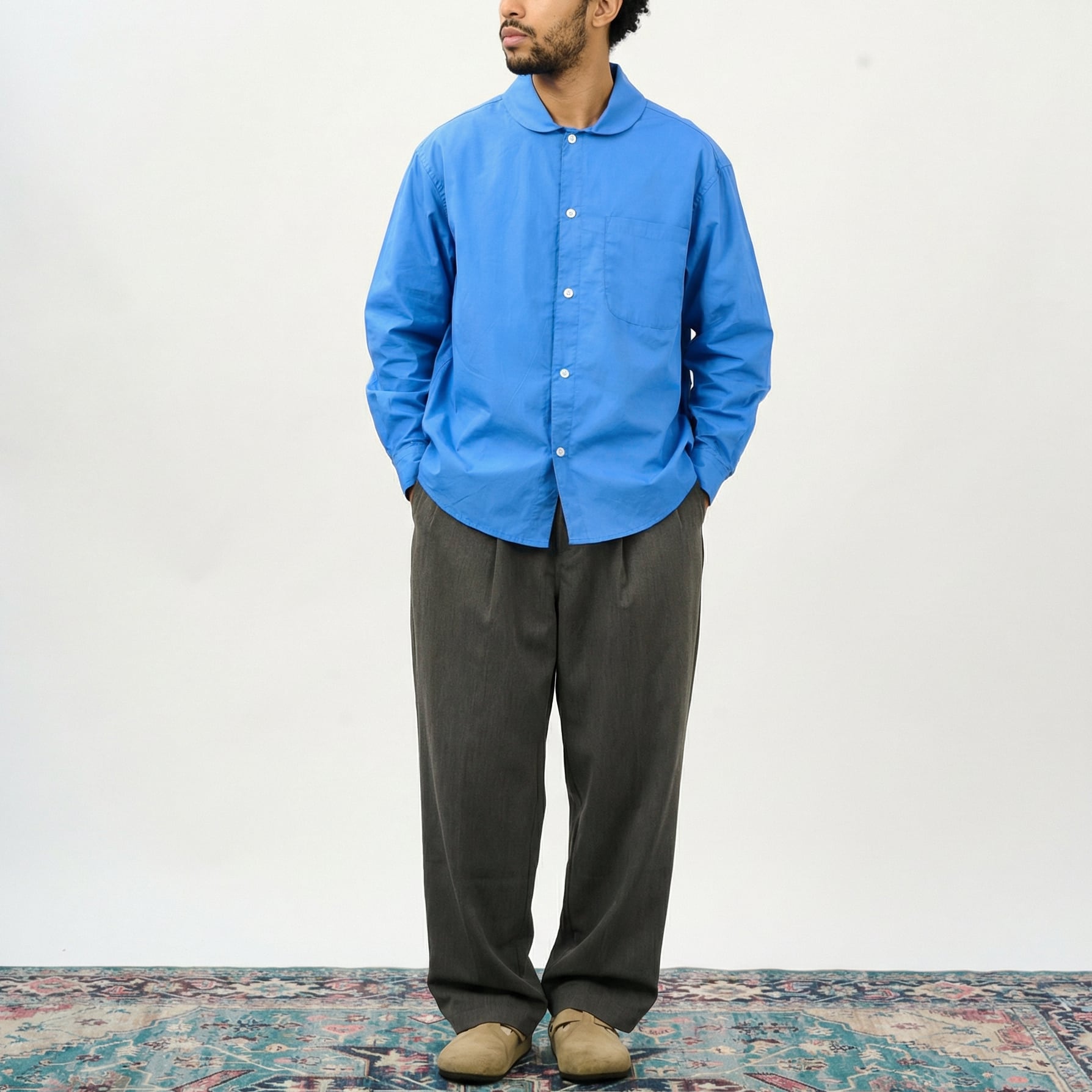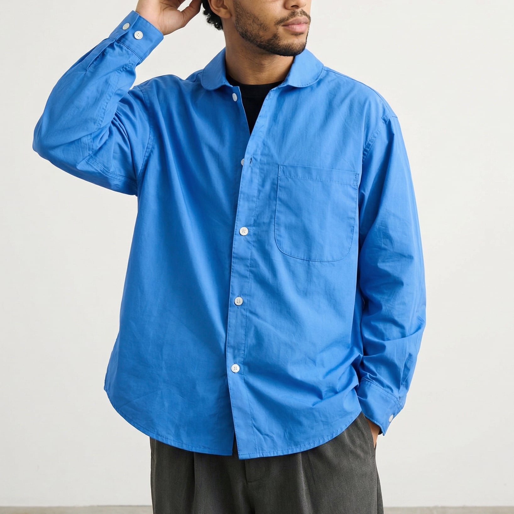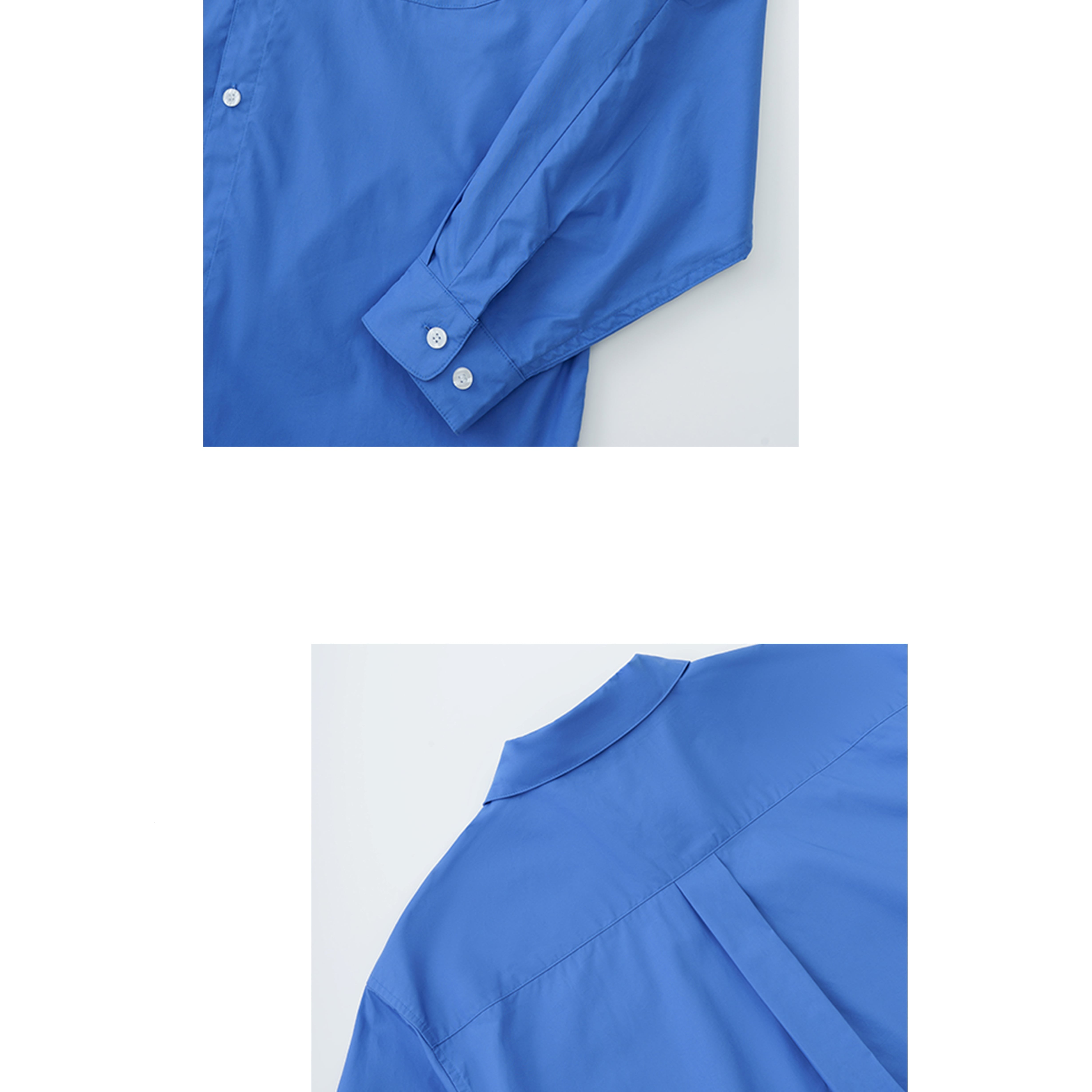 鮮やかな青色が目を引くワイドシルエットの長袖シャツ。