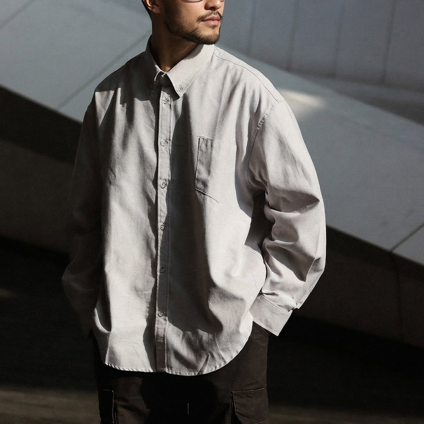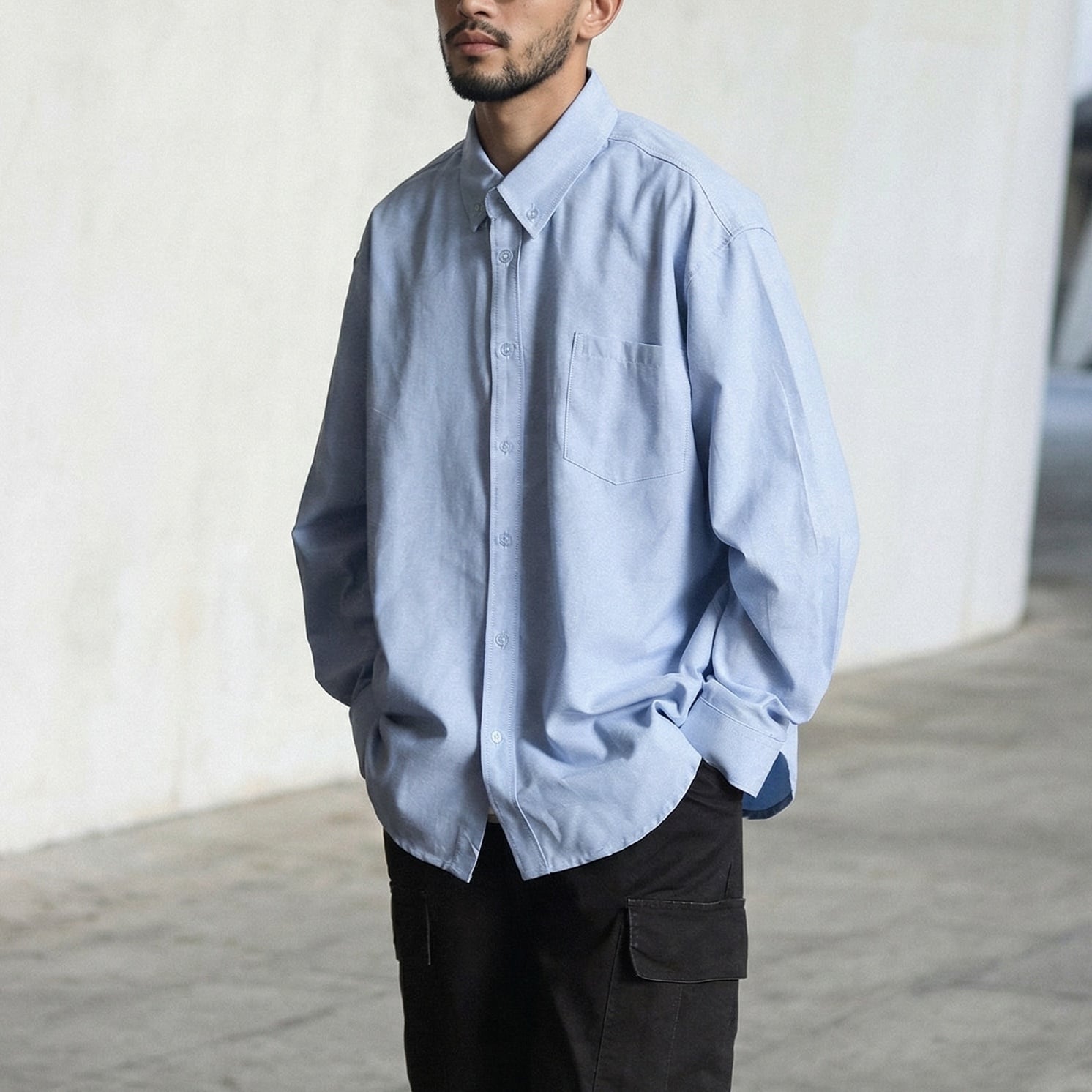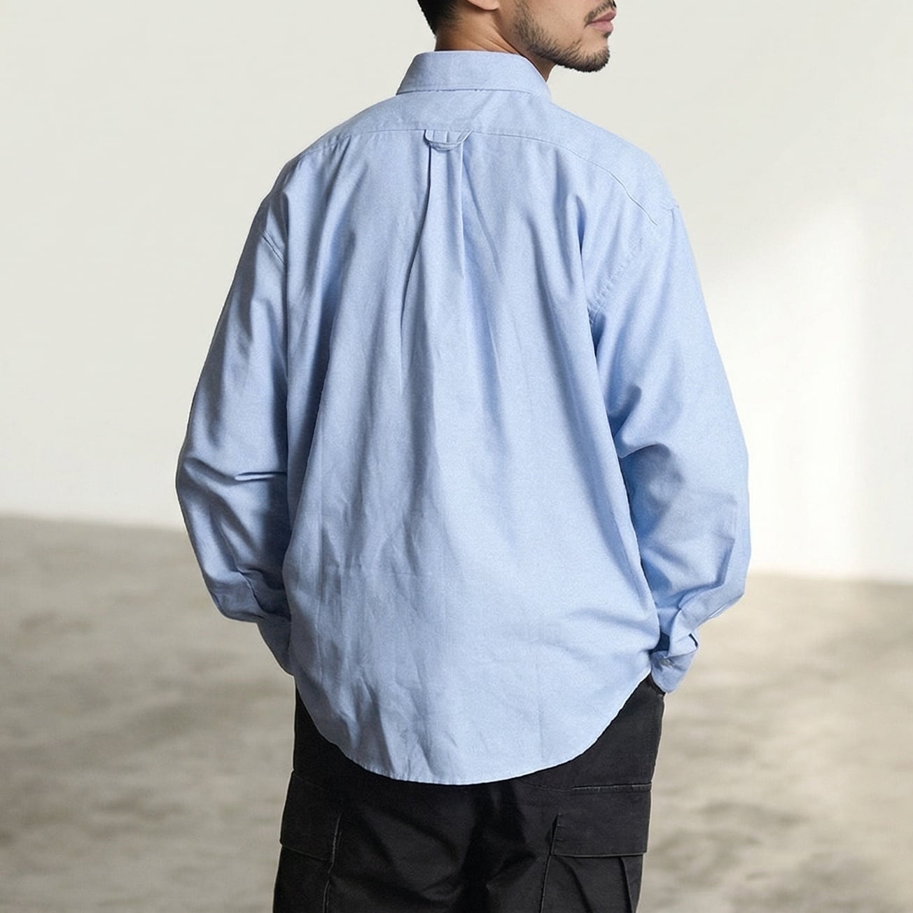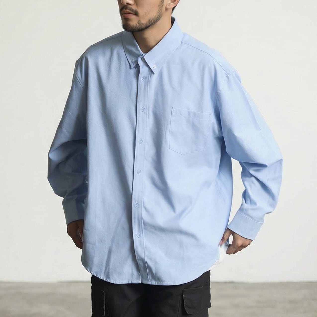 シンプルで着回しやすい無地デザインのボタンダウンカジュアルシャツ。