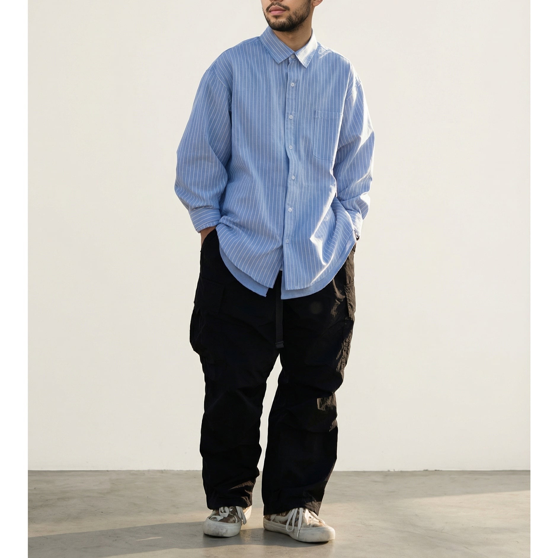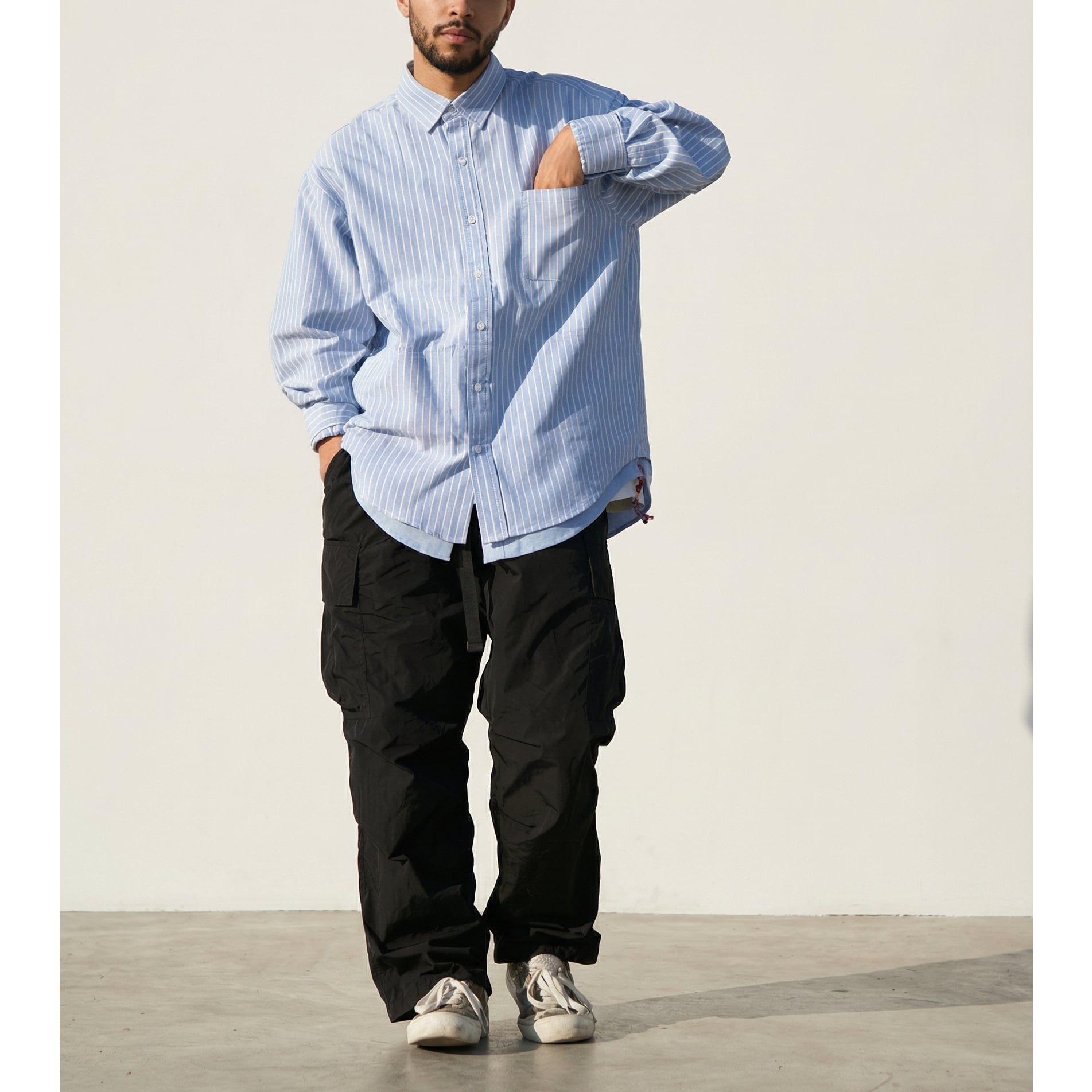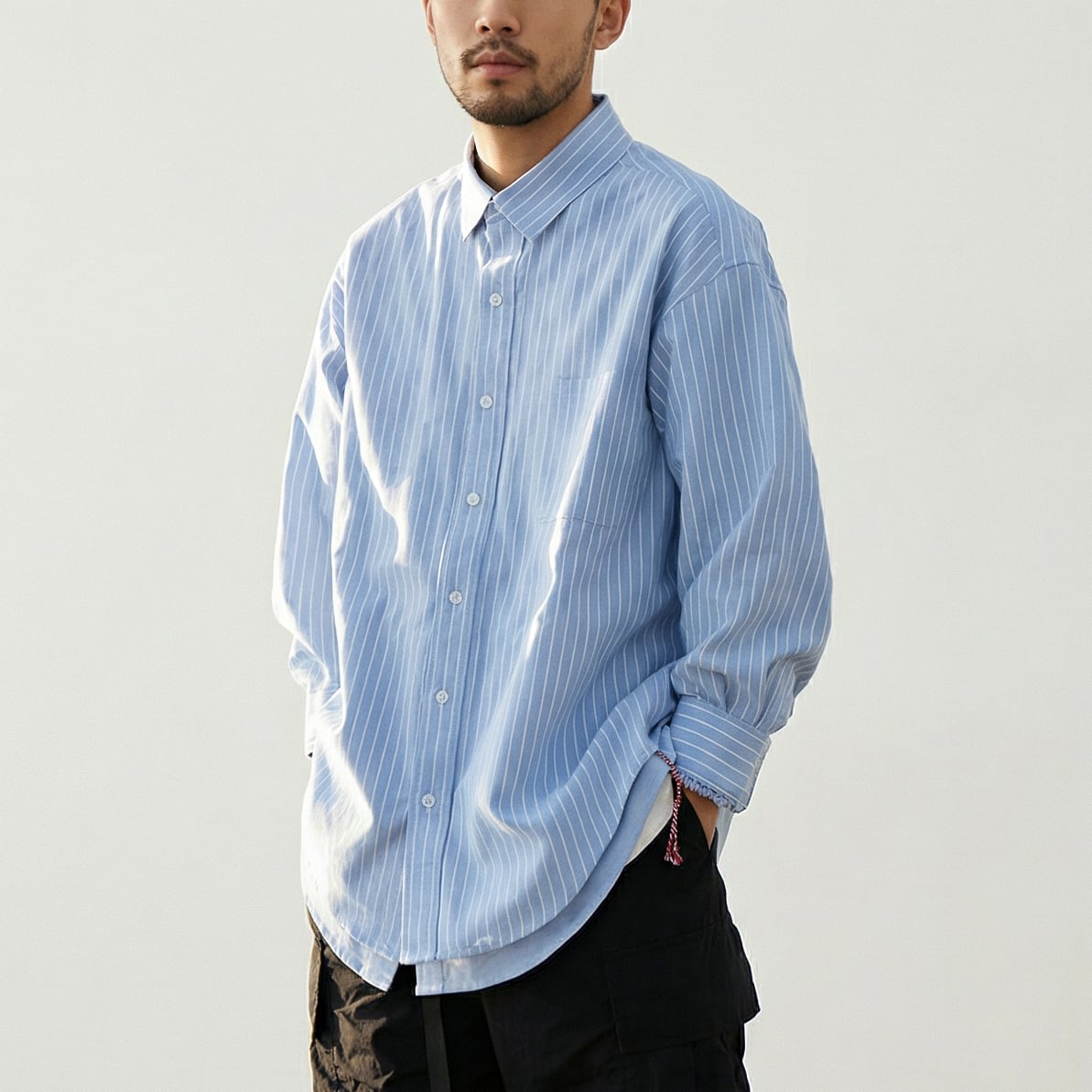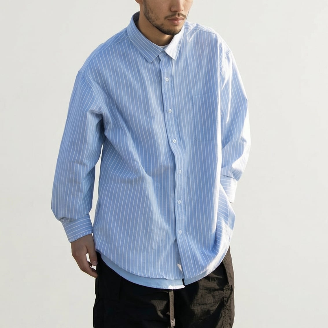 重ね着風の仕様になっており、ストライプシャツの下に無地のシャツを着ているように見えるデザインが特徴。