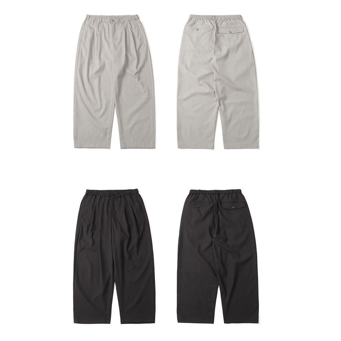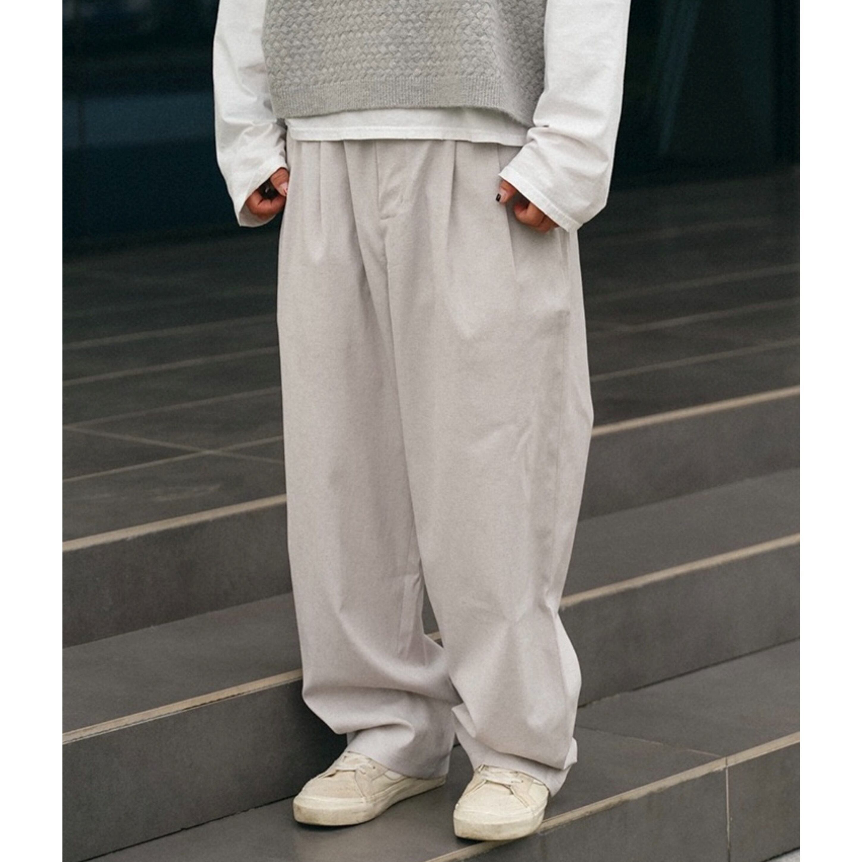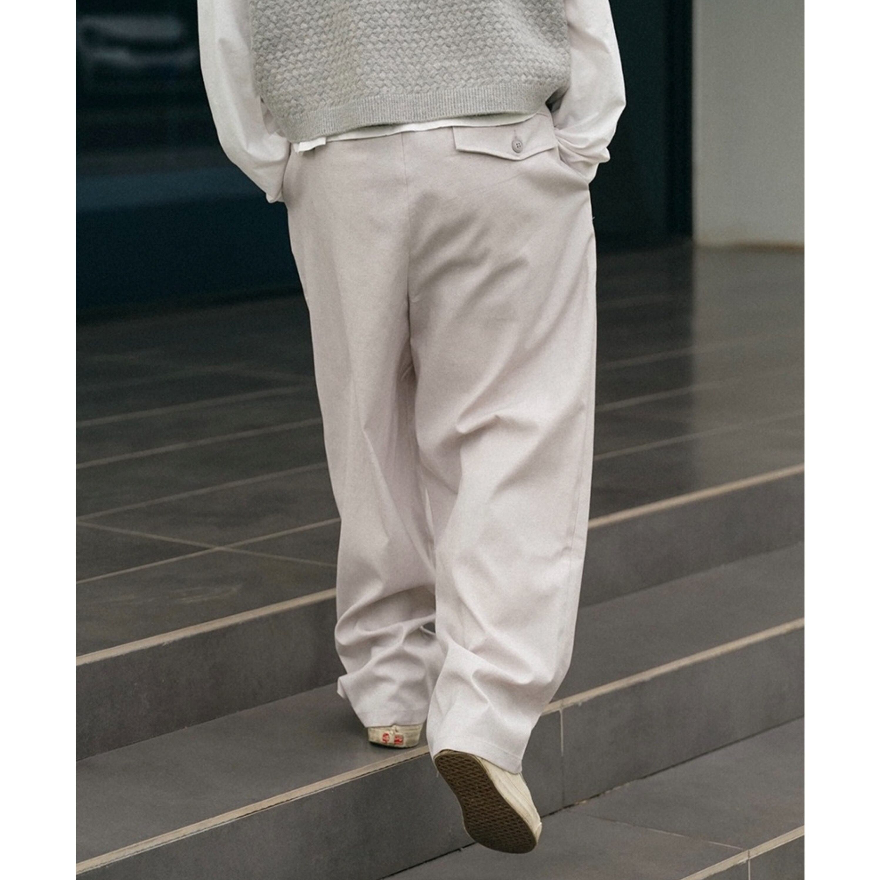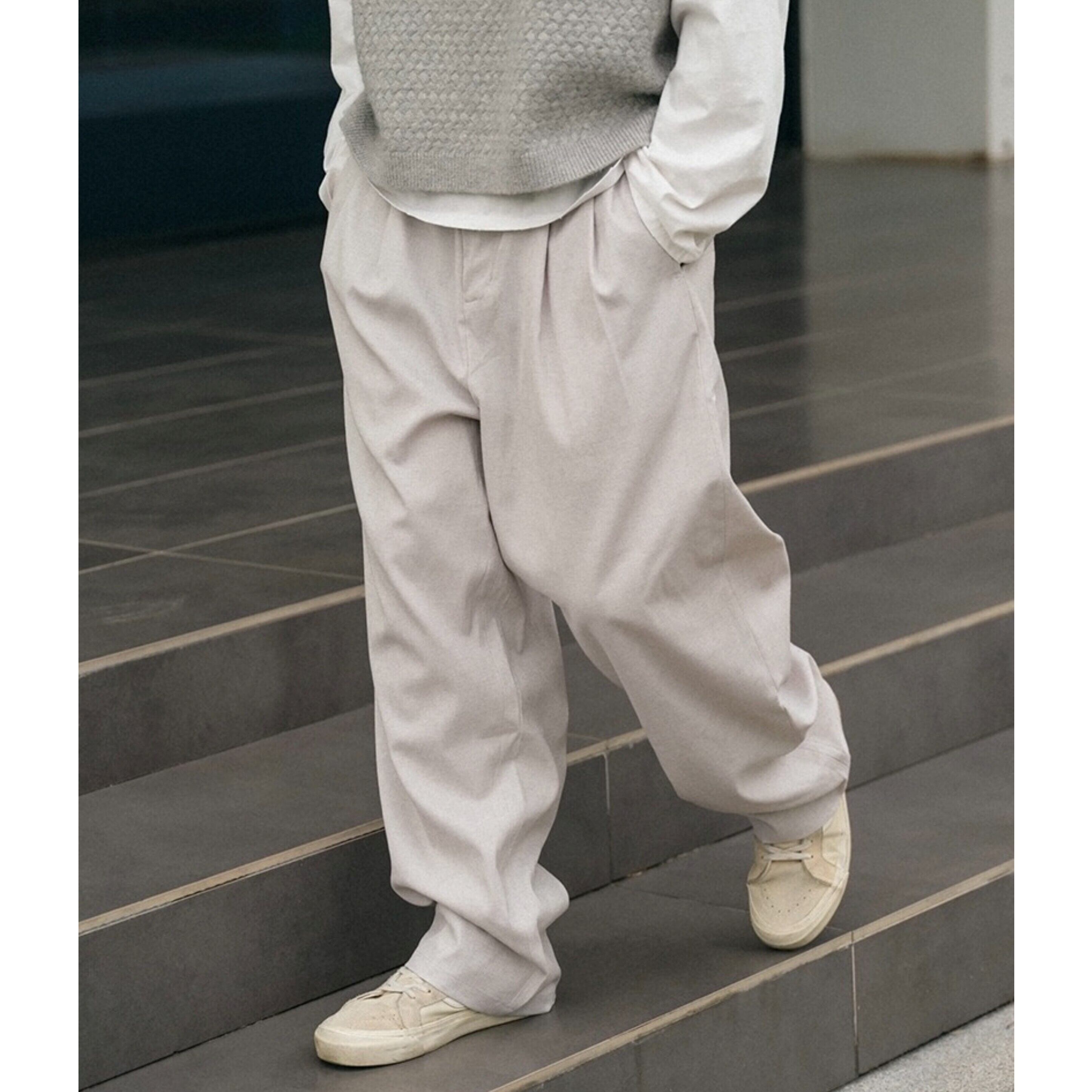 ゴム仕様のウエストで快適さを備えたワイドストレートシルエットのカジュアルパンツ。