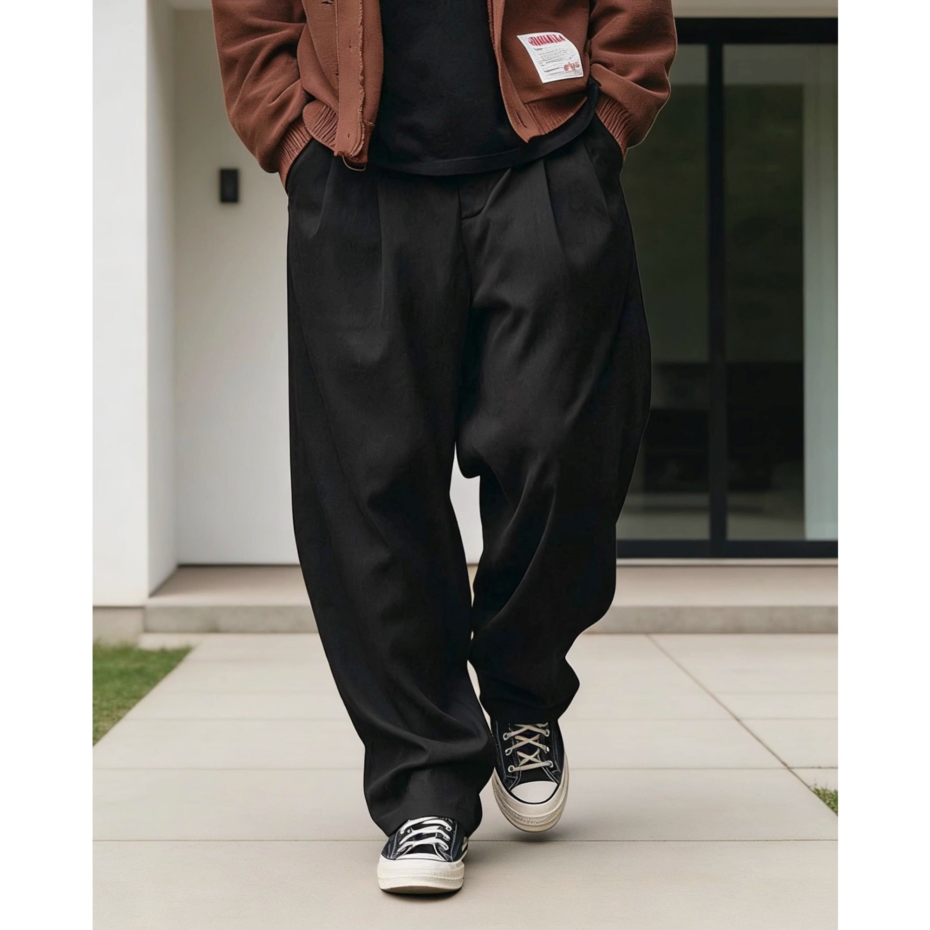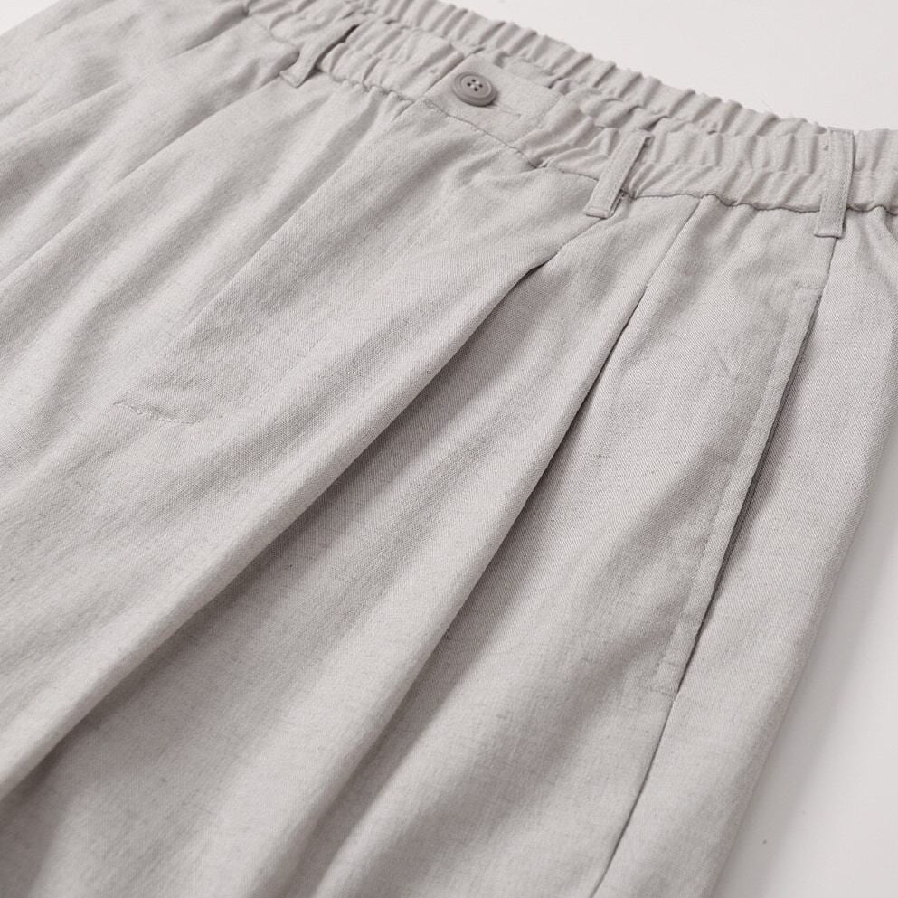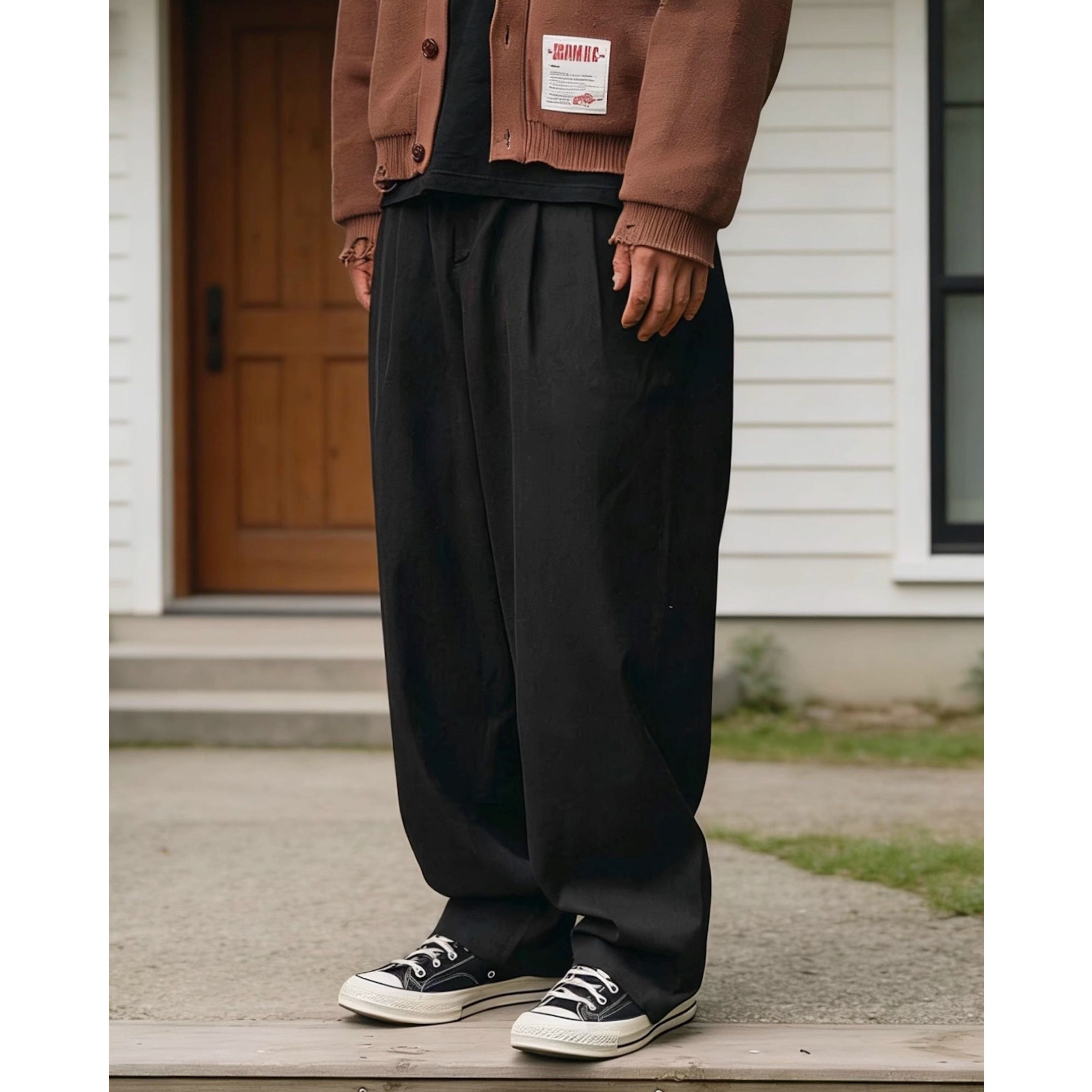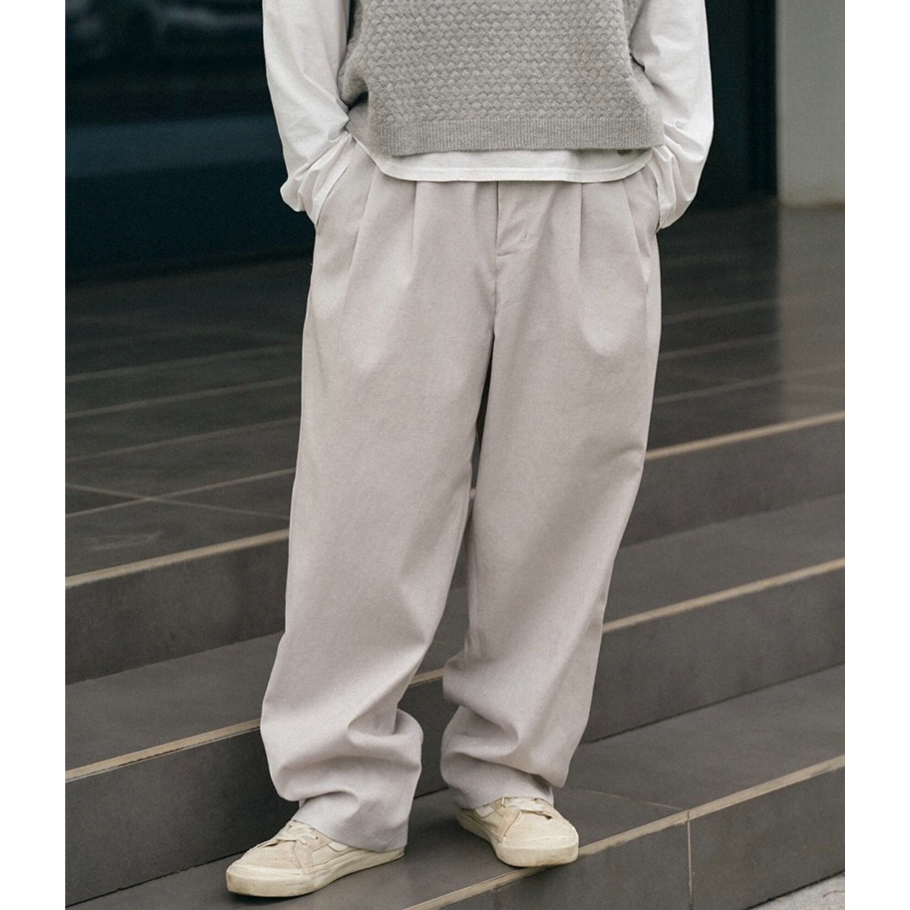 ゴム仕様のウエストで快適さを備えたワイドストレートシルエットのカジュアルパンツ。