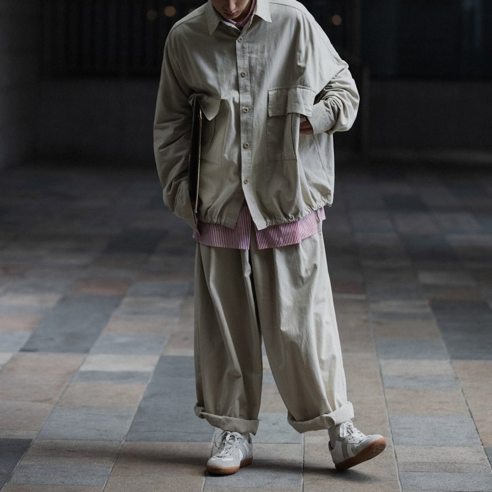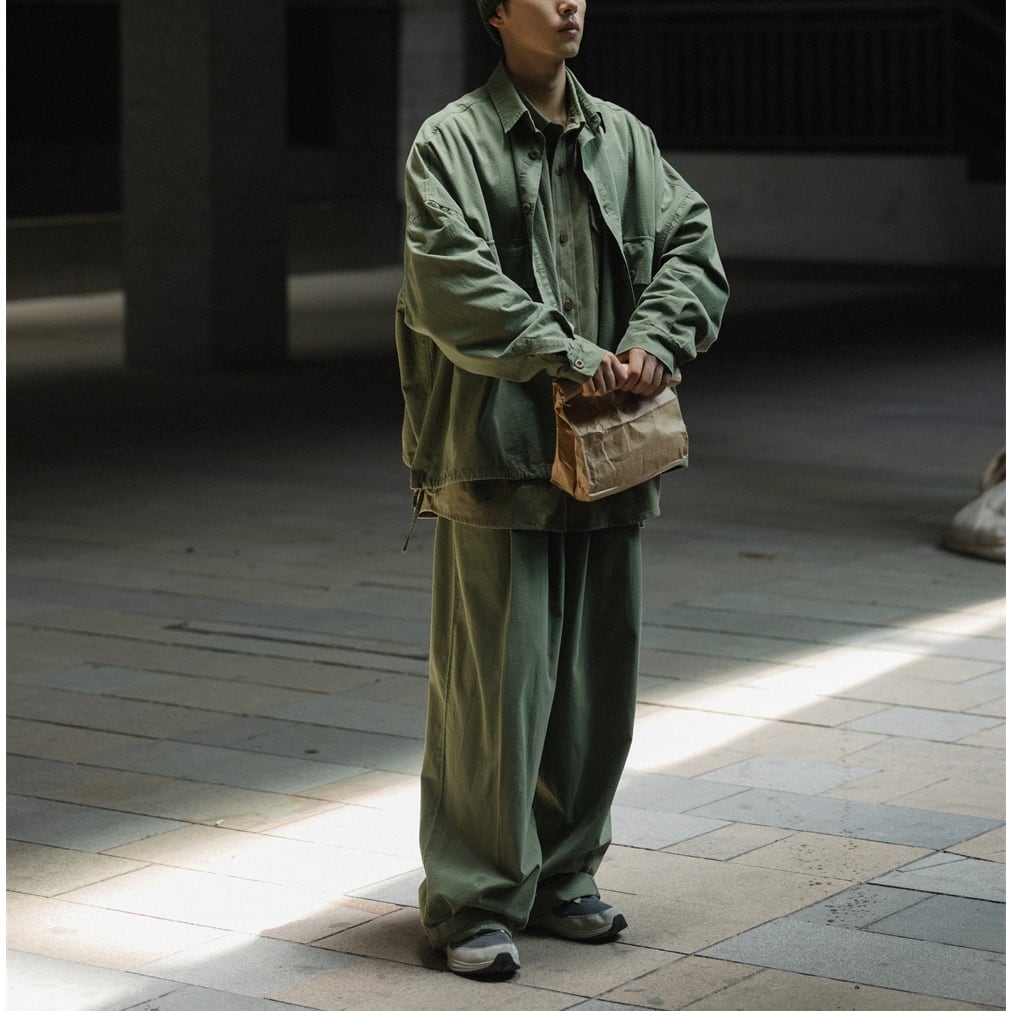 ワイドシルエットのイージーミリタリーパンツ。 腰元のタックディテールや裾のステッチなど細かいディテールがポイントになっています。 ワイドシルエットのトップスと相性が良くタックインしたスタイリングもしやすい一着です。 ■ color オフホワイト (ベージュ系のホワイトでございます、置き画像の色味を参考にしてください) オリーブ ■ material コットン ■ size M / L / XL M :ウエスト72-98cm ヒップ144cm 総丈100cm L :ウエスト76-102cm ヒップ148cm 総丈102cm XL :ウエスト80-106cm ヒップ152cm 総丈104cm ※採寸方法により多少の誤差がある場合がございます ■モデル身長:178cm ■着用サイズ : XL [ 商品管理番号:a-0643] 【お買い物にあたっての注意事項】ご購入前にこちらをご覧ください。 https://store.path-online.shop/about ▶<PATH>TOP PAGEから、新商品やお得な情報をチェック! https://store.path-online.shop/ ▶【Instagram】公式インスタグラムページはこちら。 https://www.instagram.com/path_official_jp/