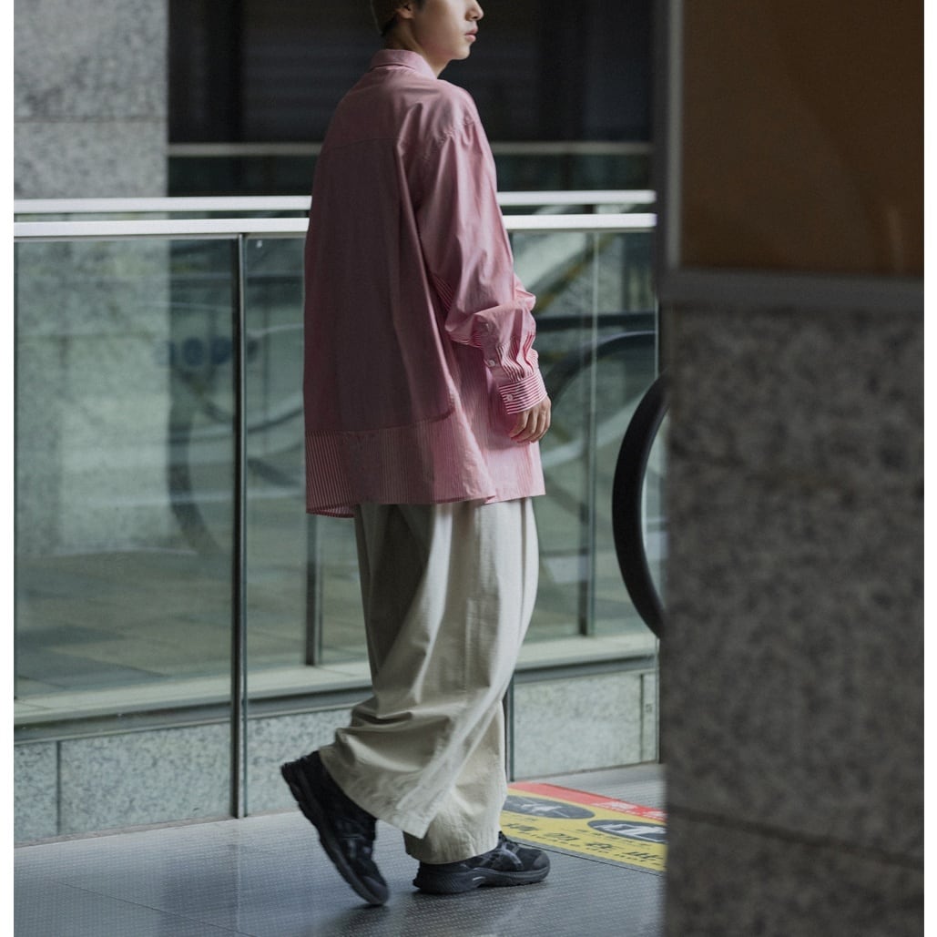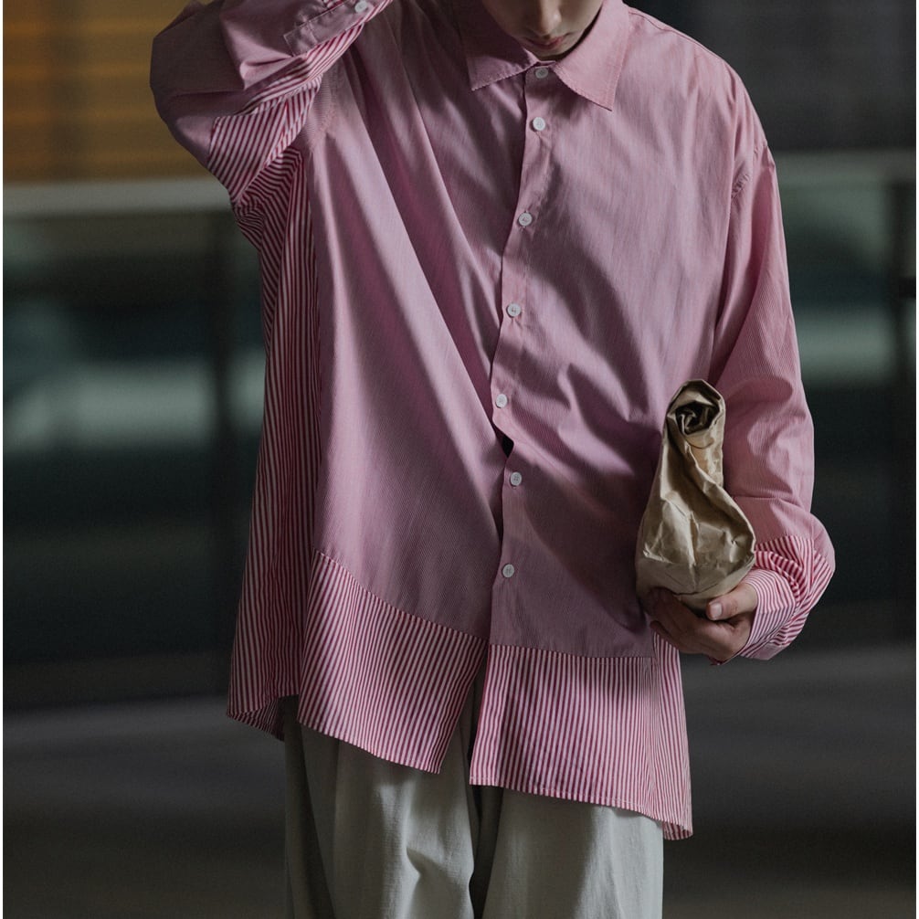 太さの異なるストライプ柄を組み合わせたワイドシルエットシャツ。 クリーンな印象でコーディネートの主役となるアテムです。 ワイドシルエットパンツと相性が良くタックインしたスタイリングもオススメです。 ■ color レッド ライトブルー ■ material コットン ■ size M / L / XL M :肩幅56cm 袖丈59cm 胸囲148cm 着丈76.5cm L :肩幅57cm 袖丈60cm 胸囲152cm 着丈78.5cm XL :肩幅58cm 袖丈61cm 胸囲156cm 着丈80.5cm ※採寸方法により多少の誤差がある場合がございます ■モデル身長:178cm ■着用サイズ : XL [ 商品管理番号:a-0649] 【お買い物にあたっての注意事項】ご購入前にこちらをご覧ください。 https://store.path-online.shop/about ▶<PATH>TOP PAGEから、新商品やお得な情報をチェック! https://store.path-online.shop/ ▶【Instagram】公式インスタグラムページはこちら。 https://www.instagram.com/path_official_jp/