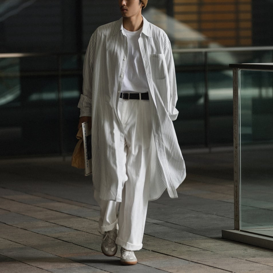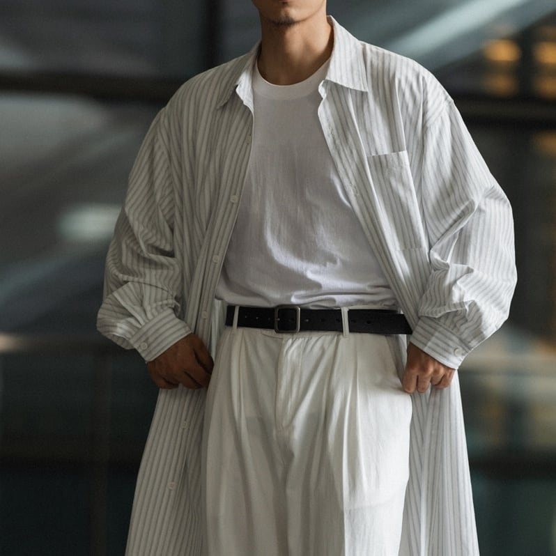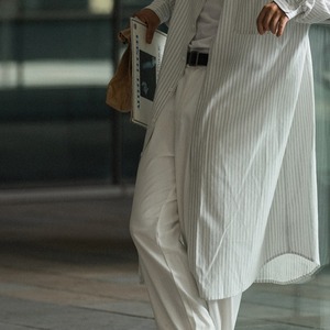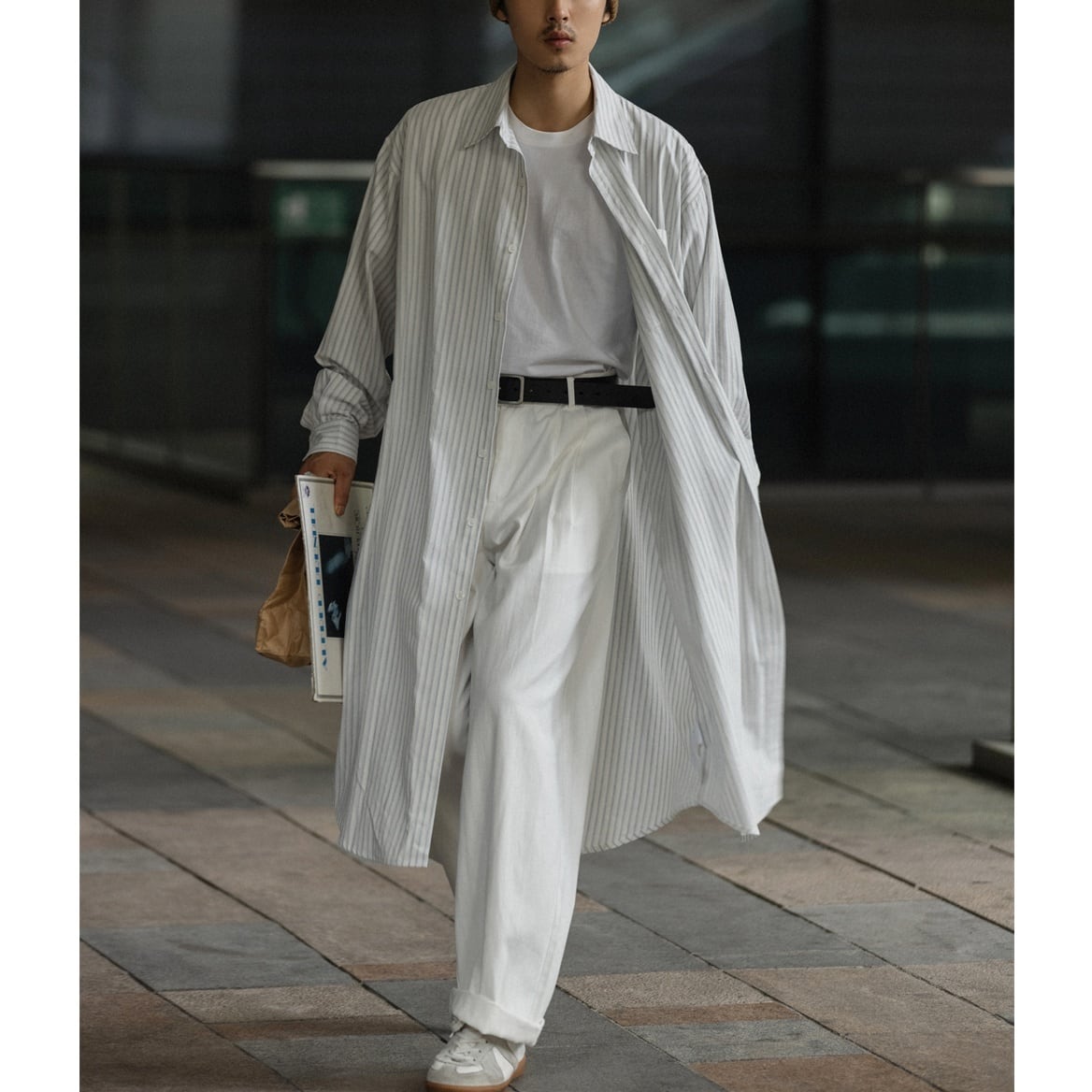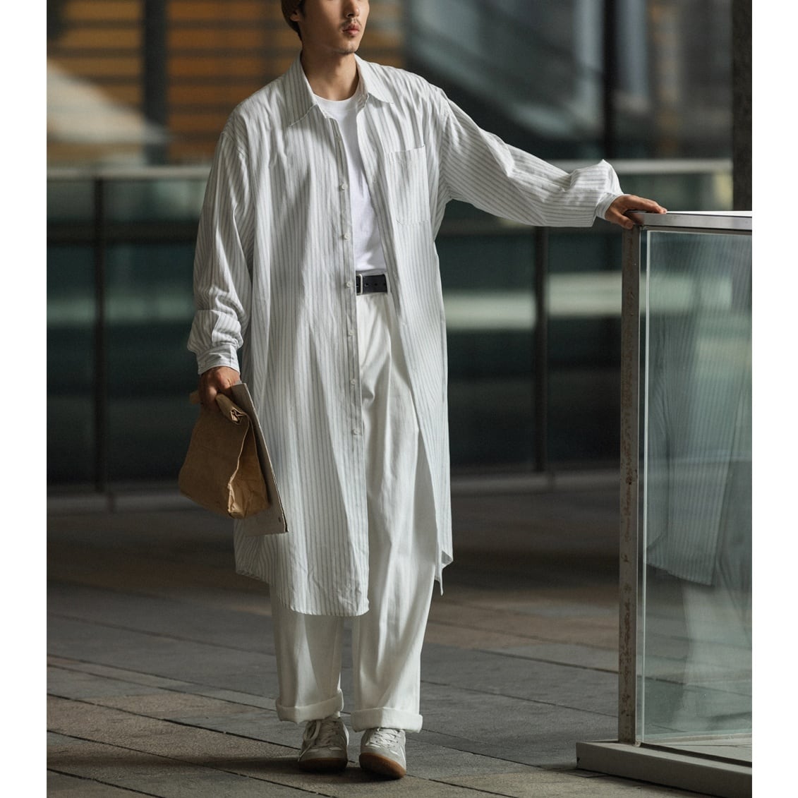 クリーンなストライプ柄のロングシャツ。 コートくらいの着丈に設定する事でスタイリングの主役となるアイテムです。 一枚着としてはもちろん、アウターやカーディガンのインナーとしてもオススメです。 ■ color ホワイト ■ material コットン ■ size S / M / L / XL S :肩幅54cm 袖丈60cm 胸囲138cm 着丈108cm M :肩幅55cm 袖丈61cm 胸囲142cm 着丈111cm L :肩幅56cm 袖丈62cm 胸囲146cm 着丈113cm XL :肩幅57cm 袖丈63cm 胸囲150cm 着丈115cm ※採寸方法により多少の誤差がある場合がございます ■モデル身長:178cm ■着用サイズ : XL [ 商品管理番号:a-0667] 【お買い物にあたっての注意事項】ご購入前にこちらをご覧ください。 https://store.path-online.shop/about ▶<PATH>TOP PAGEから、新商品やお得な情報をチェック! https://store.path-online.shop/ ▶【Instagram】公式インスタグラムページはこちら。 https://www.instagram.com/path_official_jp/