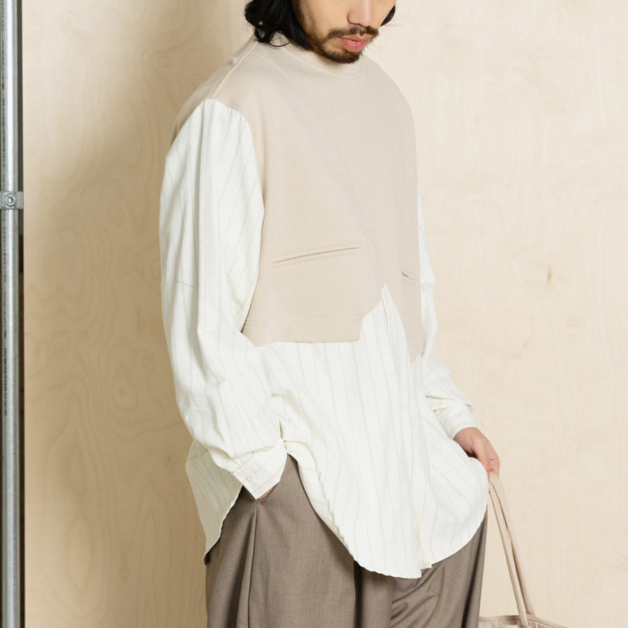 ストライプシャツにショート丈のスウェットベストを合わせた様なデザイン。 合わせやすさも考えられた程よいデザイン性で、一枚で雰囲気のあるスタイリングが完成する一着に仕上がっています。 シンプルなワイドシルエットパンツとのスタイリングがオススメです。 ■ color ネイビー ベージュホワイト ■ material ベスト部分:コットン / ポリエステル シャツ部分:コットン ■ size S / M / L / XL S :肩幅53cm 袖丈59cm 胸囲126cm 着丈81cm M :肩幅55cm 袖丈60cm 胸囲130cm 着丈83cm L :肩幅57cm 袖丈61cm 胸囲134cm 着丈85cm XL :肩幅59cm 袖丈62cm 胸囲138cm 着丈87cm ※採寸方法により多少の誤差がある場合がございます ■モデル身長:178cm ■着用サイズ : XL [ 商品管理番号:a-1054] 【お買い物にあたっての注意事項】 ご購入前にこちらをご覧ください。 https://store.path-online.shop/about ▶<PATH>TOP PAGEから、新商品やお得な情報をチェック! https://store.path-online.shop/ ▶【Instagram】公式インスタグラムページはこちら。 https://www.instagram.com/path_official_jp/
